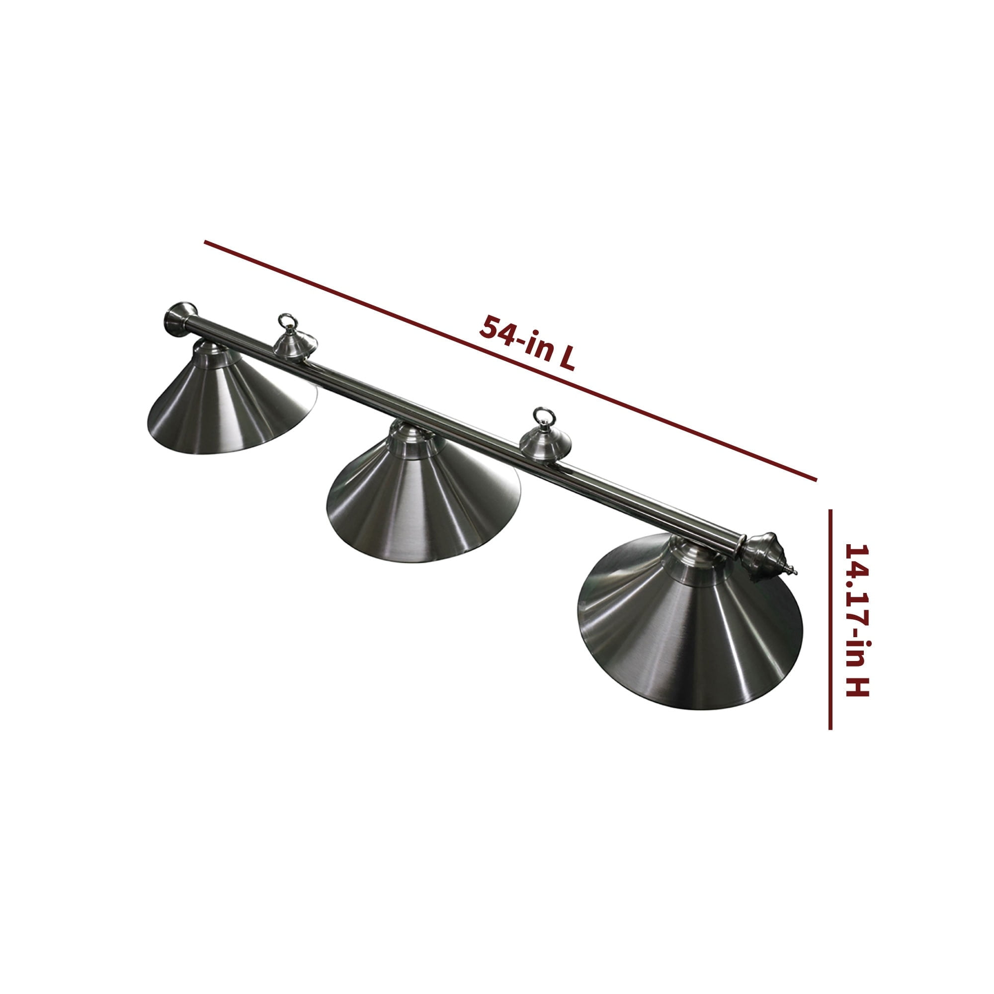This stylish billiard light will hang beautifully above any pool table and is easy to install. Featuring a sleek metal bar and shades finished in a beautiful soft-brushed stainless steel, this light is guaranteed to add the final touch to your dream game room. Fits over any size billiard table. 180-day limited warranty. THREE METAL SHADES – A high-gloss white painted interior on each of the three shades allows for better illumination and light diffusion. The soft-brushed stainless-steel finish will look good in any game room, man cave, or bar. EASY TO ADJUST – This billiard light comes with two hanging chains for installation. They can be adjusted so the hanging height will be just right over your pool table. Mounting hardware and instructions included. PRE-WIRED FOR INSTALLATION – For your safety, it is important to note that this light does not have a plug-in connection. It is designed for direct electrical wiring only. Please hire a licensed electrician for installation. DIMENSIONS – Overall dimensions are 54-in L x 14.2-in W x 13.5-in H 180-DAY WARRANTY – The manufacturer warrants this pool table light to be free from defects in workmanship and materials, under normal residential use and conditions, for a period of 180 days.