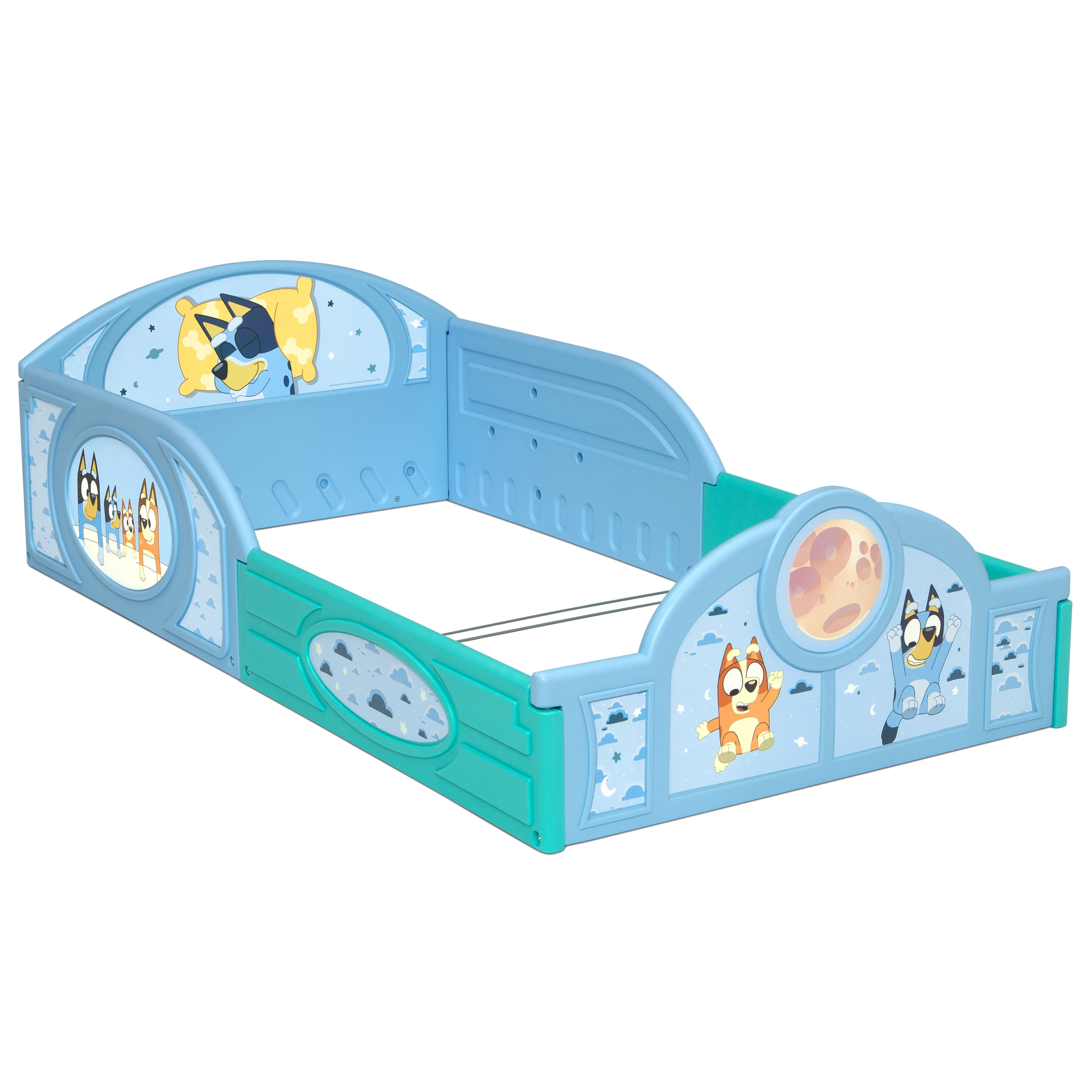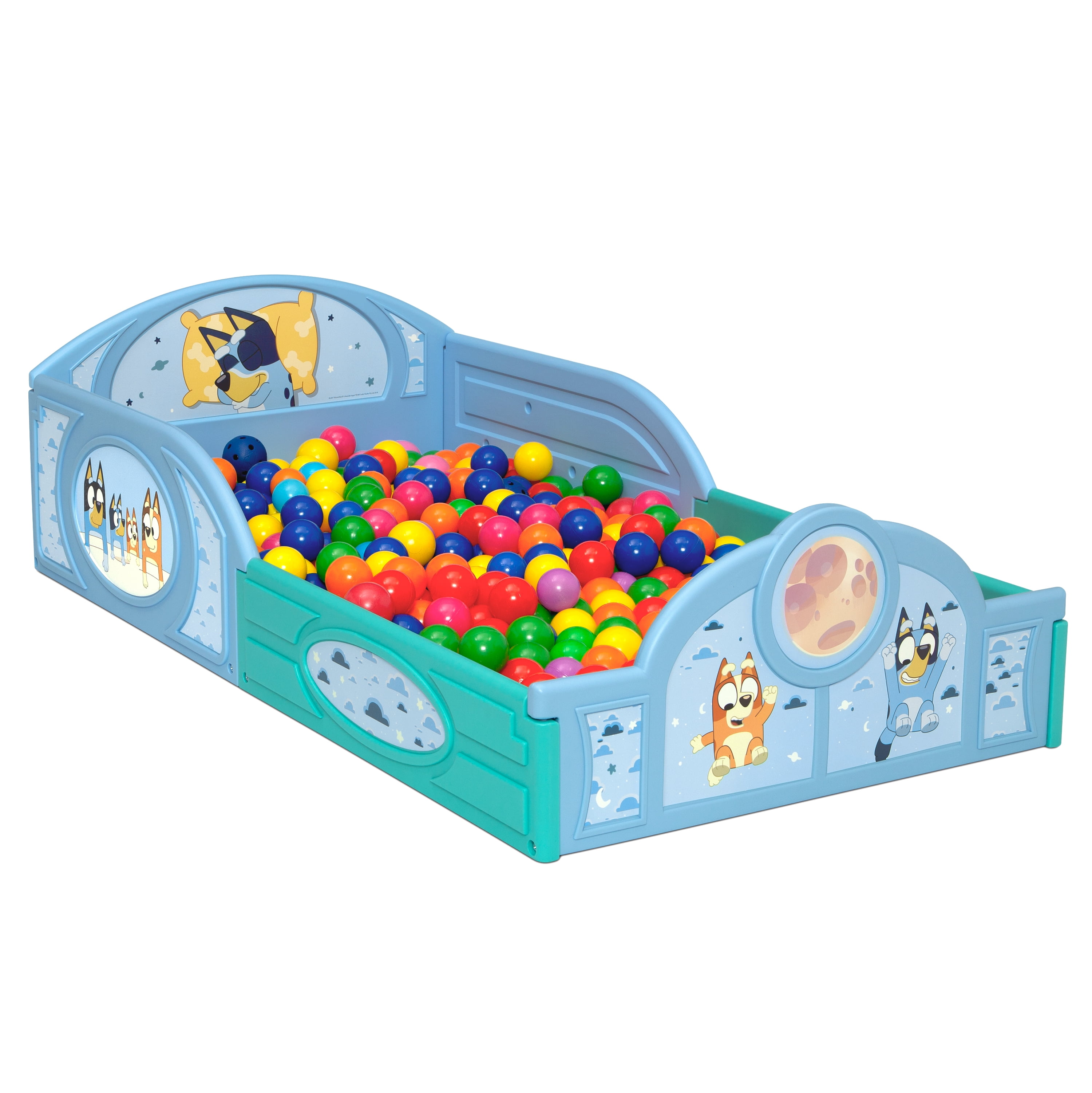 RECOMMENDED AGE: 15 months+ DURABLE PLASTIC CONSTRUCTION: Made from durable, molded plastic with built in toddler guardrails to keep your child secure FOR BLUEY FANS: Colorful decals of Bluey decorate the headboard and footboard | 3D detailing | Makes it fun and easy for your little one to transition from crib to toddler bed SO MANY USES: The versatile frame of the Sleep and Play Toddler Bed can be used as a bed, play enclosure, ball pit and much more | Play balls are not included and are sold separately SAFE DESIGN: The mattress is designed to sit low in the bed frame for your child’s safety and ease (mattress sold separately) | JPMA certified to meet or exceed all safety standards set by the CPSC & ASTM | Size: Assembled Dimensions: 29.5”W x 54.5”D x 17”H