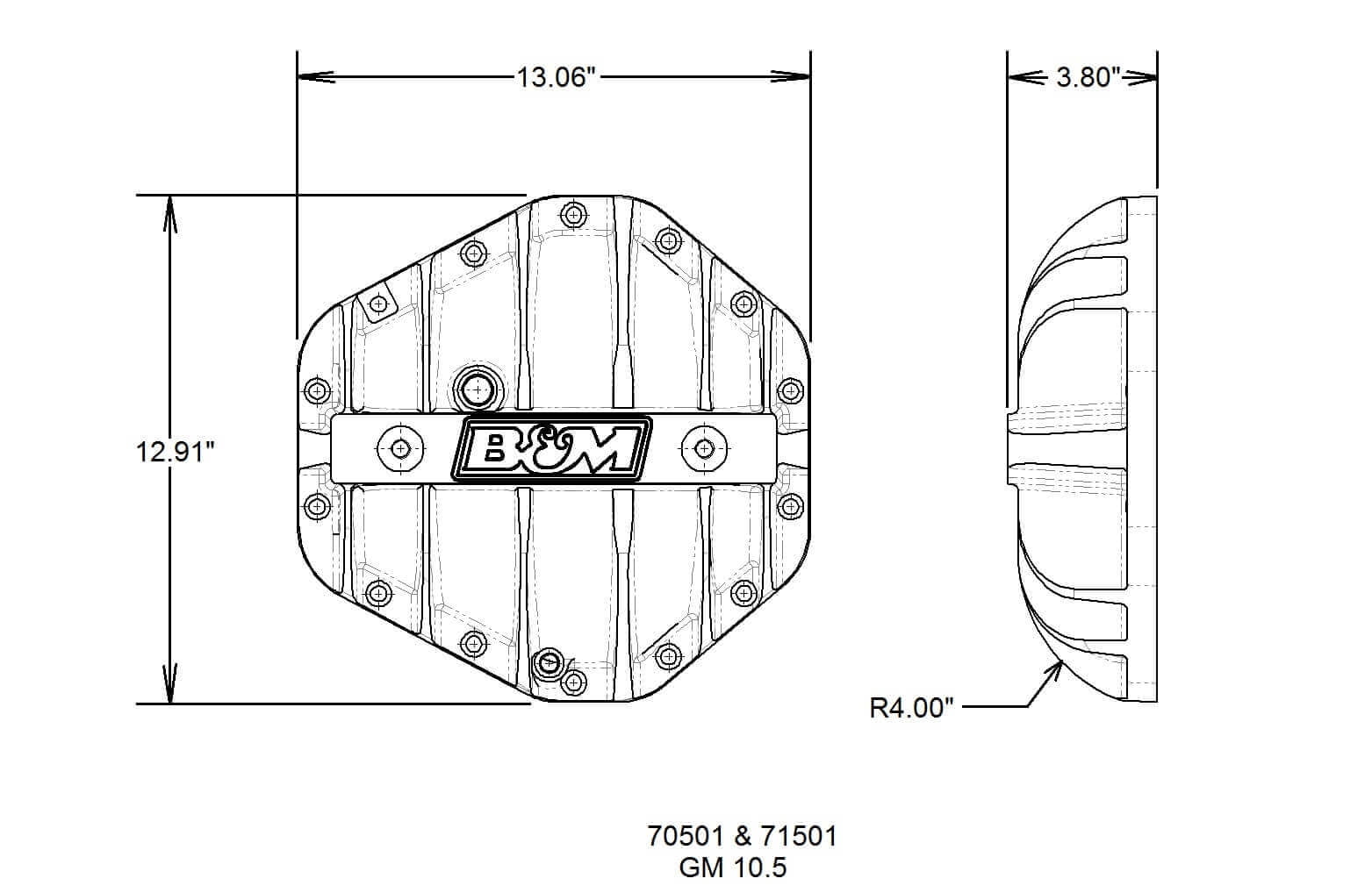 B&M Cast Aluminum Differential Covers are designed to strengthen the differential by preventing case distortion and ring gear & bearing cap deflection. Constructed of A356.0-T6 aluminum, these rugged covers significantly increase the fluid capacity and dissipate heat much faster than the stock factory unit to prolong the life of your ring and pinion gears. Additional features include an engraved B&M logo, drain and fill port locations, a magnetic drain plug for catching ferrous metal particles, and complete hardware and installation instructions.