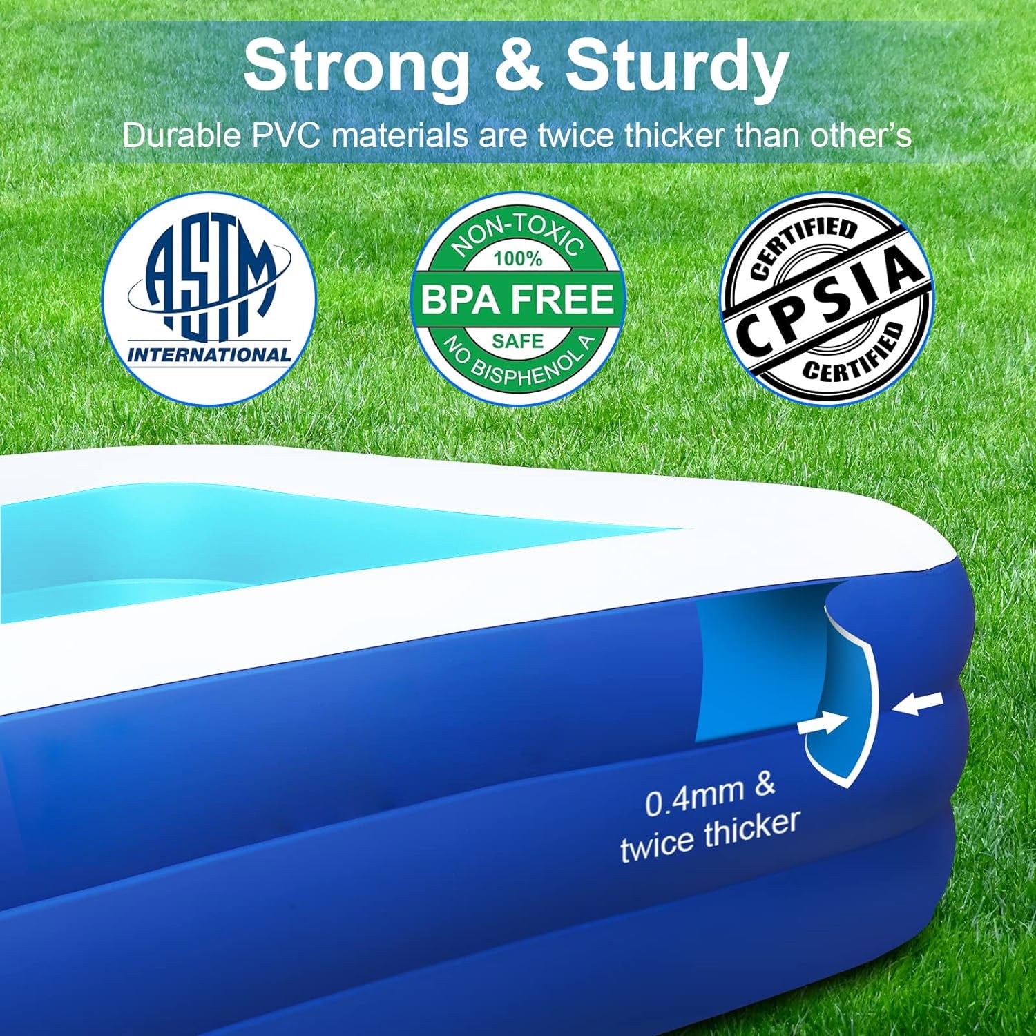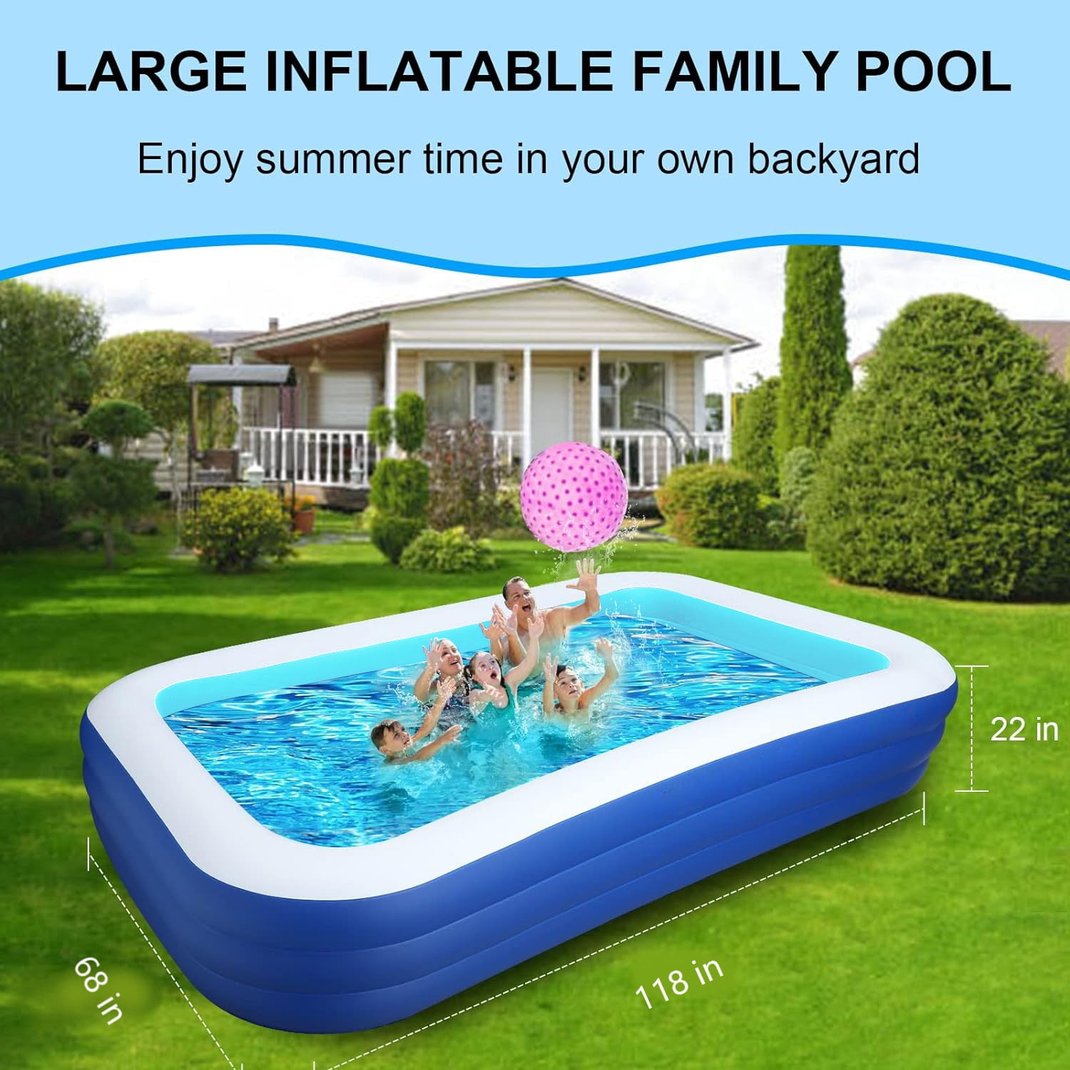 【Family-size Inflatable Pool】With 118″ X 68″ X 22″ size,SELLOTZ swimming pool with 312 gal water capacity can hold up to 2 adults plus 3-5 kids(Age 3+) to enjoy a splashing pool party in the backyard.This inflatable pool would be a great entertainment for your kids, pet dogs and family. 【Safe & Durable Retangular Inflatable Pool】BN-LINK swimming pool for kids is made with Phthalate and lead free, Using BPA-free materials that meets the standards of international children’s toys, which is twice thicker than most in the market, reducing the risk of punctures and ensuring a long service life. 【Quick and Easy to Use】The family inflatable pool is easy to set up, you just need to simply spread out on the ground level.The inflatable pool can be inflated in 3-4 minutes by electric pump (not included). 【Sturdy &Stable Pools for Backyard】Comes with 3 individual air chamber each, the swimming pool for adults can withstand extra weight while preventing air leakage. Drain of inflatable swimming pool can facilitate the outflow of water, tidying inflatable pool up is no longer an issue. 【Great Gift,Swimming Pool and Ball Pit】BN-LINK inflatable pool is a great gift for your kids, families, pet dogs and friends. They could not only enjoy the hot summer day time with our inflatable pool in the backyard,but also it would be used as the ball pit indoor when the weather is cool. Specifications: 1.Color: Blue 2.Weight: 13.2 lb 3.Material: PVC