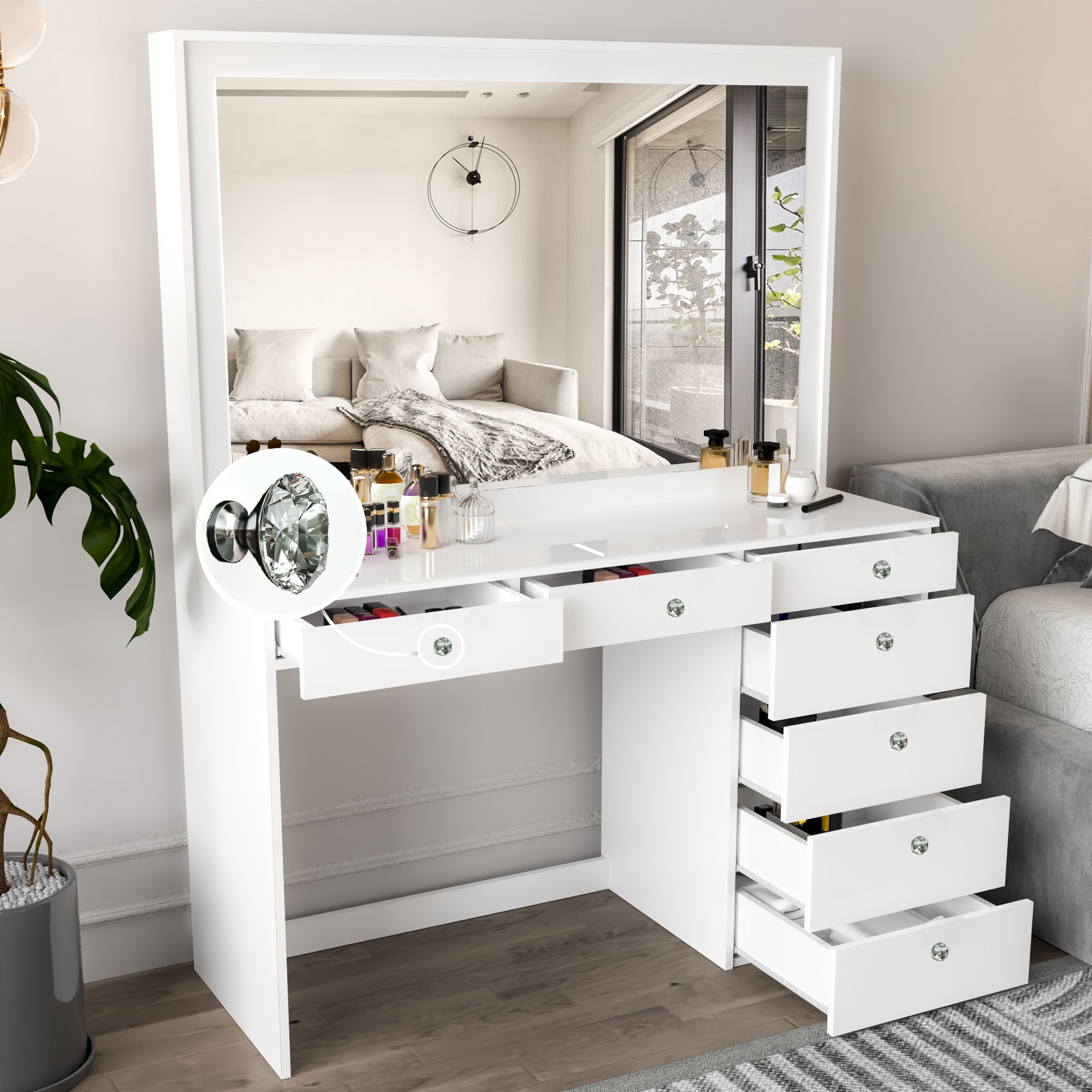 Hollywood Mirror : The Vanity Dresser for bedroom with mirror features a beautiful and wide Hollywood vanity mirror (38″ W x 23″ H) that offers a full view so you can make sure you look great. Plenty of Storage Capacity: This vanity with drawers offers you 07 drawers to easily organize all your makeup essentials and jewelry. On the large top surface, there is still more than enough space on the table to place souvenirs or your laptop. Knobs: This makeup vanity also features customized knobs, adding a touch of elegance and luxury to the design, making it the perfect addition to any modern bedroom. The customized design allows for a unique and personalized look. Sturdy Frame: The makeup desk features a dedicated design to provide high stability and ensure years of use, solid and sturdy enough to support your needs in one place. In addition, the white vanity color of this masterpiece makes the Joan makeup table a must-have for any makeup artist. Customer Support until 100% satisfactory experience: We will provide professional customer service to every customer before and after purchase. If you have any problems, please feel free to contact us by e-mail or phone call, we will reply within 24 hours and give you a satisfactory solution.