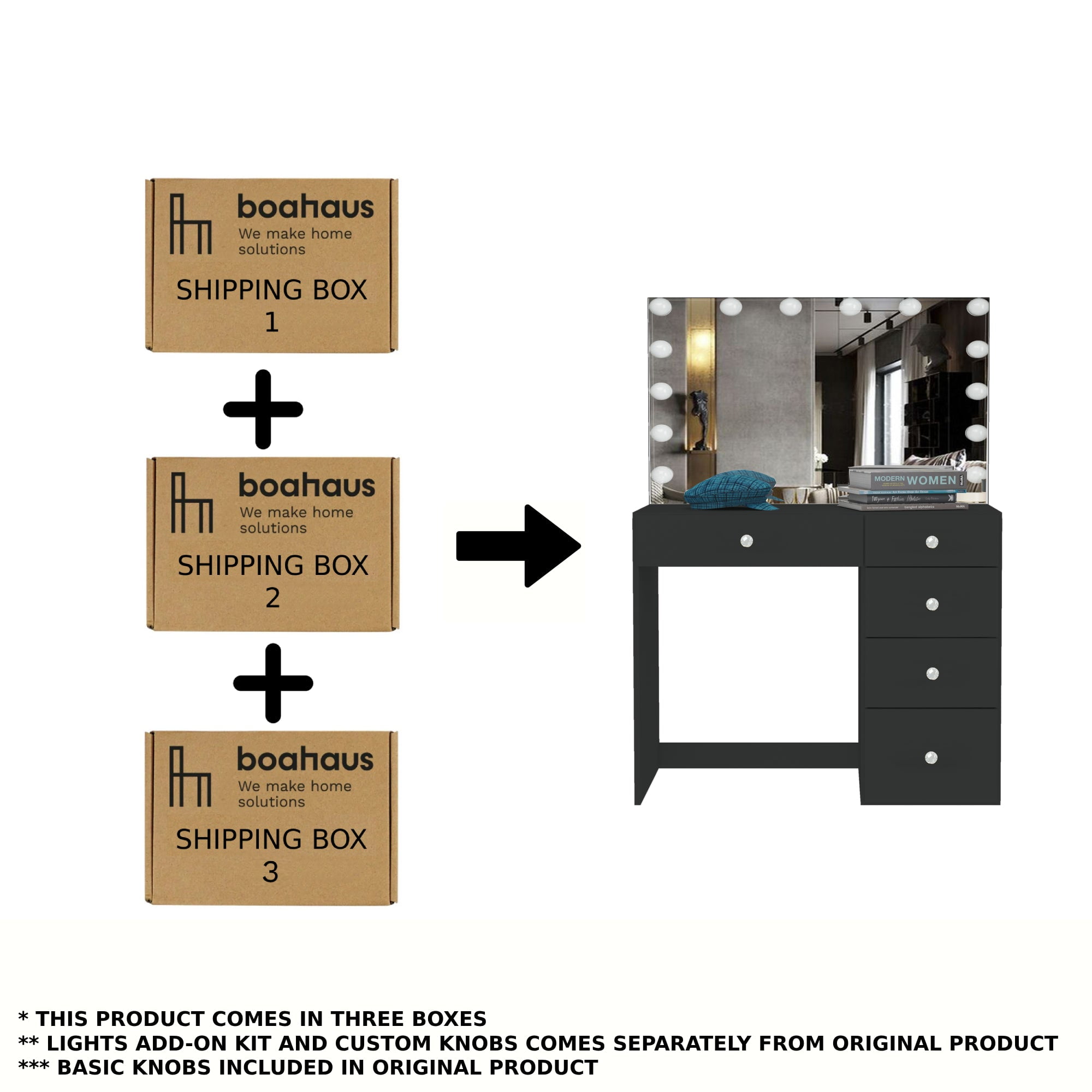 Introducing the Boahaus Saranya Black Vanity Desk with Mirror and Lights, the perfect blend of style, functionality, and flair. This striking vanity desk is a must-have for every woman or makeup artist who values elegance and convenience. Crafted thoughtfully, it is a sophisticated makeup table that comes with a large mirror and Hollywood lights add-on, creating a flawless makeup environment for you. The black finish enhances the desk’s charm while providing a clean, fresh look. This dressing table with mirror is not just a piece of furniture but a statement of style. It features five spacious drawers, providing ample space for your beauty products, makeup, and accessories. The drawers ensure a clutter-free makeup table while allowing you to organize your essentials efficiently. The vanity desk with drawers is small enough to fit into any bedroom but spacious enough to hold all your makeup essentials. It is a makeup vanity that can effortlessly transform any room into a glamorous dressing area. This vanity desk with mirror and lights is the ideal makeup table for women who love to make a style statement. And it’s not just about the look; the vanity with lights offers comfort and functionality. In conclusion, the Boahaus Vanity Desk is more than a piece of furniture; it’s your personal styling station. It’s time to add a touch of elegance to your makeup routine with this vanity mirror with lights and table set with drawers. Don’t wait, transform your bedroom into a glamorous dressing room today!