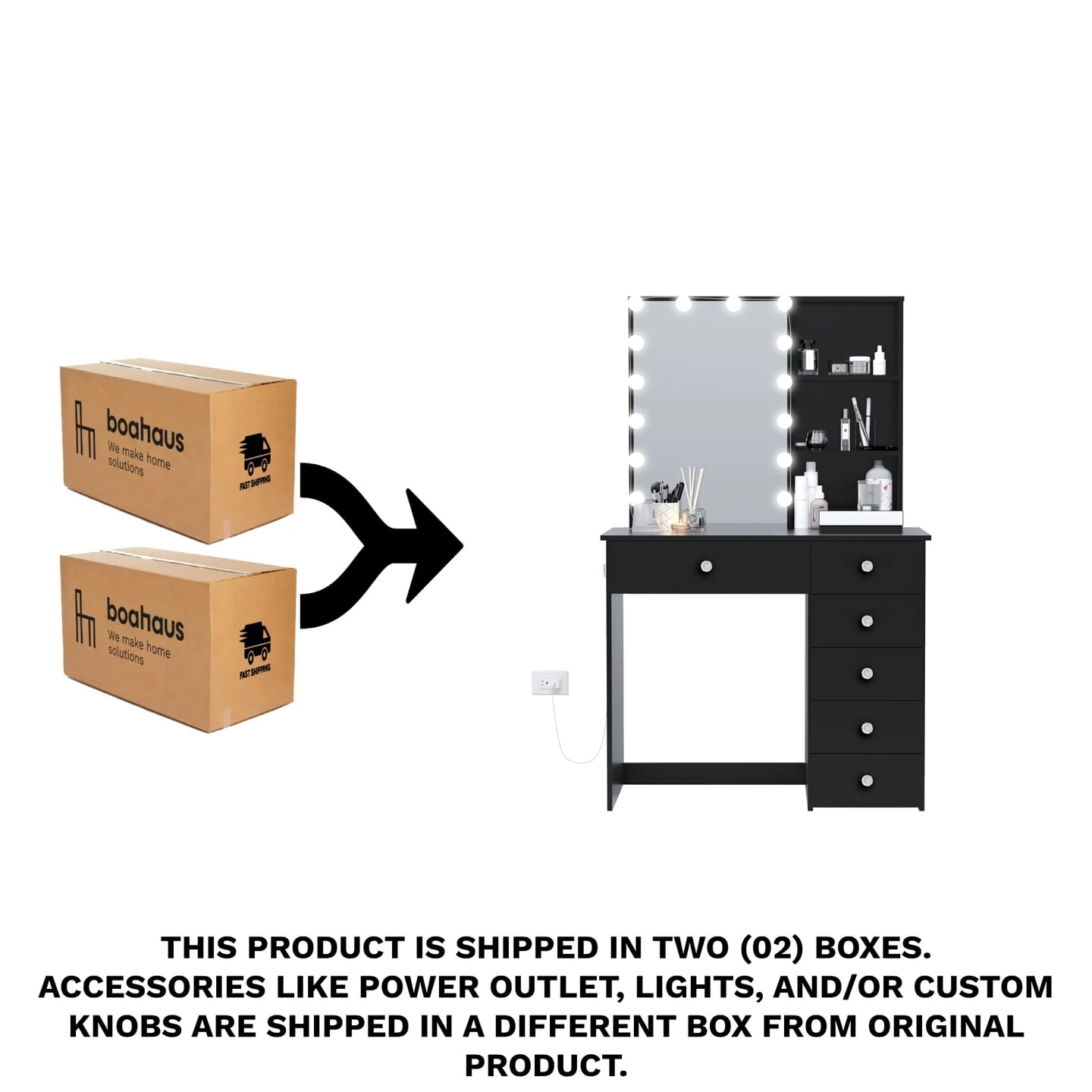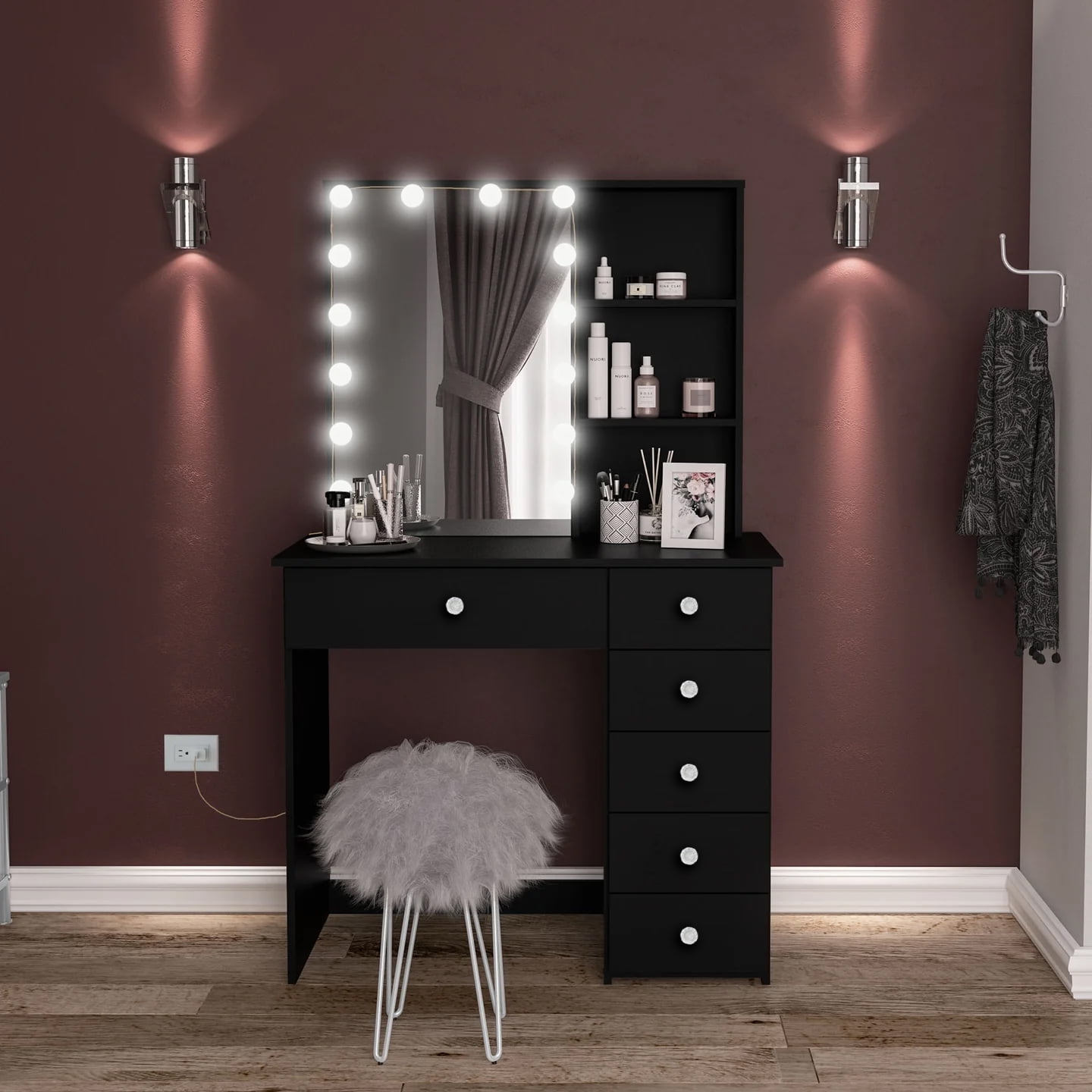 Boahaus Spes Modern Black Painted Makeup Vanity Table for Bedroom with Light Bulb Mirror