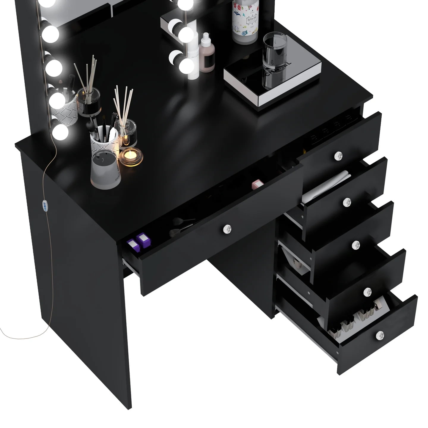 ✨ Six Spacious Drawers: Organize your makeup, skincare products, and accessories with ease using six spacious drawers. Keep your beauty essentials neatly stored and within easy reach, eliminating countertop clutter. ???? Add-On Lights: Achieve flawless makeup looks with the customizable add-on lights, providing optimal brightness for precision and clarity during application. The well-lit mirror ensures a clear and detailed view of your face, enhancing your beauty routine. ???? HD Mirror: Enjoy professional-quality reflection with the high-definition mirror. The crystal-clear view allows for precise makeup application, ensuring every detail is perfect. ???? Elegant and Versatile Design: The sleek and modern design complements any decor, adding a touch of sophistication to your bedroom or dressing area. The Vanity Desk enhances the ambiance of your space while providing functionality.