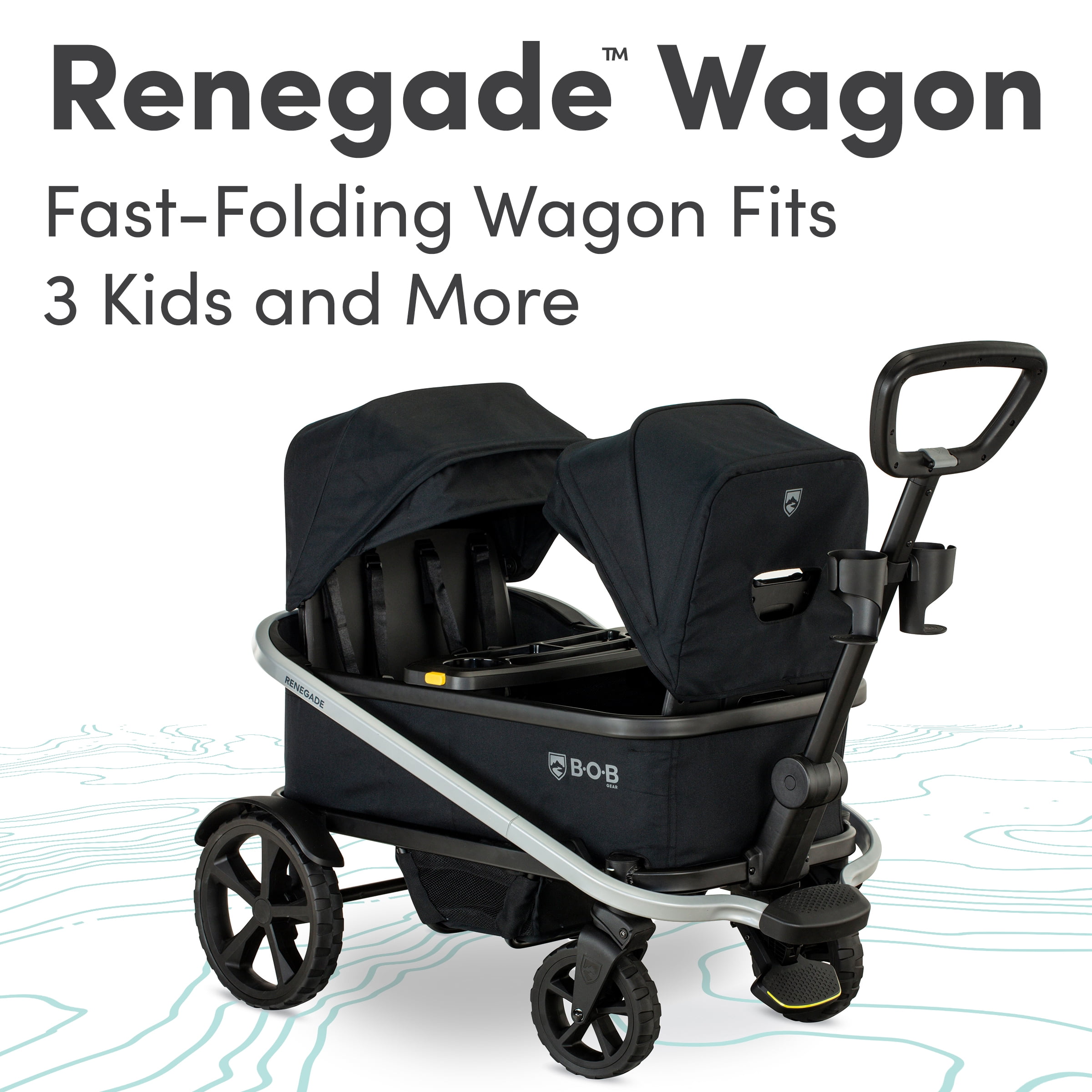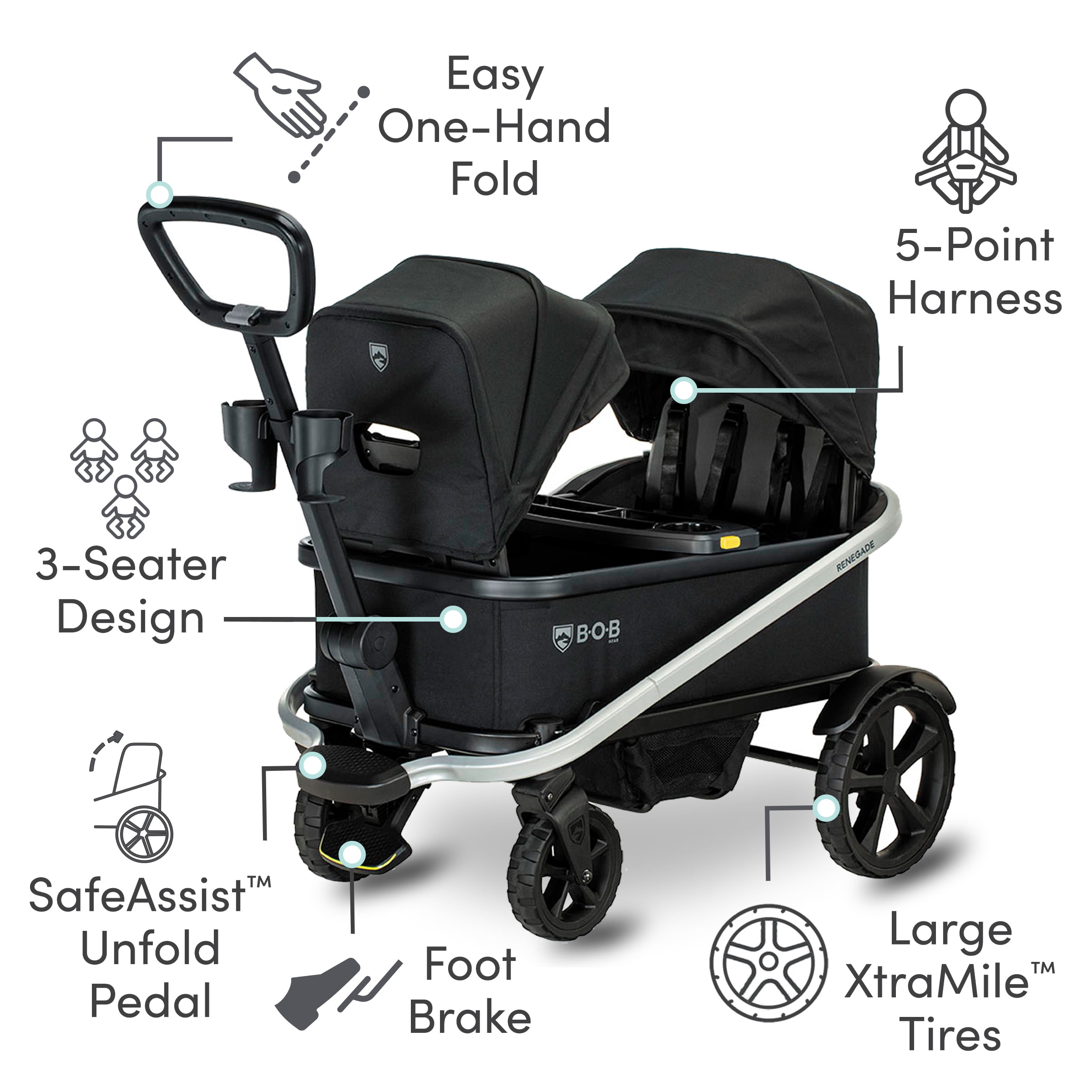 THREE-SEATER DESIGN: The BOB Gear Renegade Canopy Stroller Wagon has two canopies and a roomy interior with enough space for up to three kids ALL-TERRAIN TIRES: The Renegade all terrain wagon features large XtraMile tires and SmoothShox suspension for a comfortable ride from road to trail ONE-HAND OPEN AND CLOSE: SafeAssist design lets you quickly open and close this foldable wagon with one hand and three easy steps PUSH-AND-PULL HANDLE: The Renegade is a pull and push wagon for kids with a SteerSteady handle for easy cruising REFRESHMENTS WITHIN REACH: This rugged kids stroller wagon comes with a child snack tray, two adult cup holders, and side mesh pockets ONE-STEP FOOT BRAKE: Stop at a moment’s notice for snack time or playtime thanks to the durable one-step foot brake 5-POINT HARNESSES: The Renegade toddler wagon stroller has a welded aluminum frame and 5-point harness at every seat to keep your tiny passengers safe SAFETY THAT GOES BEYOND: Beyond meeting ASTM requirements, Renegade Wagon goes through additional performance testing EASY TO CLEAN: This foldable wagon for kids is made with soft polyester fabric that can be easily spot cleaned in between adventures