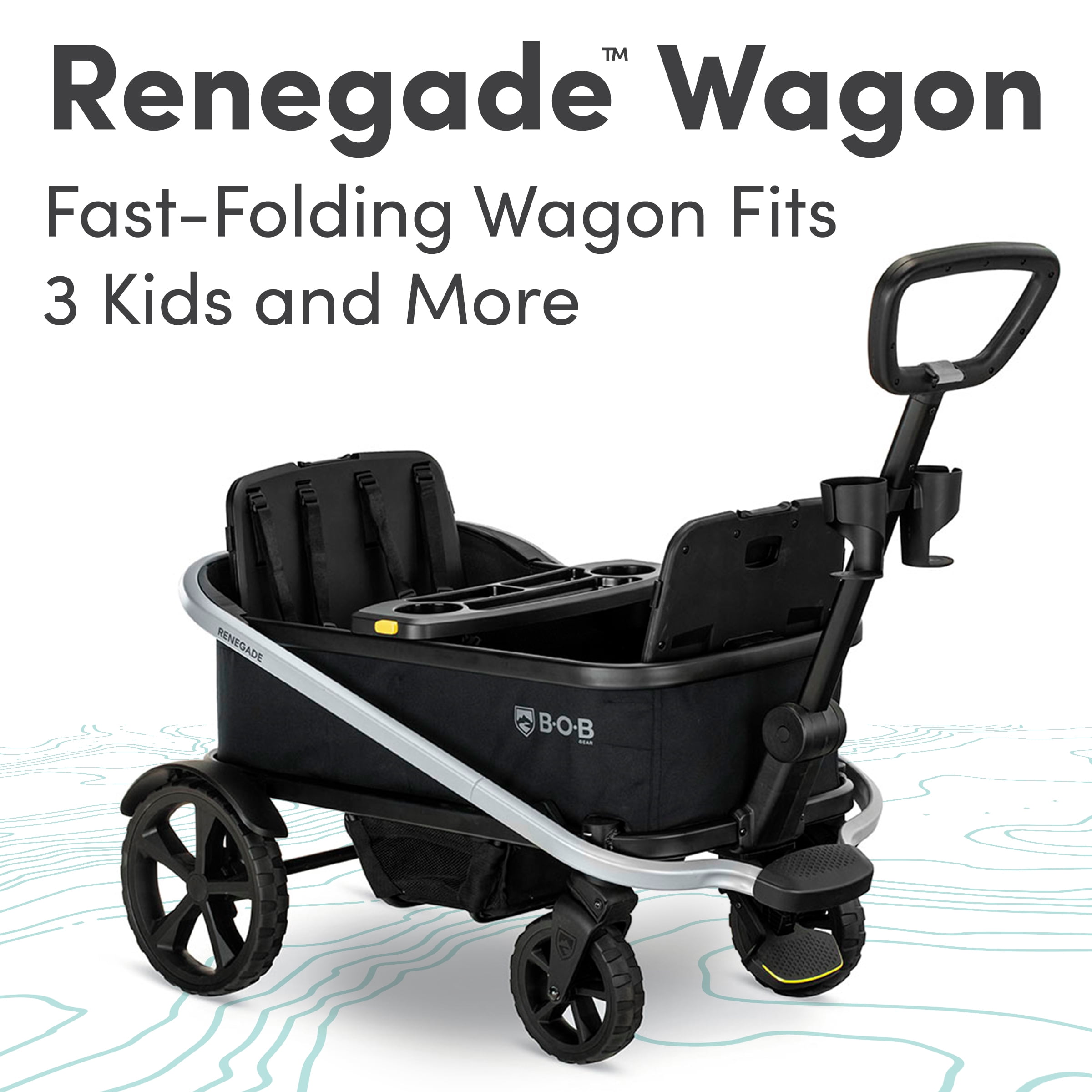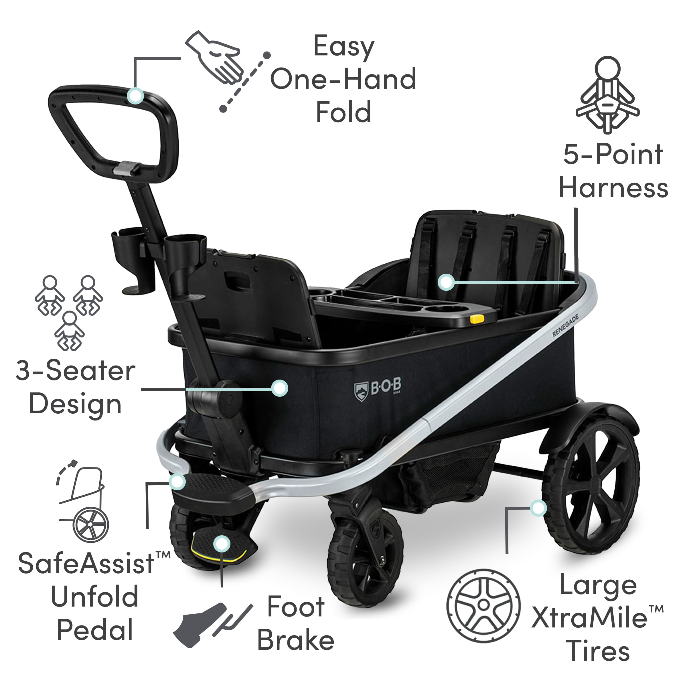 BOB Gear Renegade Foldable Stroller Wagon with Child Snack Tray and Cup Holders, Nightfall Three-seater design accommodates up to three kids All-terrain tires with large XtraMile tires and SmoothShox suspension for a comfortable ride One-hand open and close feature with SafeAssist design for quick folding Push-and-pull handle with SteerSteady technology for easy maneuverability Includes a child snack tray, two adult cup holders, and side mesh pockets for convenience Durable one-step foot brake for quick stops 5-point harnesses at every seat for enhanced safety Welded aluminum frame for added durability Meets ASTM requirements and undergoes additional performance testing Easy to clean with soft polyester fabric that can be spot cleaned