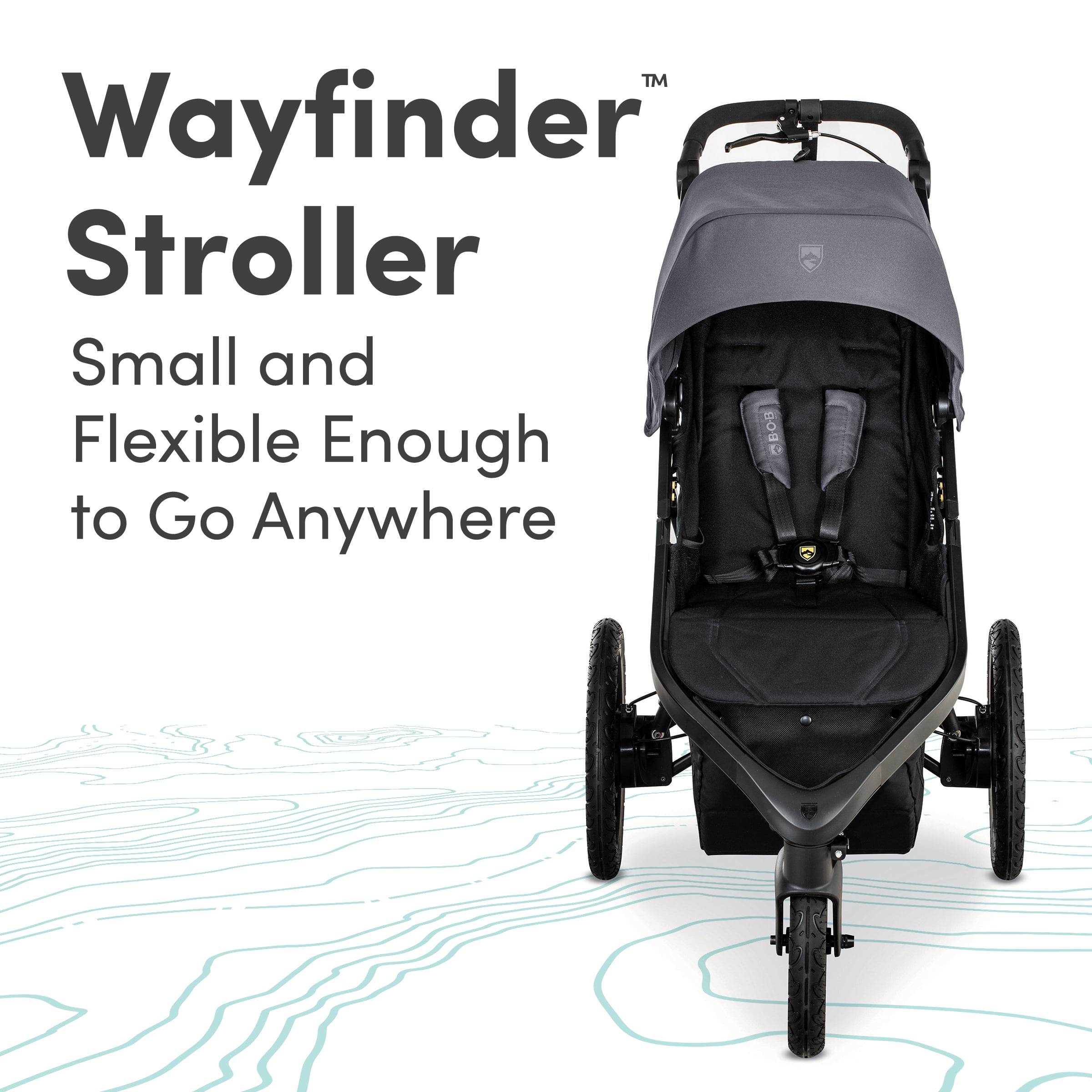 CRUISING STREETS OR CRUSHING MILES: The BOB Gear Wayfinder Jogging Stroller pairs a slim, sleek design with high-performance jogging features MOVE SMOOTH, RIDE STEADY: This portable stroller boasts independent dual suspension and air-filled tires for a smooth ride on sidewalks and roads SWITCH MODES: The front wheel of the Wayfinder jogger stroller swivels for easy steering on walks and locks into place when you’re ready to run DOWNHILL CONTROL: Use the wrist strap and hand brake for more control when going downhill, and find the perfect height with the adjustable handle 5-POINT HARNESS: The padded seat lets your little one sit fully upright or recline, and the 5-point harness helps ensure they’re safe and secure SMALL ENOUGH TO GO ANYWHERE: This stroller folds up to 30% smaller than top competitors* compared to the 2021 Thule Urban Glide 2 and Uppababy Ridge EASY TO STORE: The removable canopy and XL zip-top cargo basket make this foldable stroller even easier to store in small places and tight spaces EASY TO CLEAN: The Wayfinder features sporty polyester fabric that can be easily spot cleaned in between outings MAXIMUM COMFORT: With a weight capacity of 75 pounds, it’s the only baby stroller you’ll ever need
