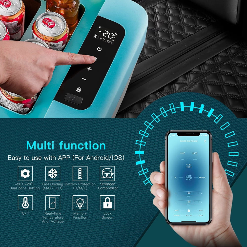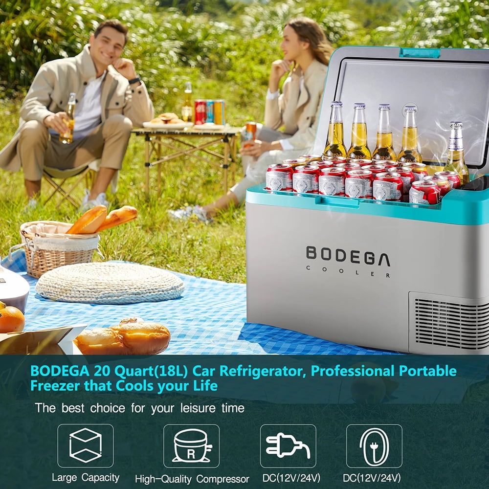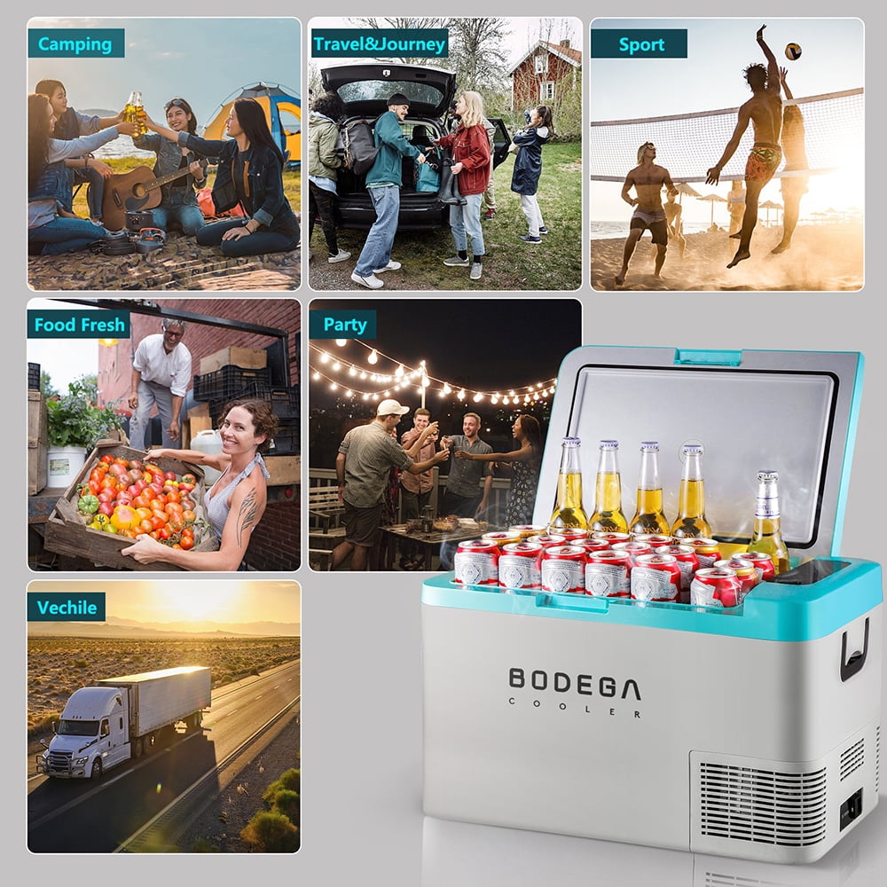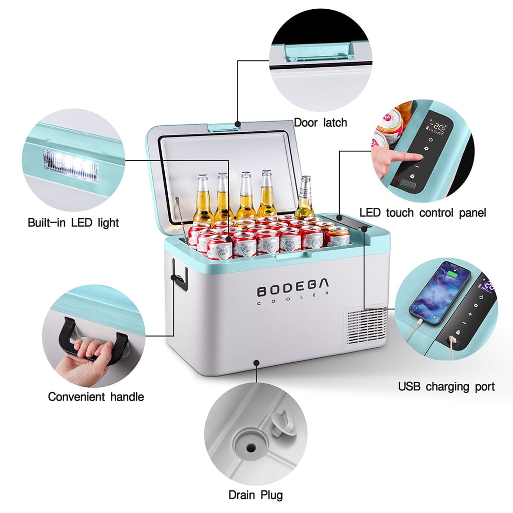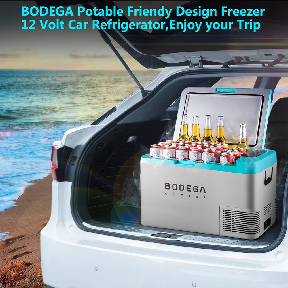 BODEGA BLUE CAR FRIDGE Support App(For Android/ISO) or manual control Can hold 44 cans cola(355ml),22 bottles water(500ml) and 16 bottles red wine(750ml),with a large capacity. Good in Anti-Shaking although your car climbing ar an inclination angle of 30 degrees,the car portable car freezer can still run stably. Built-in LED light design let you easily to get things as night ENERGY SAVING& POWERFUL — BODEGACOOELR car fridge 12v has protect system for different level H/M/L .The system can correspond to different startup voltage and shutdown voltage respectively.Strong compressor can make the empty portable refrigerator temperature’s to 32℉(0℃)by max mode.RV refrigerator design of wireless keep items very cool when you turn off the power during your journey.If you need to store more frozen foods,we recommend you pre-cool the fridge before traveling.