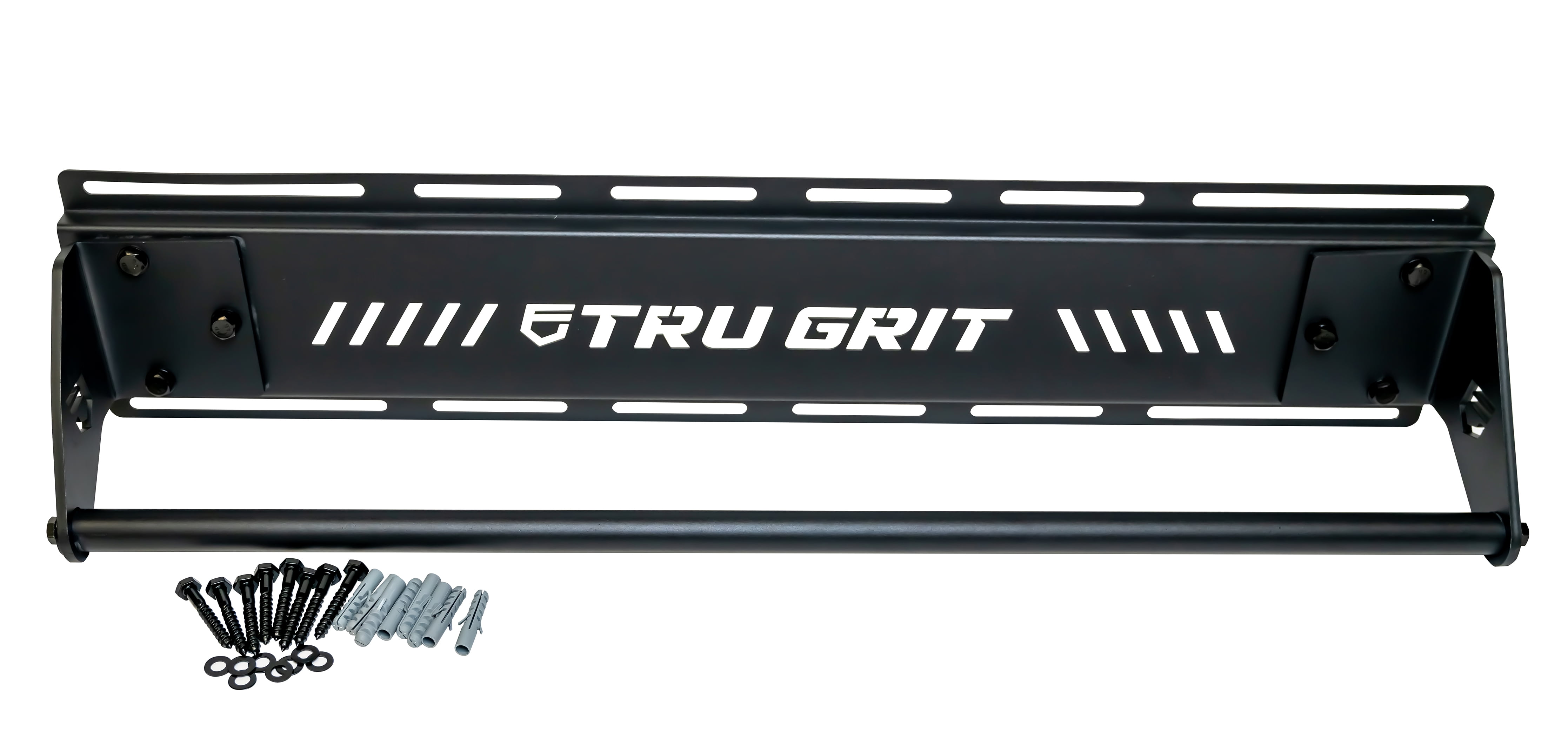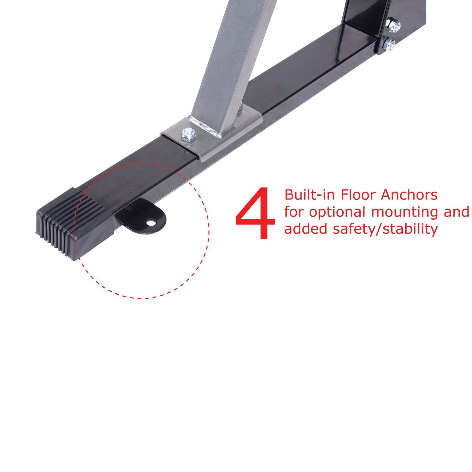 Complete your home gym with this multi-purpose power rack system with 2 integrated Olympic weight plate holders Use the overhead bar for upper body workouts like pull-ups, max bar hands, or attach TRX straps (not included) Pair with a weight bench (not included) and 6 or 7-foot bars (not included) for lifts like bench press or chest-presses With 2 pairs of adjustable tiered hook-catches with 300-pound load capacity, this frame is also perfect for squats 4 built-in floor anchors with skid-proof rubberized feet provide safe stability Number of position settings: 12 Weight capacity: 300 pounds Color: Black Manufacturer warranty: 1-year warranty