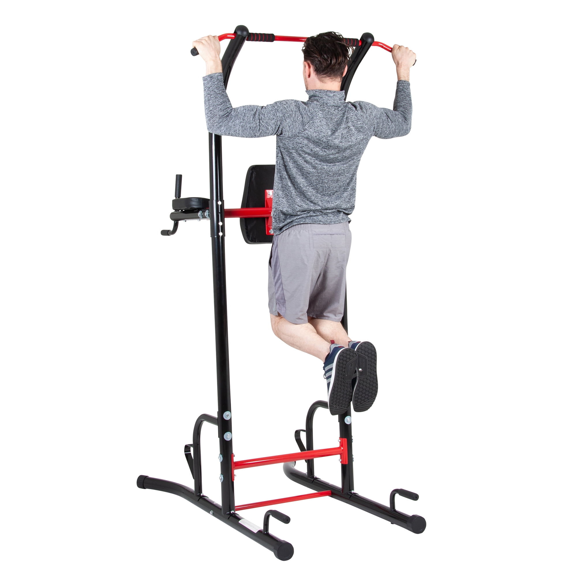 Body Champ 5-Station PT1180 Power Tower with Pull Up Station, Dip Bars, Push Up Bars, Vertical Knee Raise for Ab Workouts: 2 sided Front and Back Workout Machine for full body weight resistance training with multiple Workout Stations. Maximum weight limit is 250 lbs. Vertical knee raise station for leg and knee raises with thick padded back and arm support cushions. Lat/pull up bar builds powerful shoulders, arms, and back. Push up bars to help you build strong chest muscles and tone your arms with built in handles. Dip station develops your triceps as you increase upper body strength. Wide frame base for enhanced stability with built in supports that serve as ploy box step up assistance. This standing power tower was designed with an H-frame base for enhanced stability so the user can perform exercises on either side. It also has 2 arched stability bars to make the steel frame sturdy. It measures 56 in x 42 in x 85.8 in. The Body Champ PT1180 Power Tower is perfect for use in a home gym, even if you have limited space.