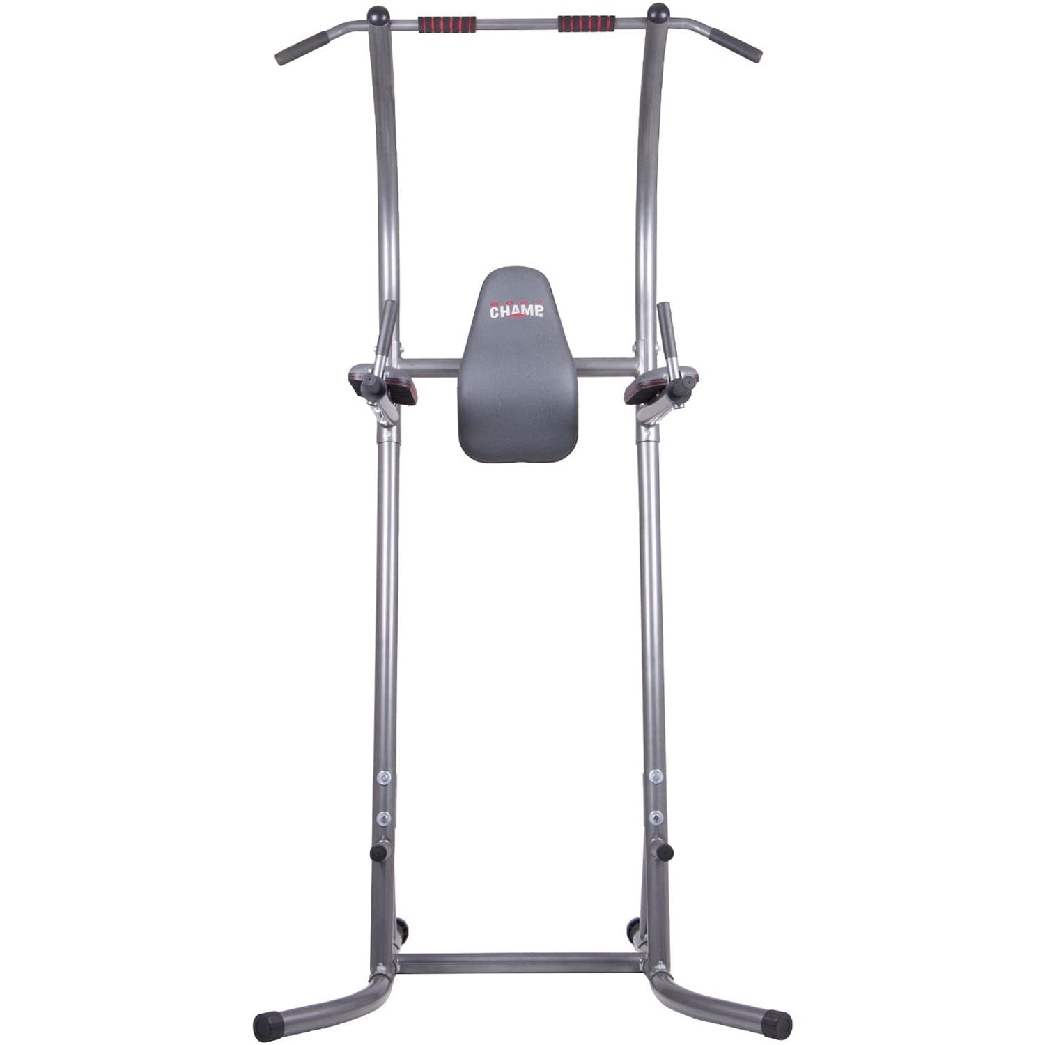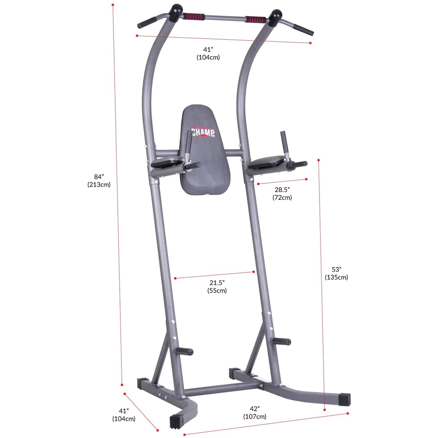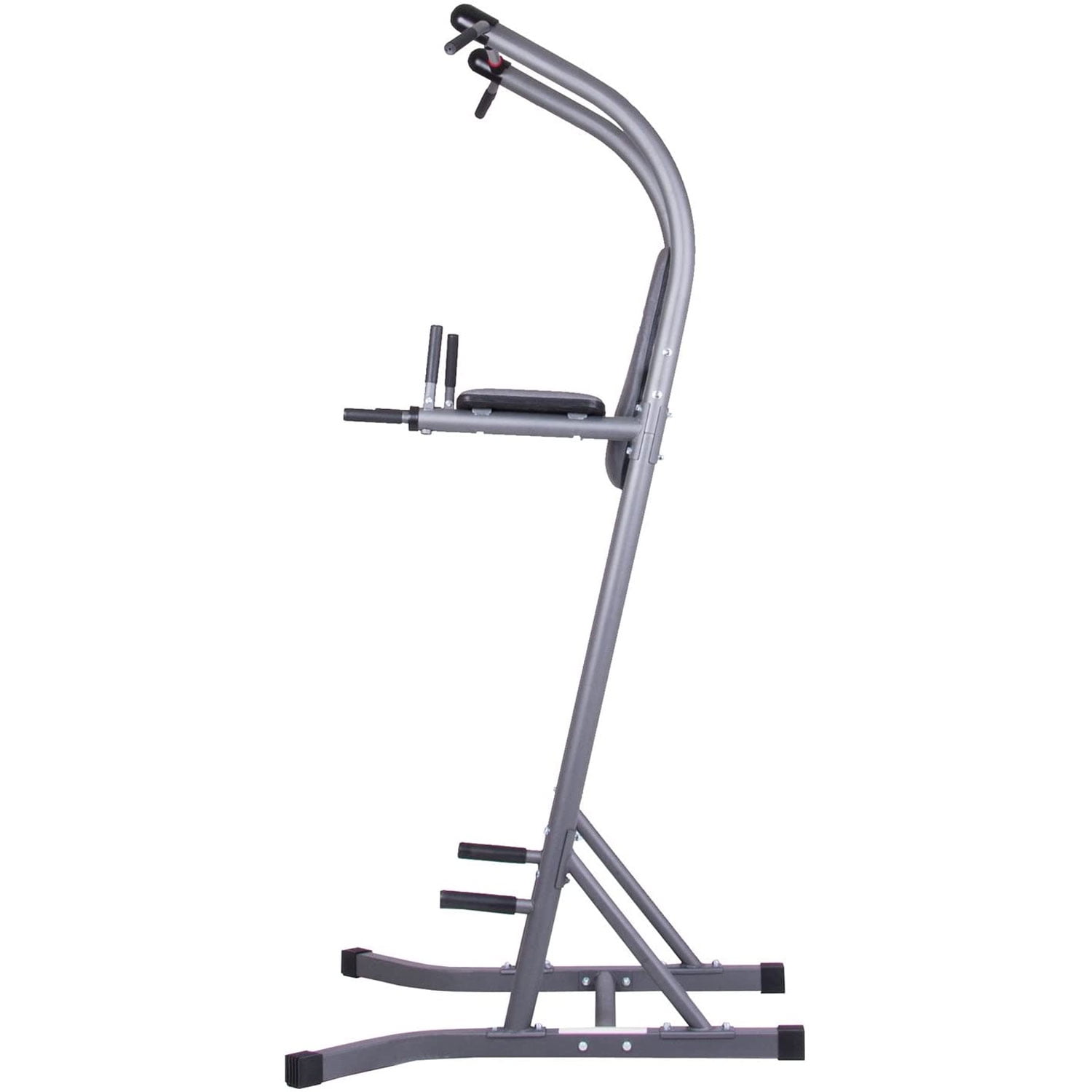 Multi-functional power tower with 5 exercise stations for versatile strength circuits in your home gym Exercise stations include pull-ups, chin-ups, vertical knee raises, dips, and push-ups Ergonomic design features a padded backrest, forearm pads, and hand foam grips to keep you comfortable and supported while you work out Anatomically-angled forearm pads help reduce stress on shoulders and rotator cuffs Dip handles are able to be folded down for clear and free chin-up space Sturdy construction and step-up pegs help you stay stable and secure during your training circuits Color: Gray Dimensions (L x W x H): 41.5 x 42.5 x 84.6 inches Weight: 59.2 pounds