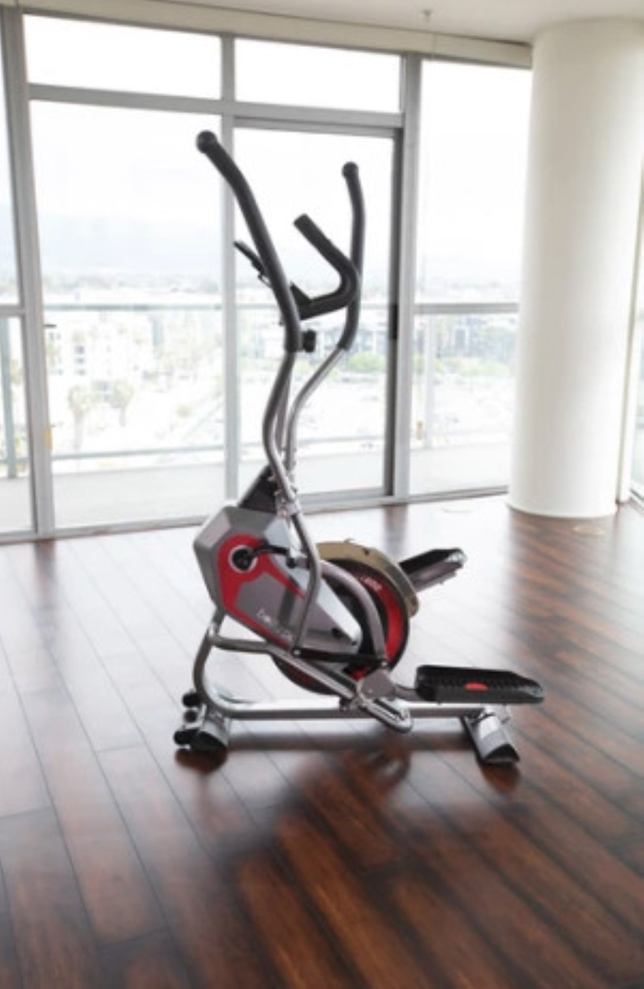 Stationary 2-in-1 elliptical and stepper exercise machine is ideal for full-body workouts by focusing on cardio and strength training Includes a manual control knob that adjusts through 8 levels of resistance to challenge the body Curve-crank technology disperses force in 2 directions that reduces stress on your body and joints Features upper body handlebars that target the arms, shoulders, abs, and waistline Built-in angled foot pedals with flat, open-back platforms Track time, speed, distance, and calories burned by the straightforward LCD computer with a built-in media shelf Includes transportation wheels for convenient storage and mobility around the home gym Maximum user weight: 250 pounds Color: Silver Dimensions (L x W x H): 42 x 24 x 62 inches Weight: 96.8 pounds