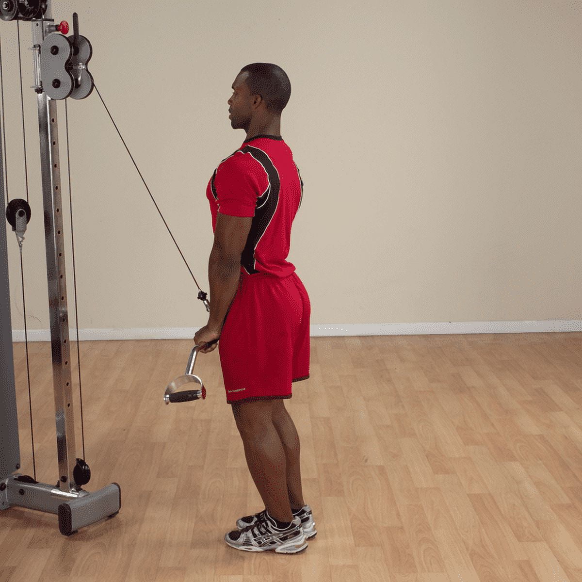 Lat pulldown bar works with any Body-Solid cable machine Scientifically angled to allow a deeper stretch for better lat development Durable solid steel construction with comfortable rubberized Pro-Grips Extra set of grips allow you to use bar for triceps and bicep workouts Measures 37.5 by 5.5 by 8.5 inches (L x W x H) and weighs 13 pounds