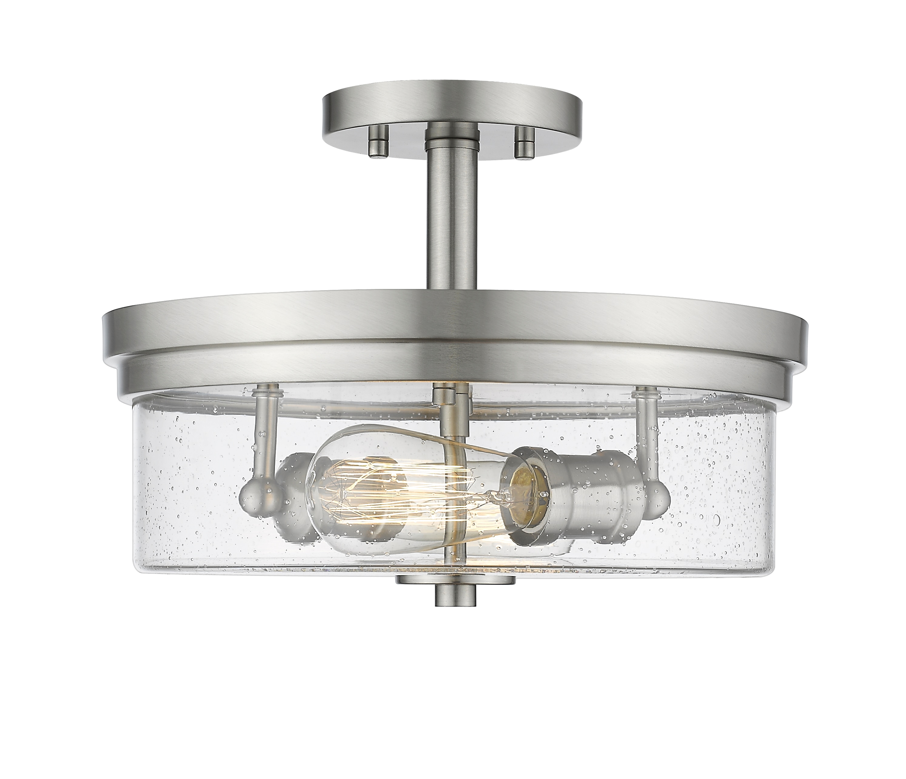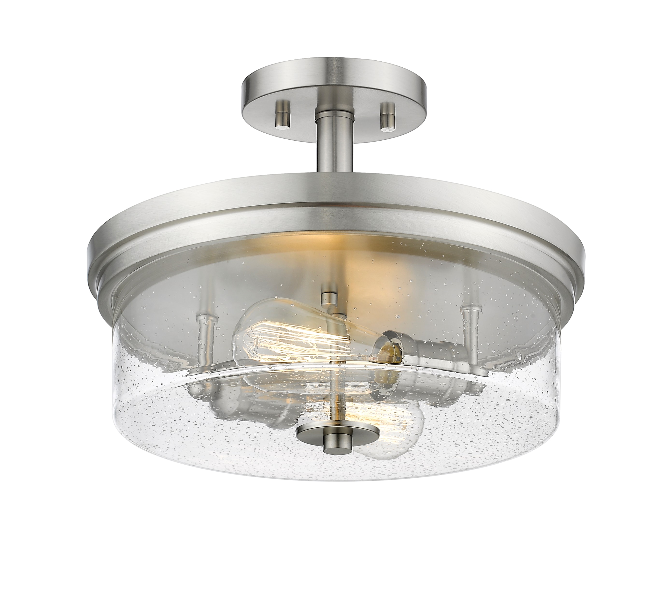 Create an exceptional contemporary or transitional design scheme with the classic styling of this two-light semi-flush mount ceiling light. Enjoy the versatility of elegant brushed nickel in a steel frame, and the romantic clear seedy glass shade that finishes its exquisite composition.