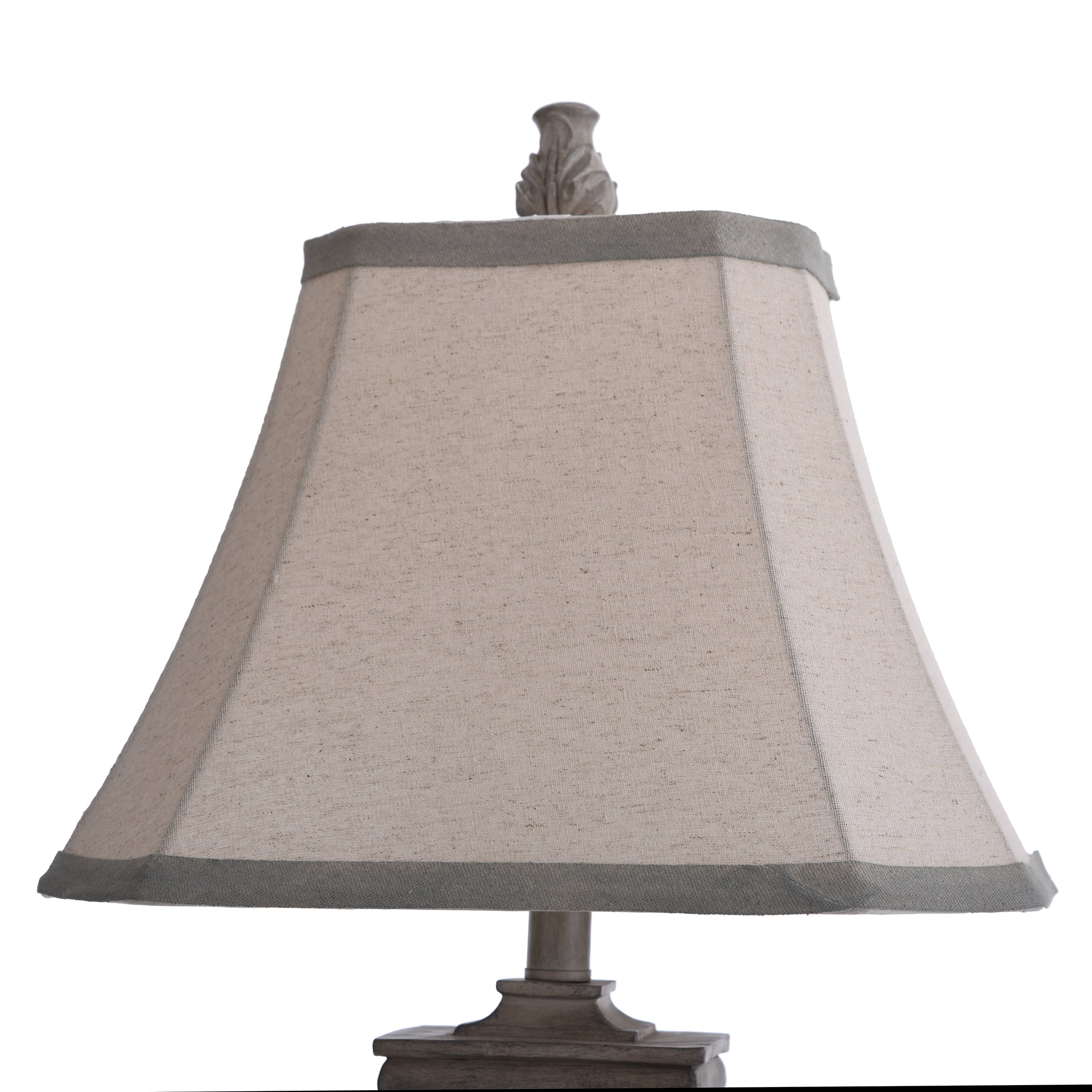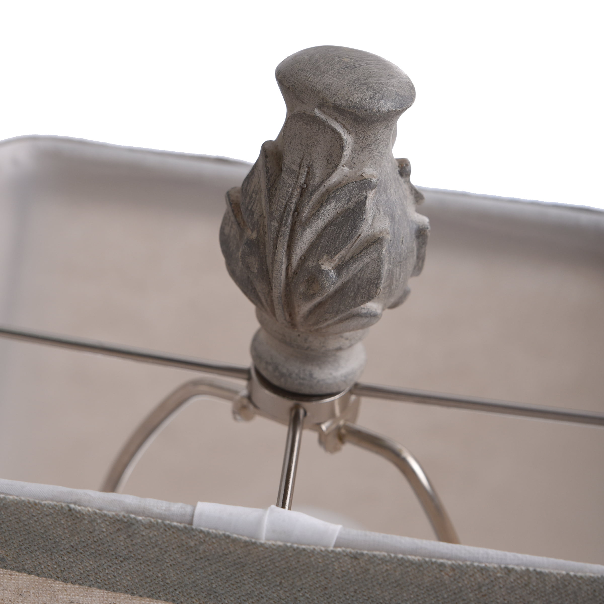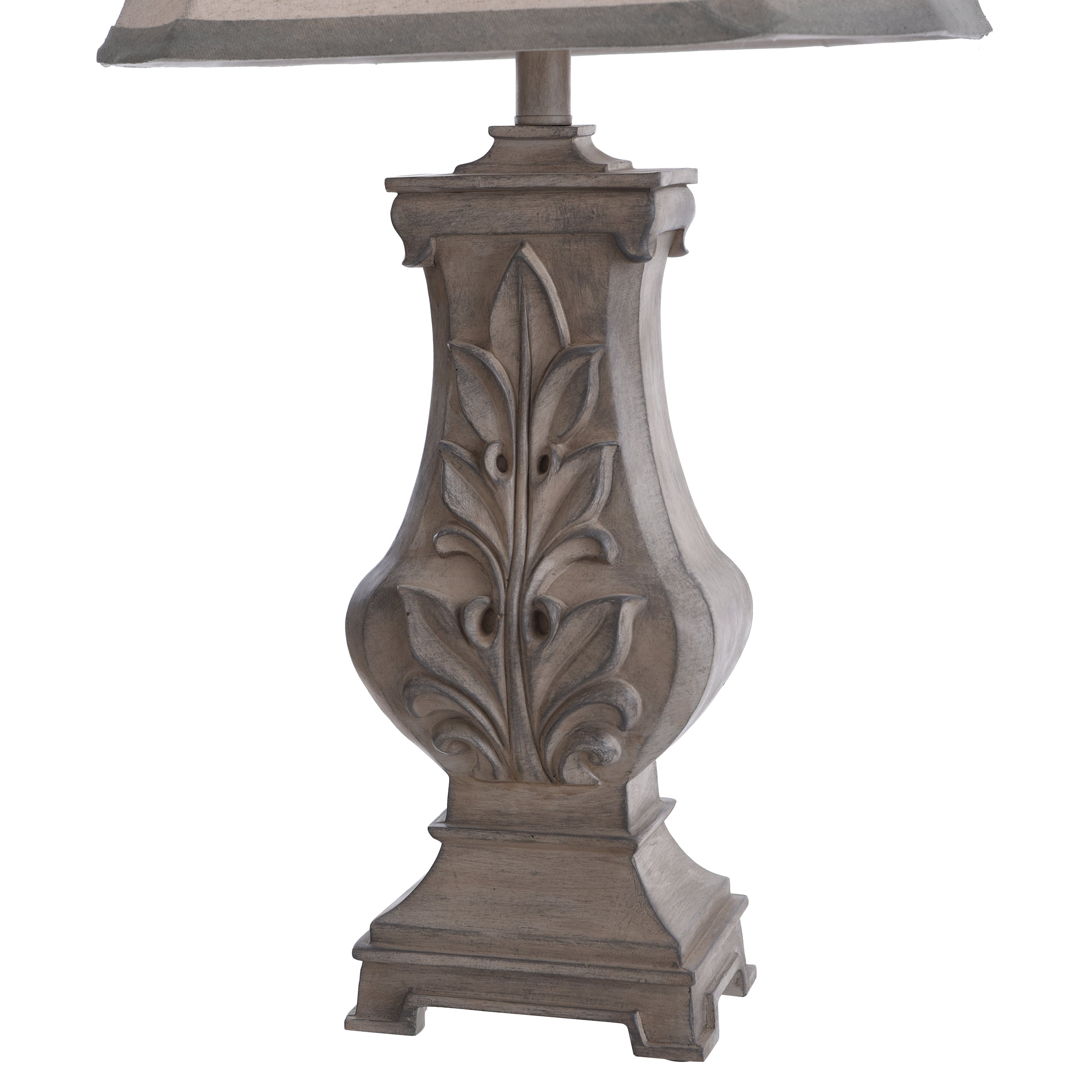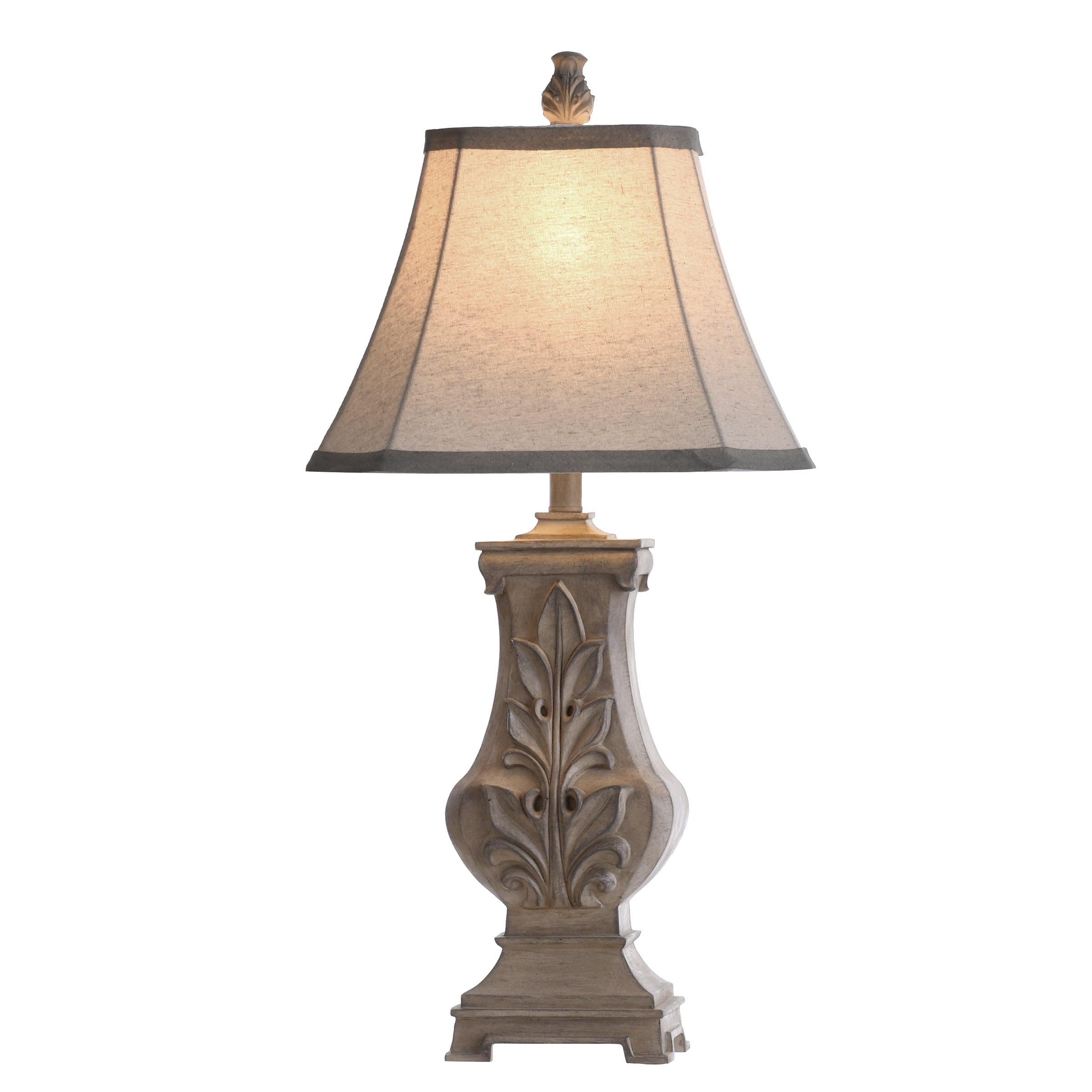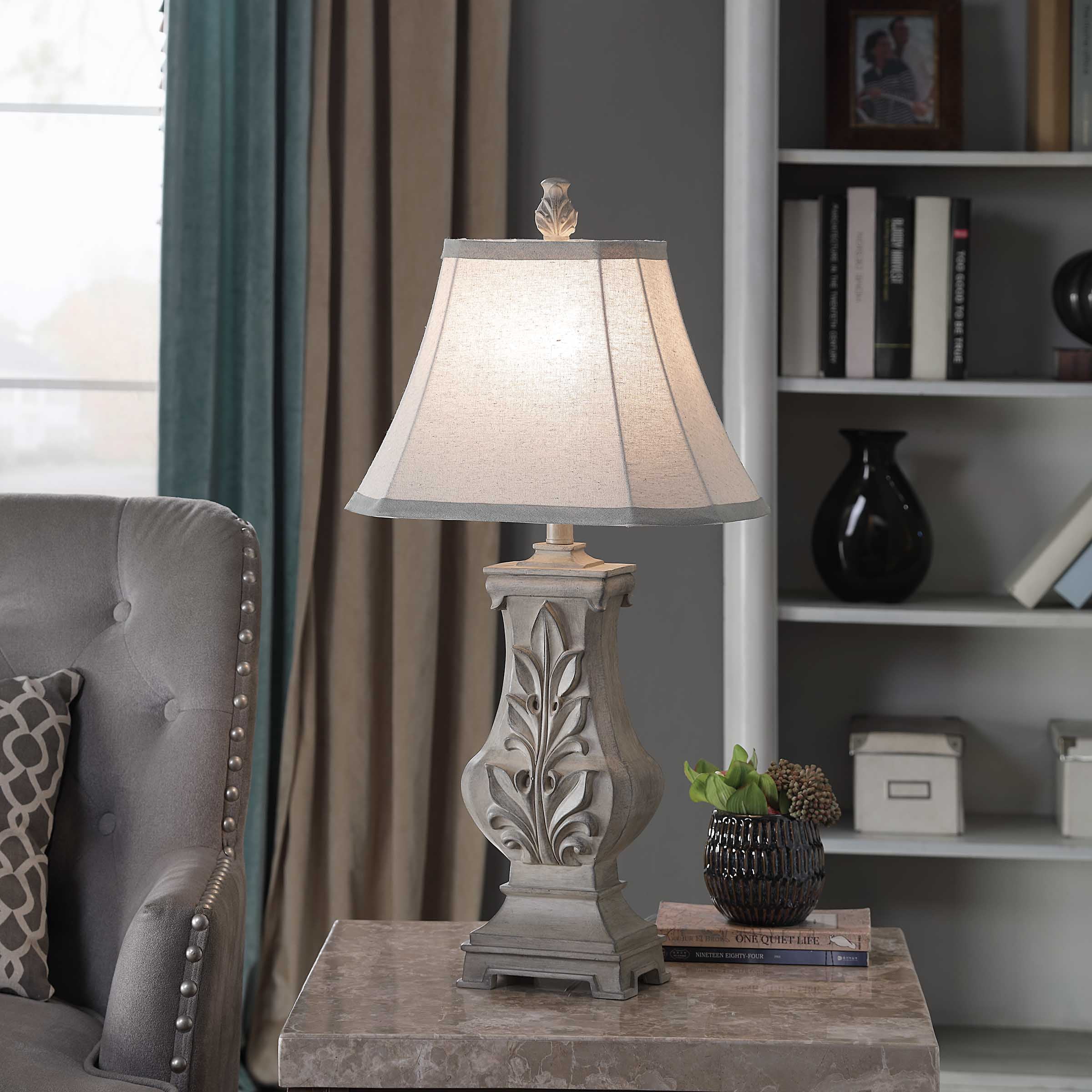 A favorite for inspiring living rooms and entryways, the Bokava table lamp is made with an off-white finish and Victorian floral motif. It’s crafted from polyresin using a vintage styling and strong lines that bring out the character of any tabletop. It’s made complete with a squared and tapered hardback shade with matching grey tone accent bands.