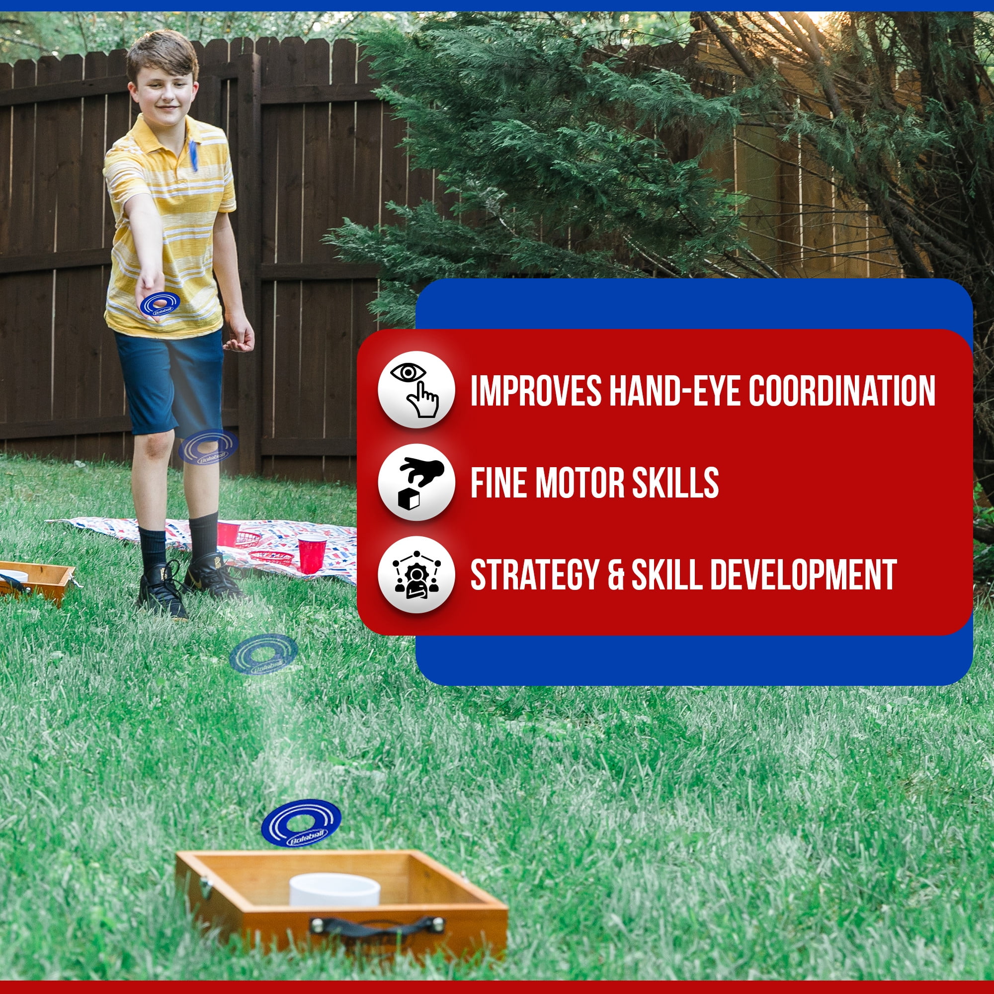 PREMIUM QUALITY: Features target boxes made from solid, thick, high-quality wood, ensuring their durability and longevity for years of outdoor fun in your yard, lawn, or garden. Enjoy bullseye fun in diverse outdoor settings. CONVENIENT PORTABILITY: With a secure latch system, these washer toss game sets connect the target boxes, making them easy to transport to outdoor settings. Take them to the beach, a backyard party, or on a camping trip for endless entertainment. RECOMMENDED FOR ADULTS: Suitable for ages 14 and above, these outdoor games are tailored for adults who relish engaging in outdoor yard games. They provide a challenging and enjoyable experience for players of all skill levels. VERSATILE OUTDOOR ENTERTAINMENT: Whether you’re hosting a backyard gathering, spending a day at the beach, or seeking entertainment during camping excursions, our professional washer toss game sets offer a portable & engaging option for outdoor play. INTERACTIVE COMPETITION: Elevate your outdoor gatherings! Challenge your friends and family to a fun-filled competition in your yard, lawn, or garden, or take it to the beach, backyard parties, or camping trips for lively group play.