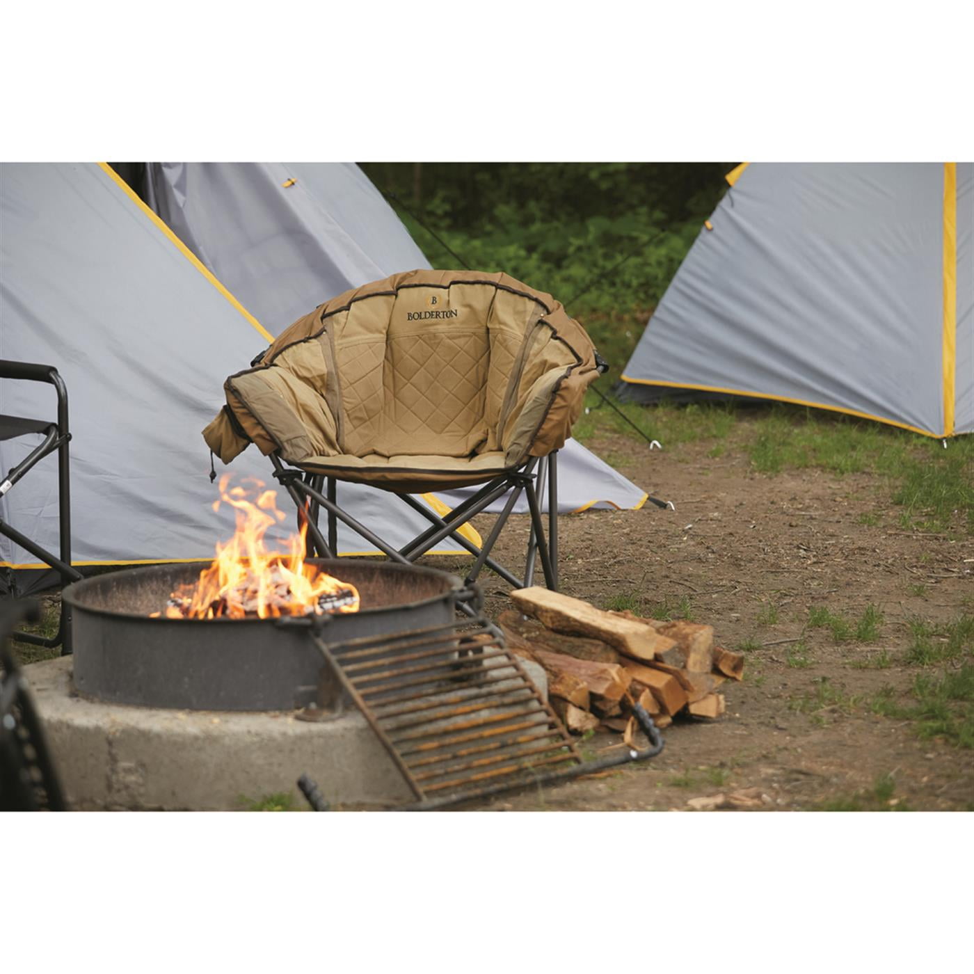 BOLDERTON HERITAGE OVERSIZED CLUB CHAIR The Bolderton Heritage Oversized Club and Camp Chair is designed for relaxing in comfort during camping, tailgating, and outdoor activities. Featuring 600-denier polyester and 12 oz. waxed cotton canvas for a traditional retro style and water-resistance. The portable seat features an oversized design and extra padding that’s super comfortable for big campers. Suitable to use as a heavy-duty camp chair for adults. The collapsible chair features a durable powder-coated steel frame which supports weights of up to 500 lbs. The extra strong weight capacity is higher than most camp chairs. You’ll be ultra-comfortable in this luxury cozy chair. We’ve even included a cup holder and mesh pockets so you can keep your essentials within easy reach. KEY FEATURES: Strong powder-coated steel frame holds up to 500 lbs. Fabric is a combination of 12-oz. waxed cotton canvas and 600-denier polyester with water-resistant polyurethane coating Thick padding on back and sides for all-day comfort Frame folds for easy stash-and-go convenience 2 interior accessory pockets Exterior drink pocket Includes storage bag for easy transport