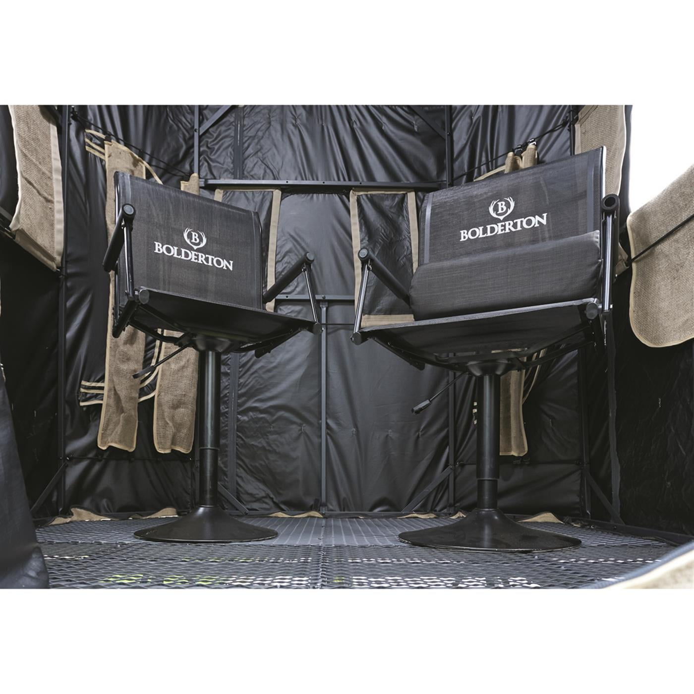 BOLDERTON XL SWIVEL TOWER HUNTING CHAIR The Bolderton XL Swivel Tower Chair is built for hunting. It can be used with an elevated deer blind for a comfortable hunting experience. The heavy duty powder-coated steel frame is highly durable for hunting equipment that lasts. The extra wide base provides reliable stability and a silent 360 degree swivel for stealthy visibility in all directions. Our hunting chair features a water-resistant mesh seat for protection whatever the weather. COMFORTABLE The Bolderton XL Swivel Tower Chair has been built with comfort in mind. We’ve added padded armrests and removable lumbar support to prevent aches and pains when sitting for long periods. It’s easy to transport the hunting chair anywhere with the removable pedestal and folding chair. FEATURES Powder-coated steel frame Water-resistant mesh seat Padded armrests for comfort Removable lumbar pad Wide base provides excellent stability Silent 360° swivel for easy viewing in all directions Pedestal adjusts from 19″ to 24″h. Easy to transport with removable pedestal and folding chair 17.5″ diameter base with non-skid ring