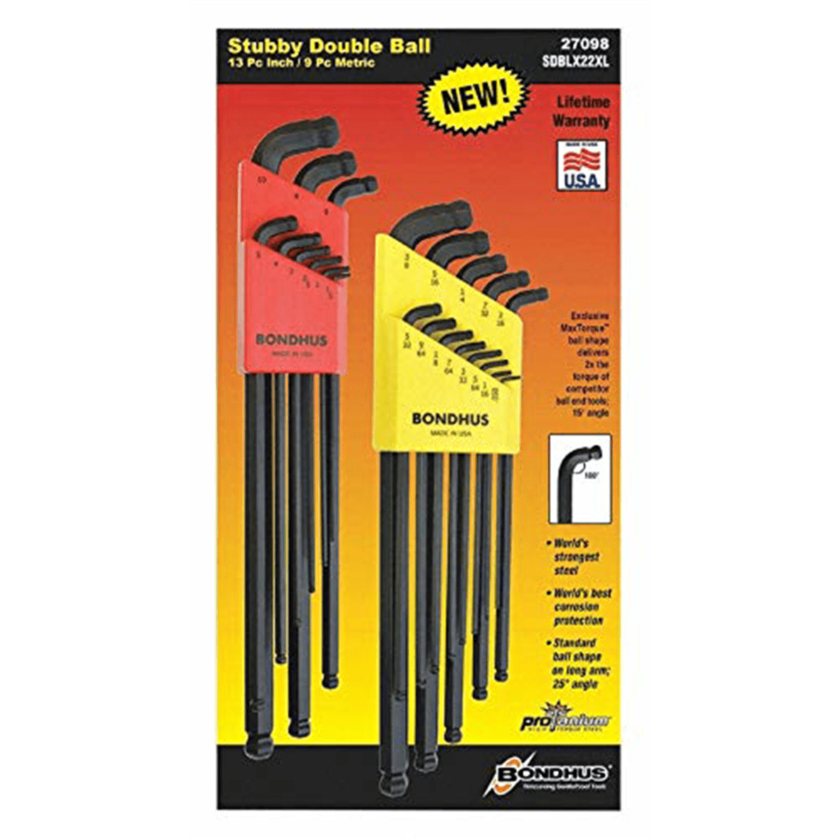 Stubby Double Ball L-Wrench combination set include SAE and Metric sizes Exclusive MaxTorque ball end on short arm allows access to screw heads located in tight spaces straight-in or at an angle Exclusive MaxTorque ball end delivers 50% more torque than conventional ball ends Exclusive MaxTorque ball end inserts into screw and works at a 15? angle Standard Bondhus ball end on long arm inserts into screw and works at a 25? angle