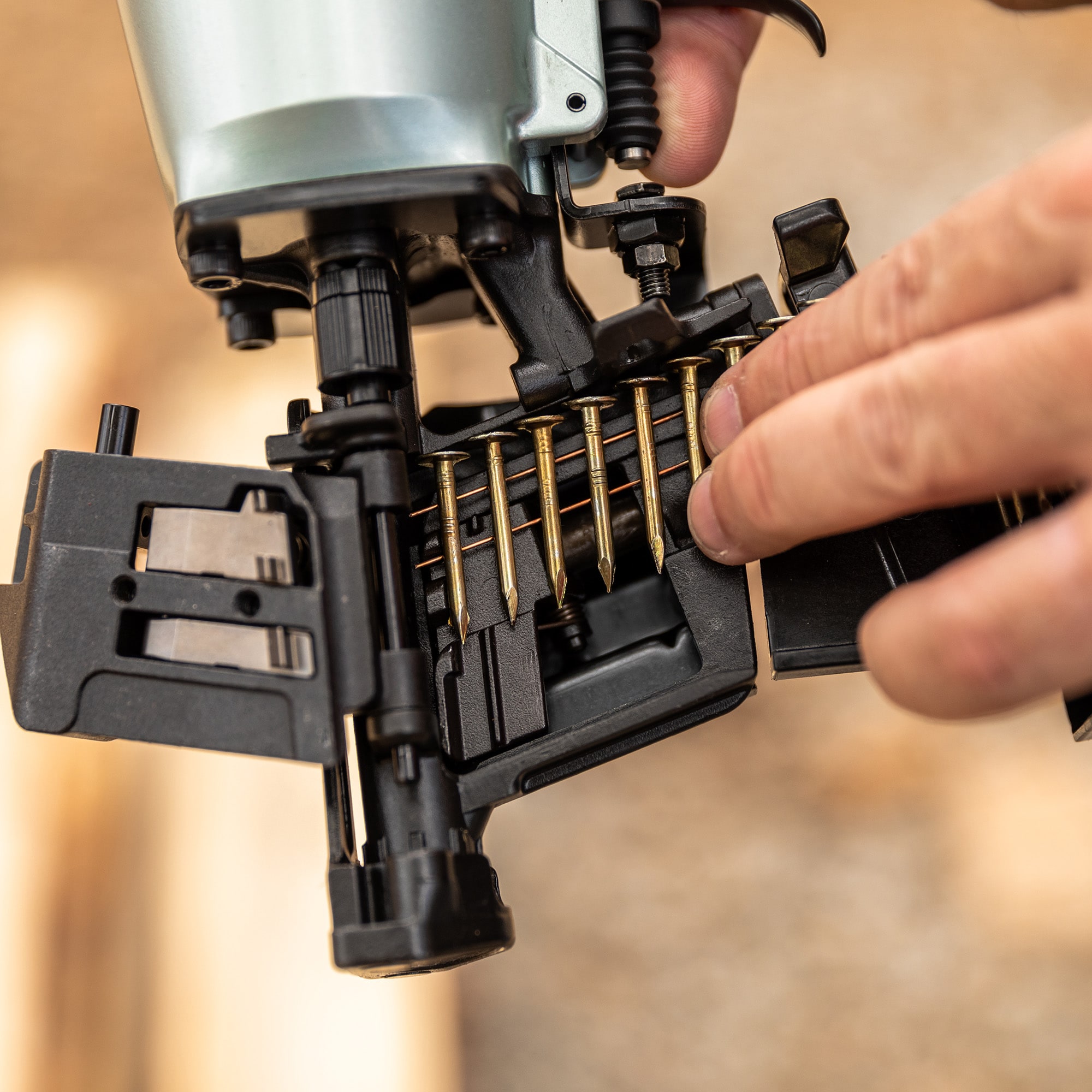 The new Metabo HPT Pro Roofing Bundle includes our Pro Preferred 1-3/4 in Coil Roofing Nailer with BONUS Triple Hammer Bolt Impact Driver Kit with Battery and Charger. The Coil Roofing Nailer (NV45AB2) is extremely lightweight at only 5.7 lbs and its unique cylinder valve firing mechanism allows you to fire up to 3 nails per second for rapid driving and unprecedented quick response. The depth of drive adjustment allows users to drive nails to the desired depth at operating pressure ranging from 70 to 120 psi. The Coil Roofing Nailer will fire all standard Roofing Nails ranging in size from 7/8 to 1-3/4 in. The next generation BONUS 18V Cordless Triple Hammer BOLT Impact Driver (WH18DCQ4) features innovative upgrades including a third anvil and now 5 speed settings (including the powerful BOLT mode that efficiently tightens and loosens large bolts and nuts) allowing it to achieve 1,859 in-lbs of torque, 4,000 BPM, and 3,700 RPM driving speed, while also reducing vibration. It is ultra-compact (4.5 in long) and lightweight (2 lbs) and has a shadow minimizing triple LED light allowing users more access and visibility in tight dark spaces for all day use. The tool body is IP56 rated with added protection against dust and water exposure so you can GO all day on any job. Also included is the BONUS MultiVolt 18V/36V Water & Impact Resistant Battery (380083M) and charger. A waterproof barrier exists for the internal cell terminals and twin exit ports for water that gets inside the battery pack for better defense against moisture related short circuiting. An impact resistant protective layer provides 15% more shock absorption and a longer battery life than previous models to lessen damage from drops and rough use. It has a 5.0Ah capacity with 18V tools and 2.5Ah capacity with 36V tools and features a battery fuel gauge for user convenience. The MultiVolt battery design helps prevent overheating when pushed to the limit and works at temperatures as low as 14°F (-10°C).