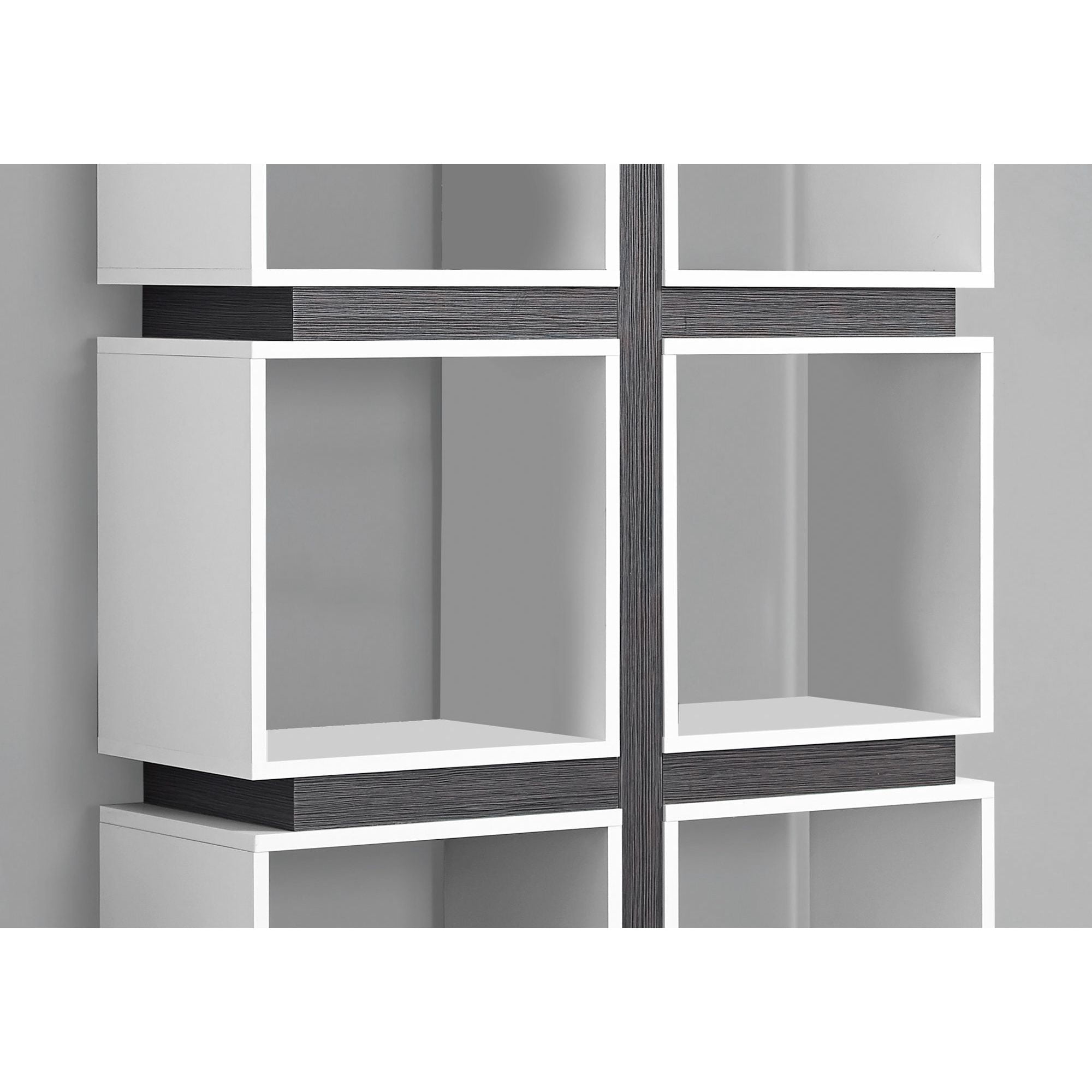 8 cube style storage shelves for books, decorative objects Can be used as a bookcase or a room divider placed upright or sideways Stylish two tone white and cedar grey finish