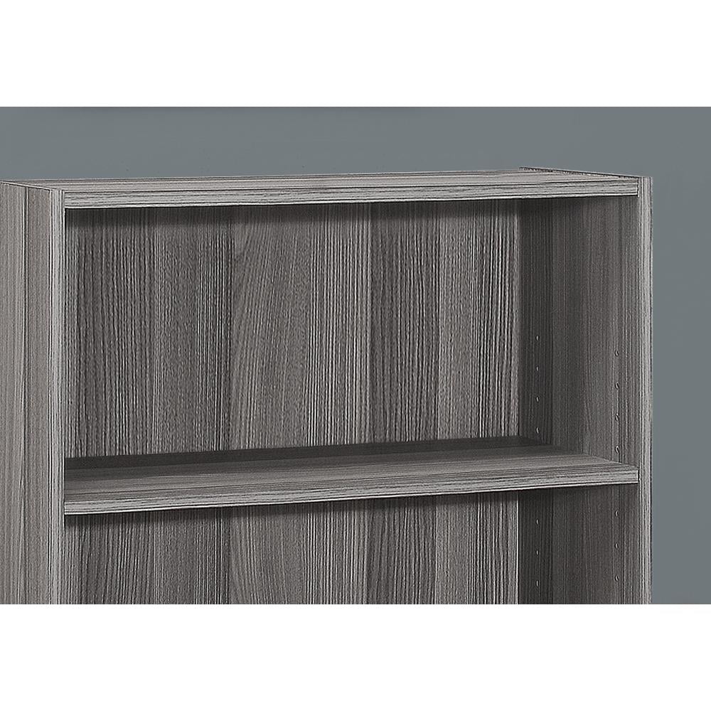 This 3-shelf bookcase in a simple, clean and space-saving design makes it a versatile storage option for any room in your home. The solid adjustable shelving allows for various sized objects to be displayed in your own creative way. Constructed from engineered materials in a sophisticated gray wood-look laminate finish, this transitional style bookcase could be used in an entryway to store all your shoes, or in a living room, home office, or bedroom to place books, toys, and decorative objects. Assembly is required. Features: Finish: Gray Materials: Particle Board and Laminate 2 adjustable shelves and 1 fixed bottom shelf Space saving, transitional/ contemporary style suitable for any room Elegant gray finish on 3 sides Assembly required Specifications: Product Dimensions: 35.5″ H x 24.75″ W x 11.75″ D Product Weight: 29 lbs Shelf Dimensions: (Top) 10.5″ H x 23.5″ W x 11.5″ D Shelf Dimensions: (Center) 10.75″ H x 23.5″ W x 11.5″ D Shelf Dimensions: (Bottom) 11.25″ H x 23.5″ W x 11.5″ D Shelf Weight Capacity: 5 lbs Number of Shelves: 3