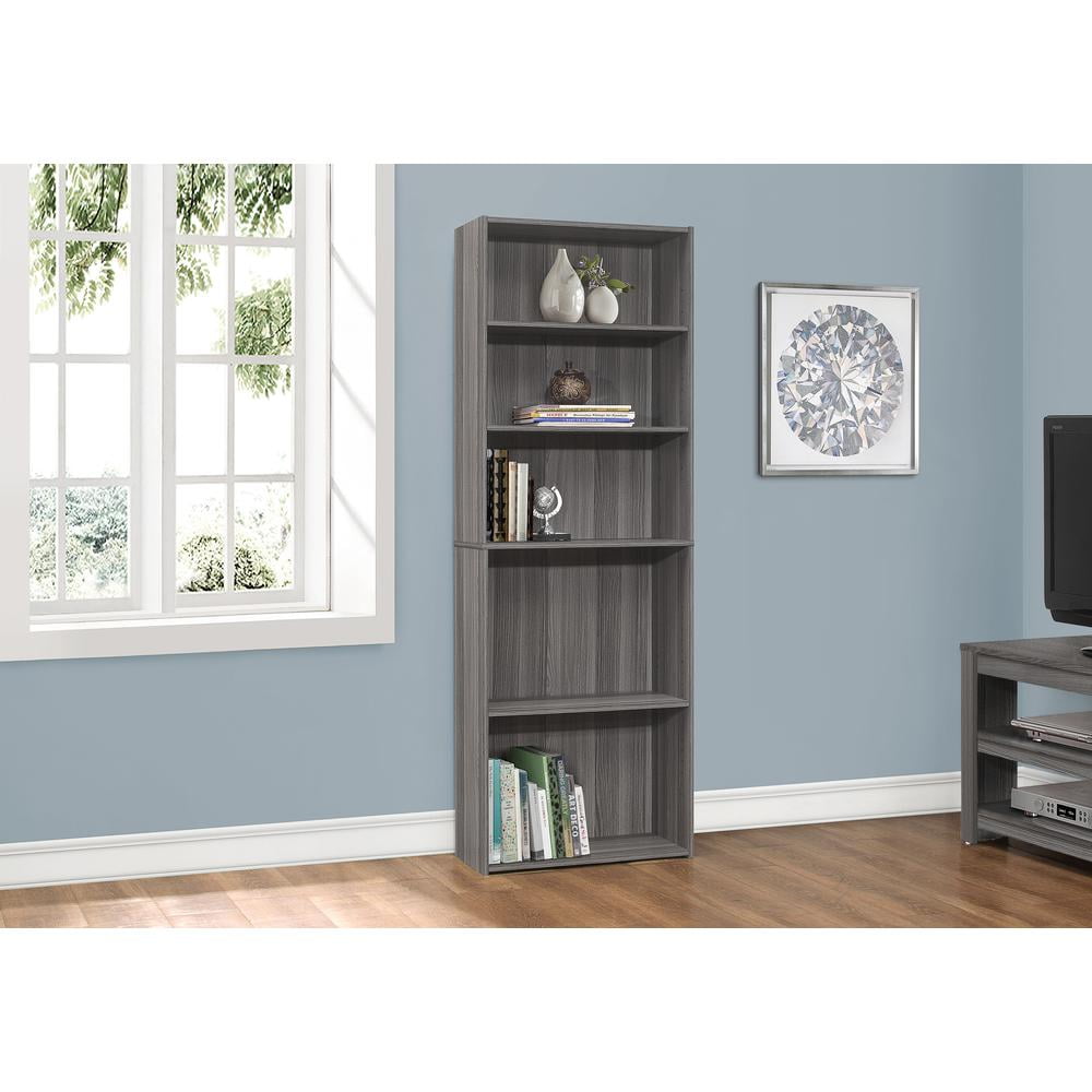 This 5-shelf bookcase in a simple, clean and space-saving design makes it a versatile storage option for any room in your home. The strong adjustable shelving allows for various sized objects to be displayed in your own creative way. Constructed from engineered materials in a sophisticated gray wood-look laminate finish, this transitional style bookcase can easily be used in a living room, home office, or bedroom to store books, toys, and decorative accents. Tipping hardware is included to secure safely to a wall. Assembly is required. Features: Finish: Gray Materials: Particle Board and Laminate 3 adjustable shelves and 2 fixed shelves Space saving, transitional/ contemporary style suitable for any room Tipping hardware included for extra security Elegant gray wood-look finish on 3 sides Assembly is required Specifications: Product Dimensions: 71.25″ H x 24.75″ W x 11.75″ D Product Weight: 52 lbs Shelf Dimensions: (Top) 10.5″ H x 23.5″ W x 11.5″ D Shelf Dimensions: (Center) 12″ H x 23.5″ W x 11.5″ D Shelf Dimensions: (Bottom 2nd) 17.5″ H x 23.5″ W x 11.5″ D Shelf Dimensions: (Bottom) 16.25″ H x 23.5″ W x 11.5″ D Shelf Weight Capacity: 5 lbs Number of Shelves: 5