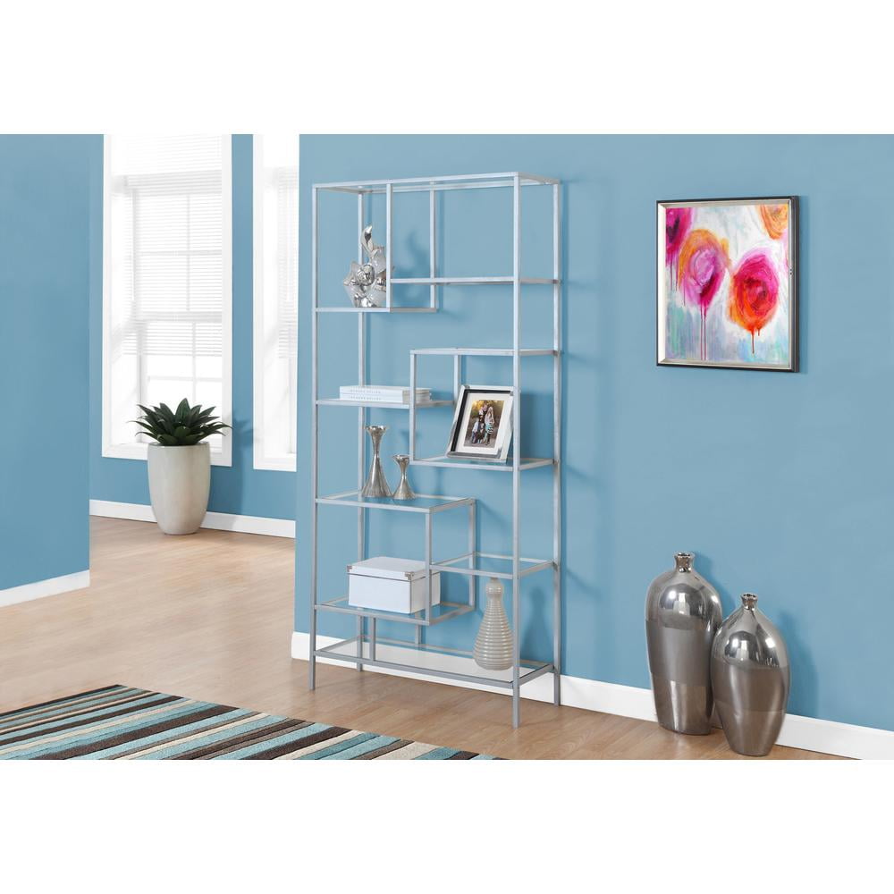 Bookshelf in a structurally-sound silver metal frame that can be paired with virtually any style 9 tempered glass display shelves offer ample surface space for photo frames, plants, electronics or books Versatility on point with this ideal etagere bookcase for your living room, den, home office, or hallway
