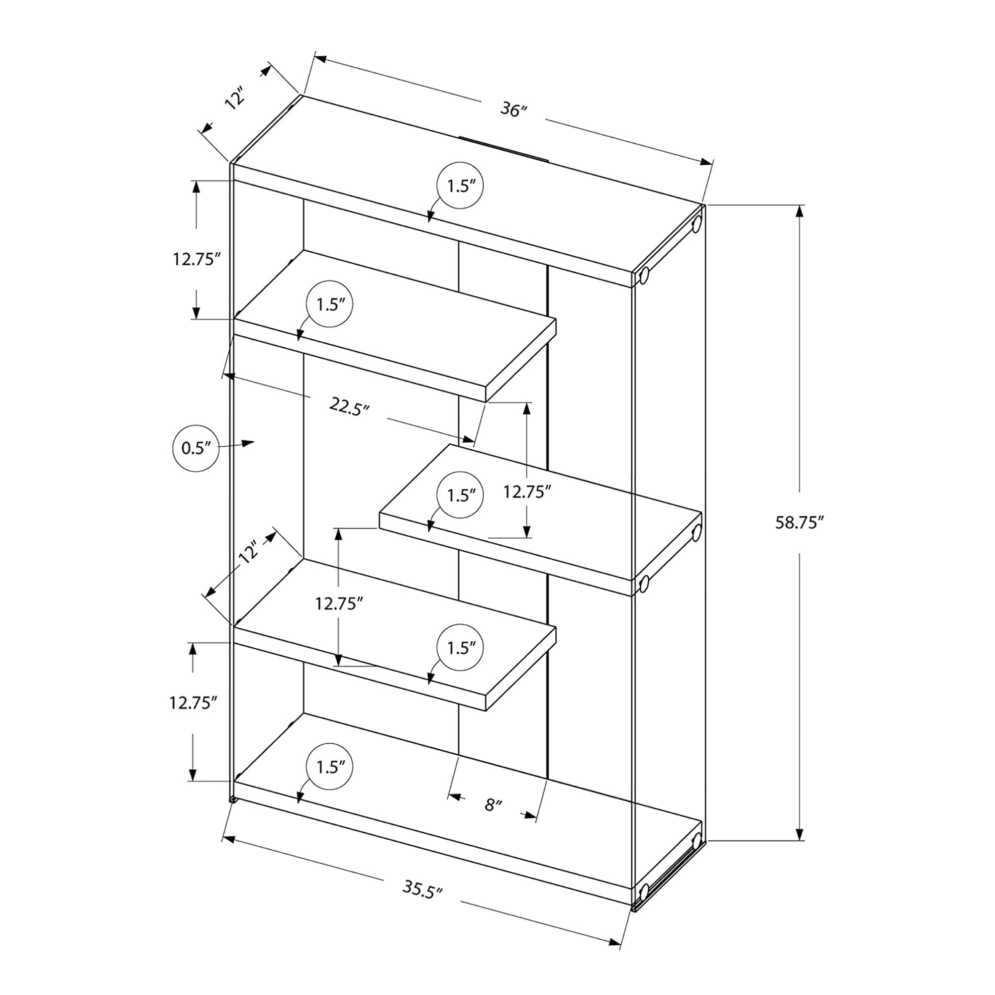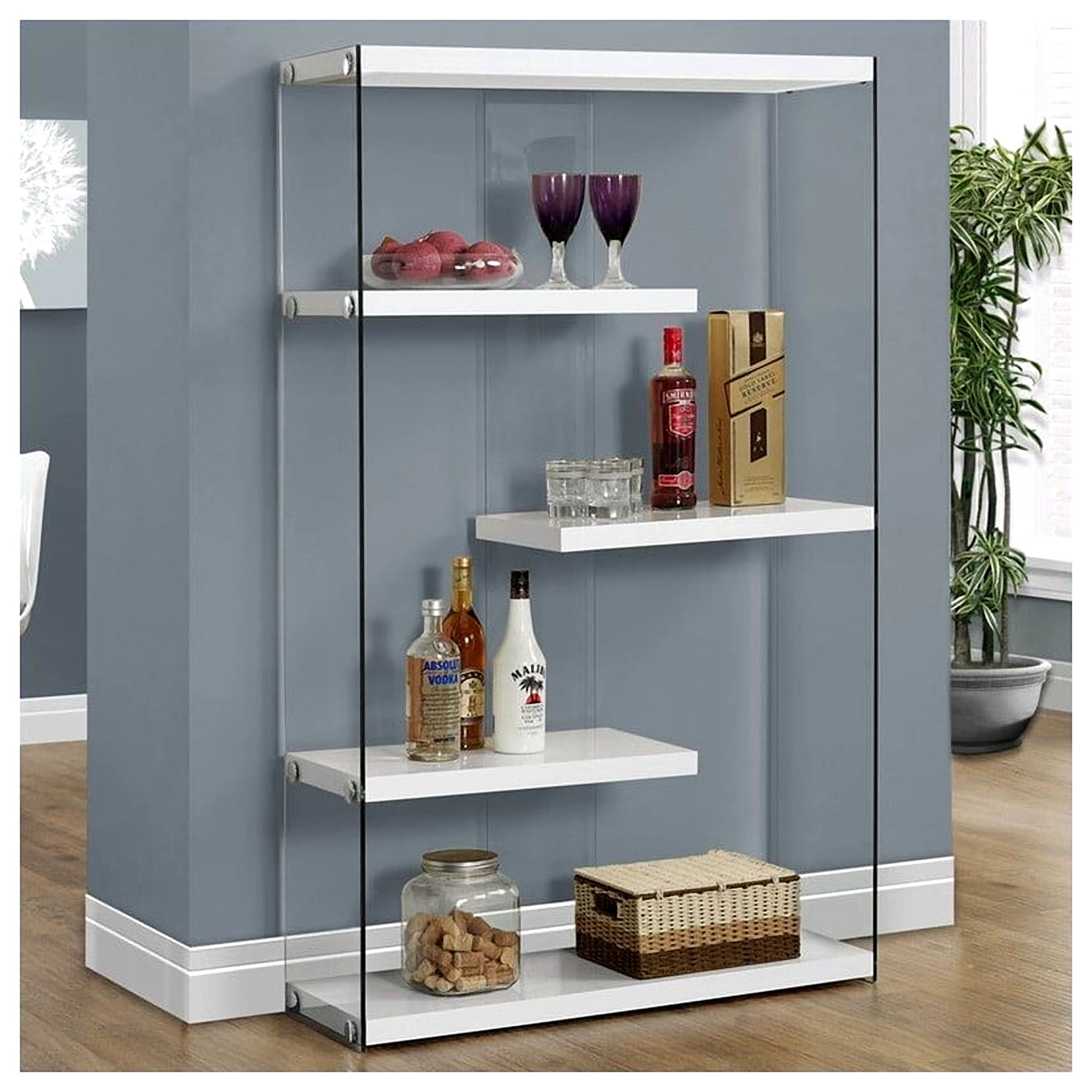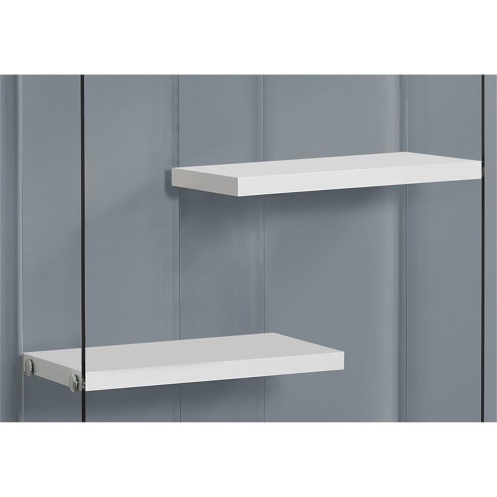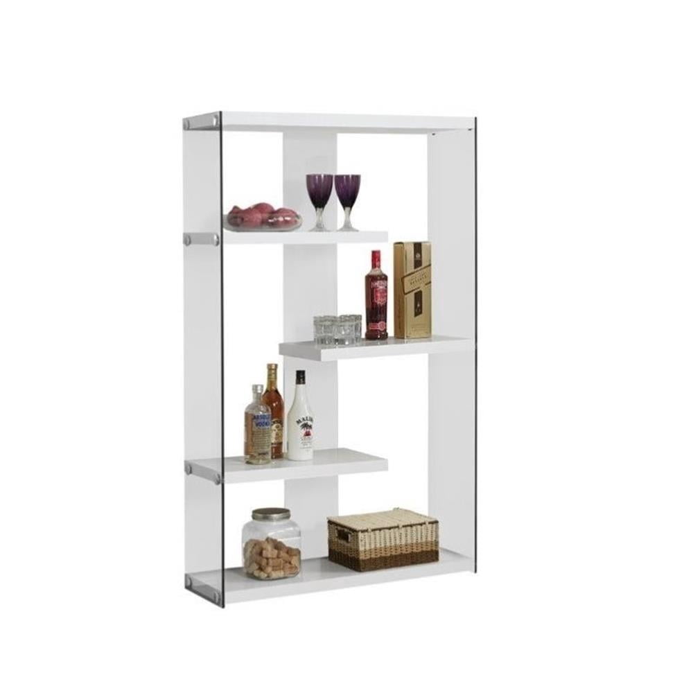 Modern bookcase provides a stylish piece of accent furniture in any room in your home Zig zag white shelves are fixed to the sides and back of this shelf for a sturdy place to display decorations Tempered glass sides allow you to view decorations from any angle Chrome accents add elegant details that complement any existing furniture and decor Assembly is easy with the included detailed instructions Small shelf weight capacity: 22 pounds Large shelf weight capacity: 35 pounds Shelf material: Particleboard Side material: Tempered glass Color: White Small shelf dimensions (L x W x H): 22.5 x 12 x 12.75 inches Large shelf dimensions (L x W x H): 35.5 x 12 x 12.75 inches Overall dimensions (L x W x H): 36 x 12 x 58.75 inches Weight: 87 pounds