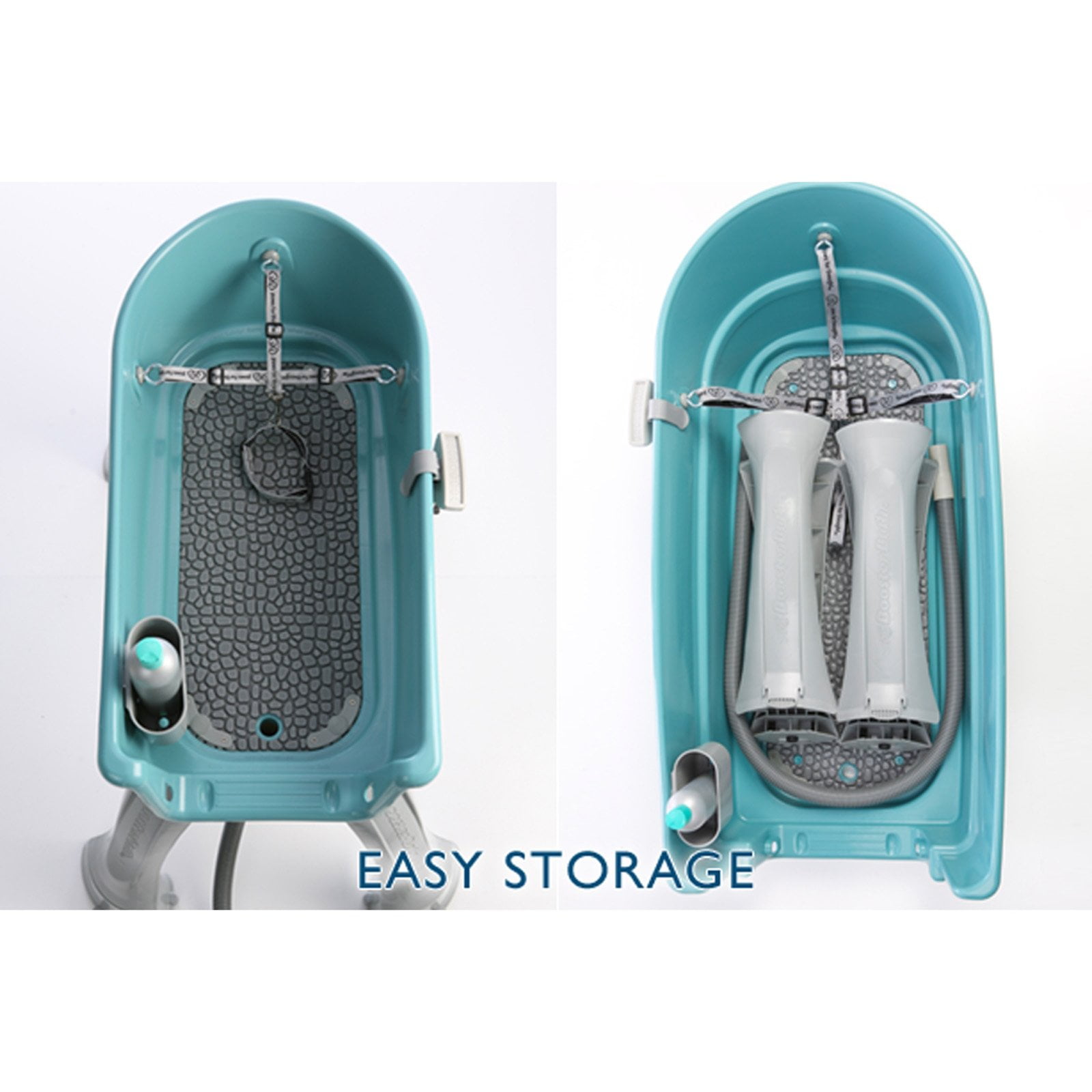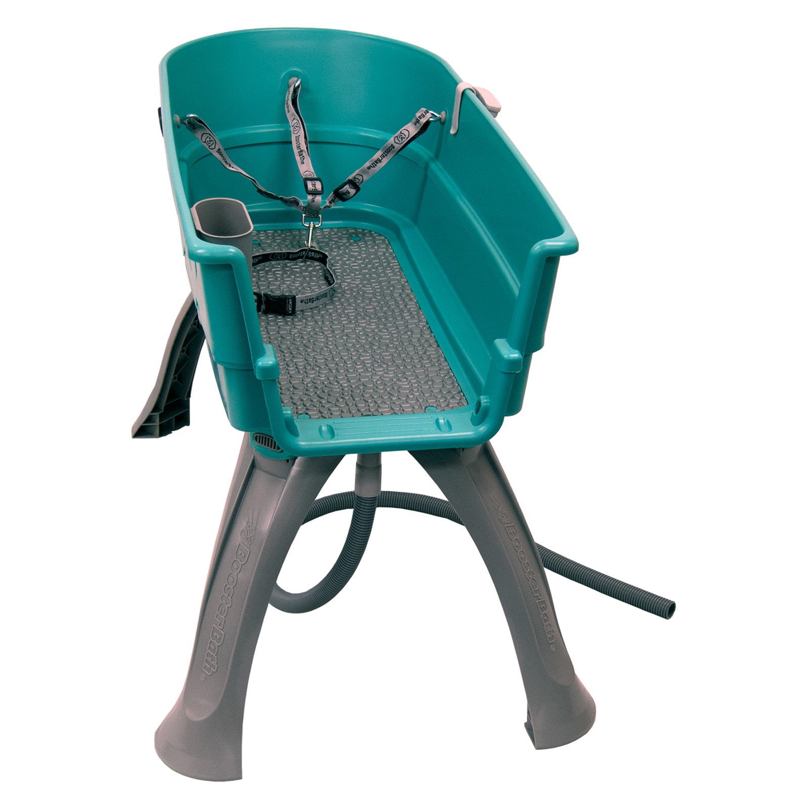 BB-MEDIUM size 33 L x 16.8 W x 33 H features:Durable, lightweight, portable and recommended by top veterinarians, breeders and handlers worldwide!The Booster Bath provides elevation and containment of your pet with 360 degree access for easy bathing and dryingAdjustable 3-point restraint system with quick snap removable collar. This is a HUGE patented feature unique only to Booster Bath which competitive products CANNOT incorporate! This included restraint keeps the pet facing forward in the tub and prevents the pet from writhing, jumping out of or backing out of the tub during bathing. Imagine the hazards of a pet trying to leap out of or trying to turn around in a tub almost 3 feet off the ground! Booster Bath elevates to minimize back discomfort for the bather while keeping your pet secure and safe!One piece tub with quick-snap/ snap-off legs for easy use and storageGreat for indoor or outdoor use, UV stabilized and can be stored outdoorsRubber bumpers on bottom of legs keeps bath stationary when your dog enters or exitsDrain hose allows you to easily direct drainage while you stay dry during bathing.Shampoo caddy eliminates chasing the shampoo bottle while the included fan spray nozzle is great for washing dogsRubberized no-slip mat prevents your dog from slipping and sliding during bath timeDesigned for Breed Sizes: French Bulldog, Cocker Spaniel, Scottish Terrier, Jack Russell, Welsh Corgi, Miniature Schnauzer, Beagle, Cavalier King, Pug and Eskimo Dog up to 75 lbsOne year warranty, !