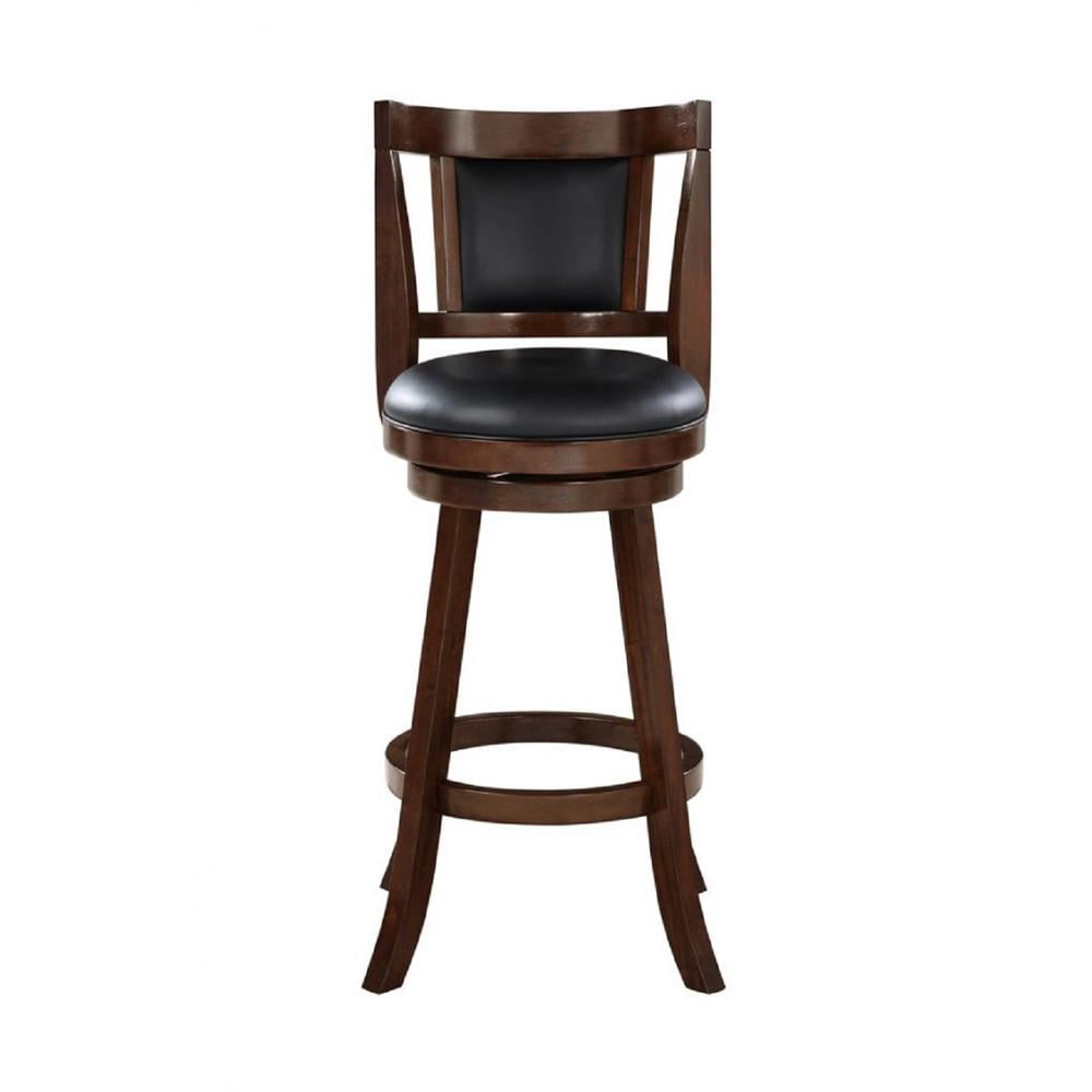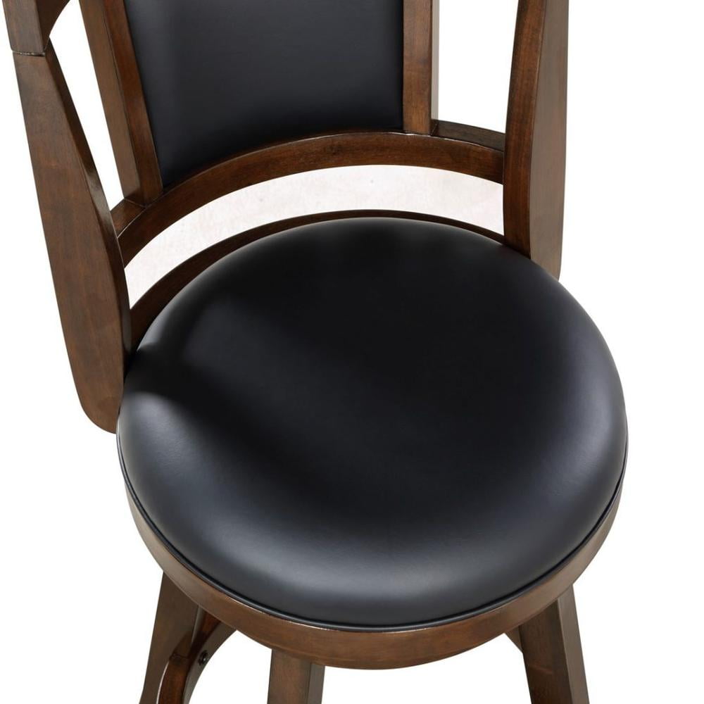 Constructed with solid hardwood 360-degree steel ball-bearing swivel plate Slightly flared legs for stable seating Durable footrest Faux leather upholstered seat and back High-density foam cushion Seat height available in counter (24 inches) and bar (29 inches) Available in walnut, cappuccino, and cherry finish options