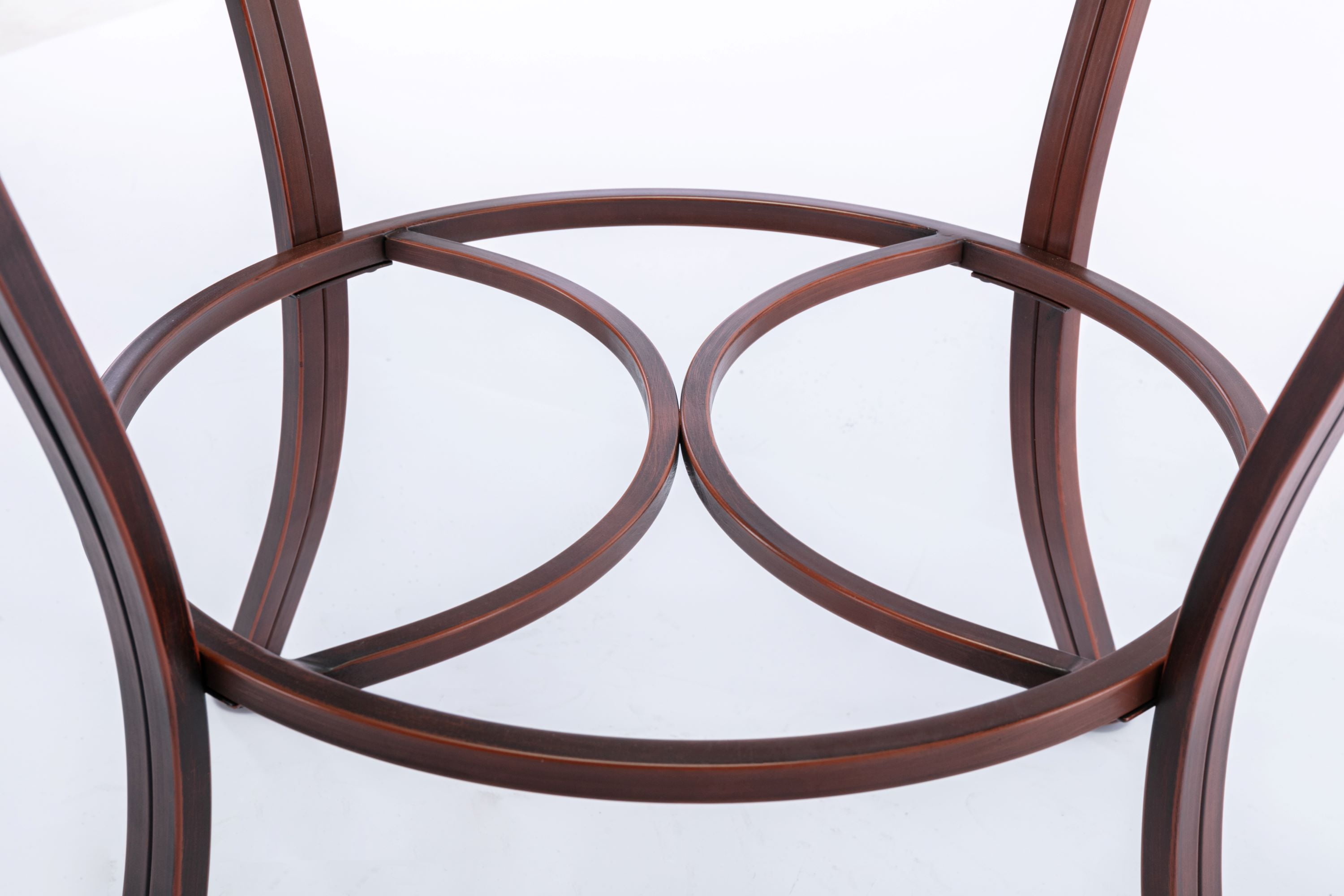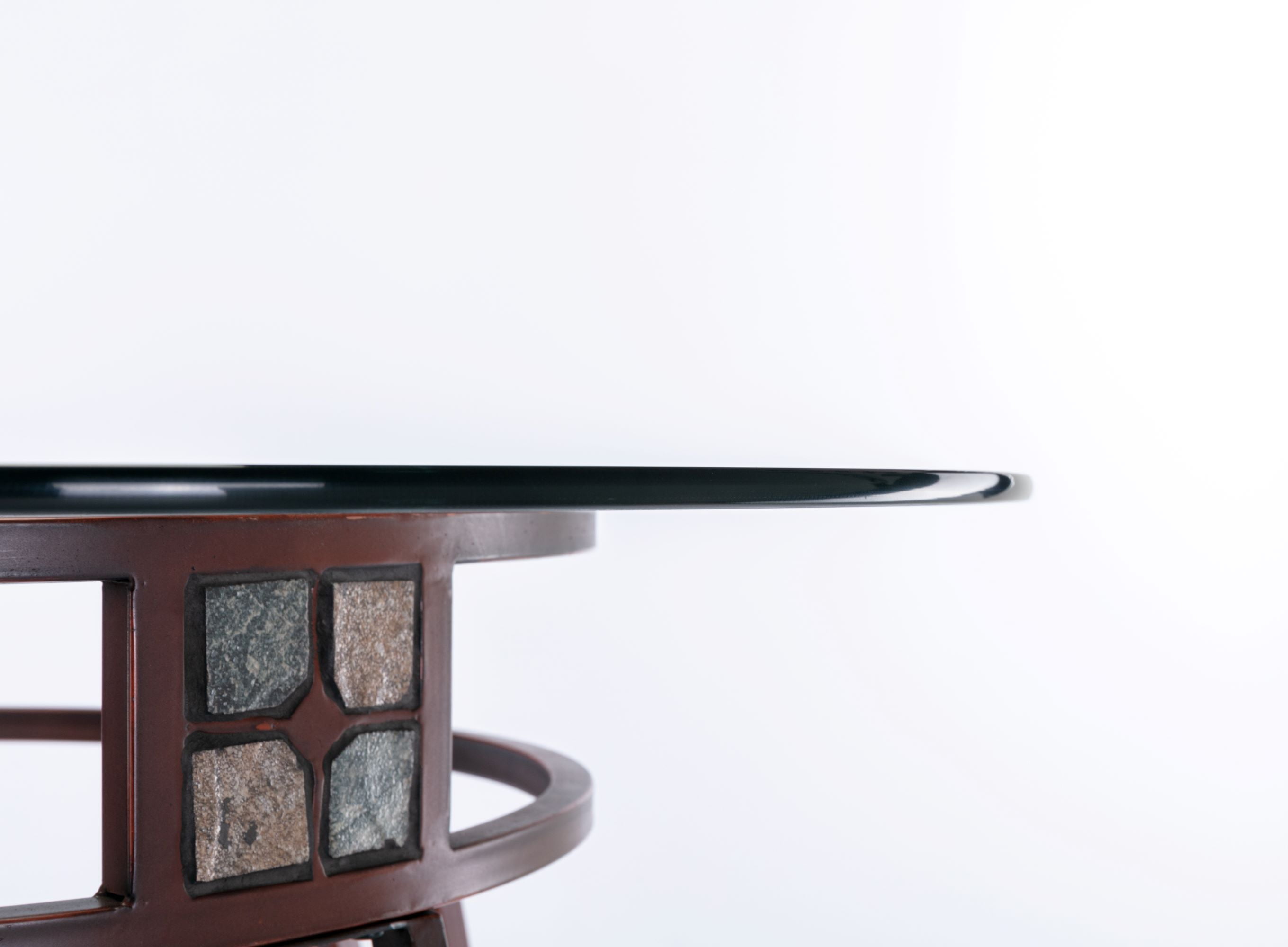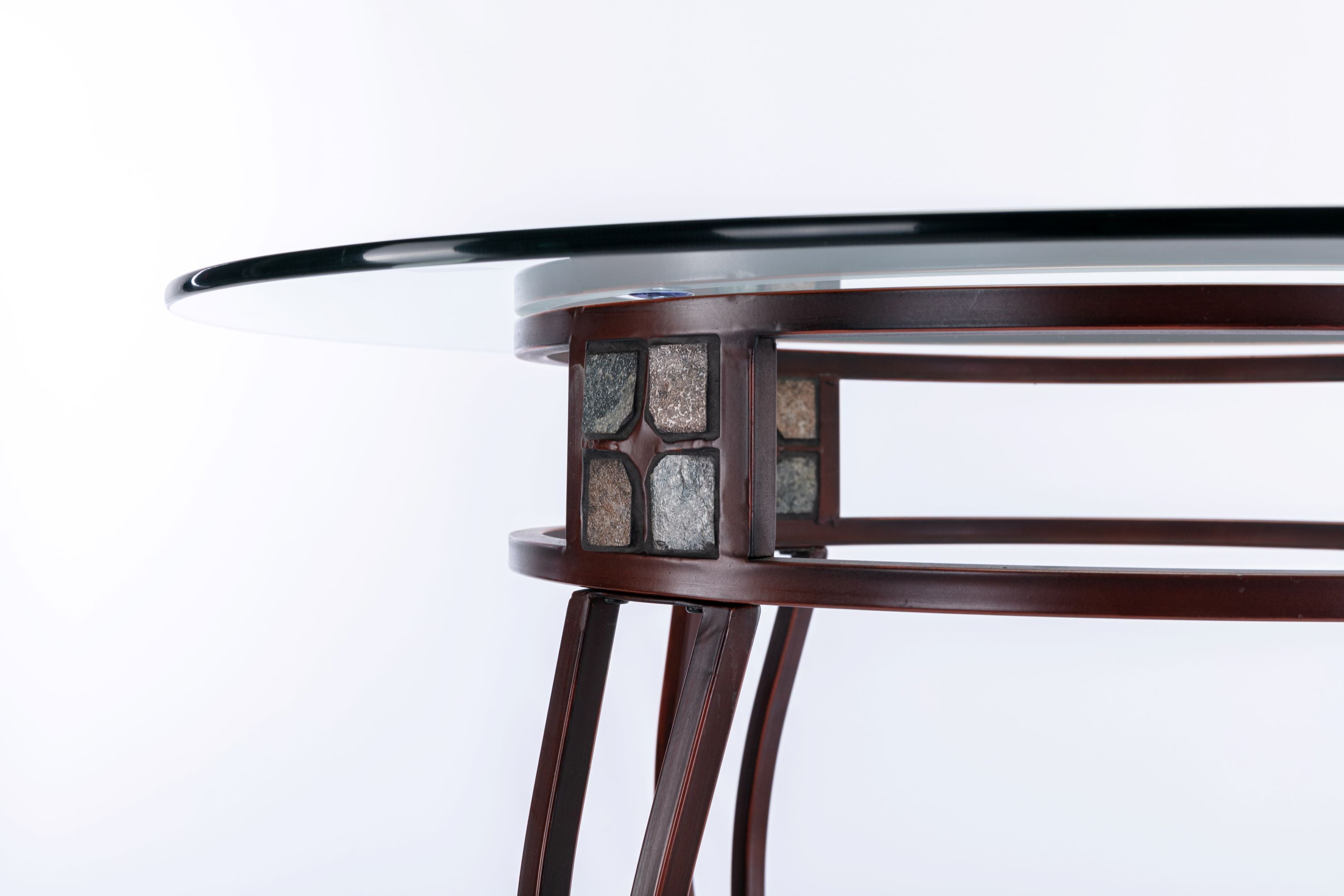 Bronze finish Beveled glass table top Sturdy metal frame Earth tone slate mosaic around table apron Easy to assemble