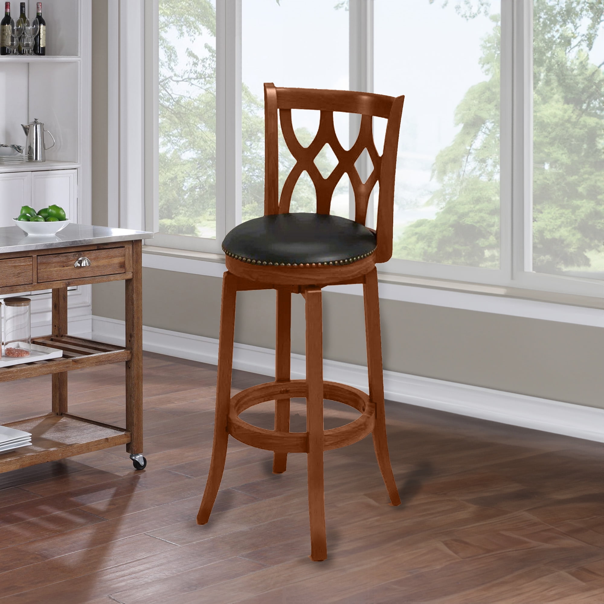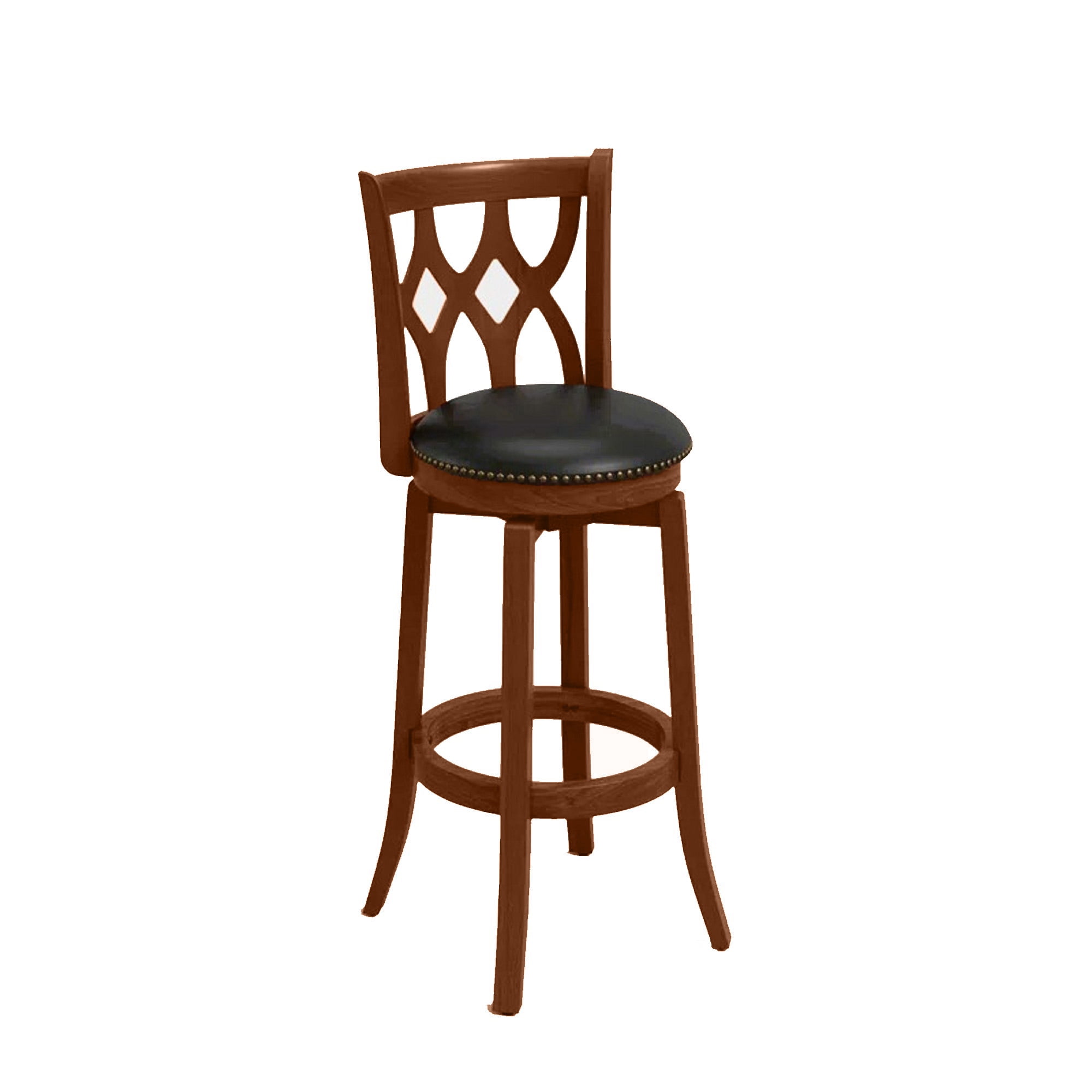 29″ Cathedral Swivel Bar Stool: Solid hardwood RTA construction Durable black PVC seat with high density foam cushion and faux nail head trim Durable steel ball bearing swivel for comfort Flared legs and footrest for strength and comfort Assembly required 29″ barstool with high, lattice-style back Versatile style blends with traditional, transitional and even contemporary interiors Light cherry finish Swivel enables you to move about freely Nail head trim creates polished look Ideal for breakfast nooks, bar areas and bistro tables Dimensions: 22.0 x 18.0 x 43.5 One stool per unit