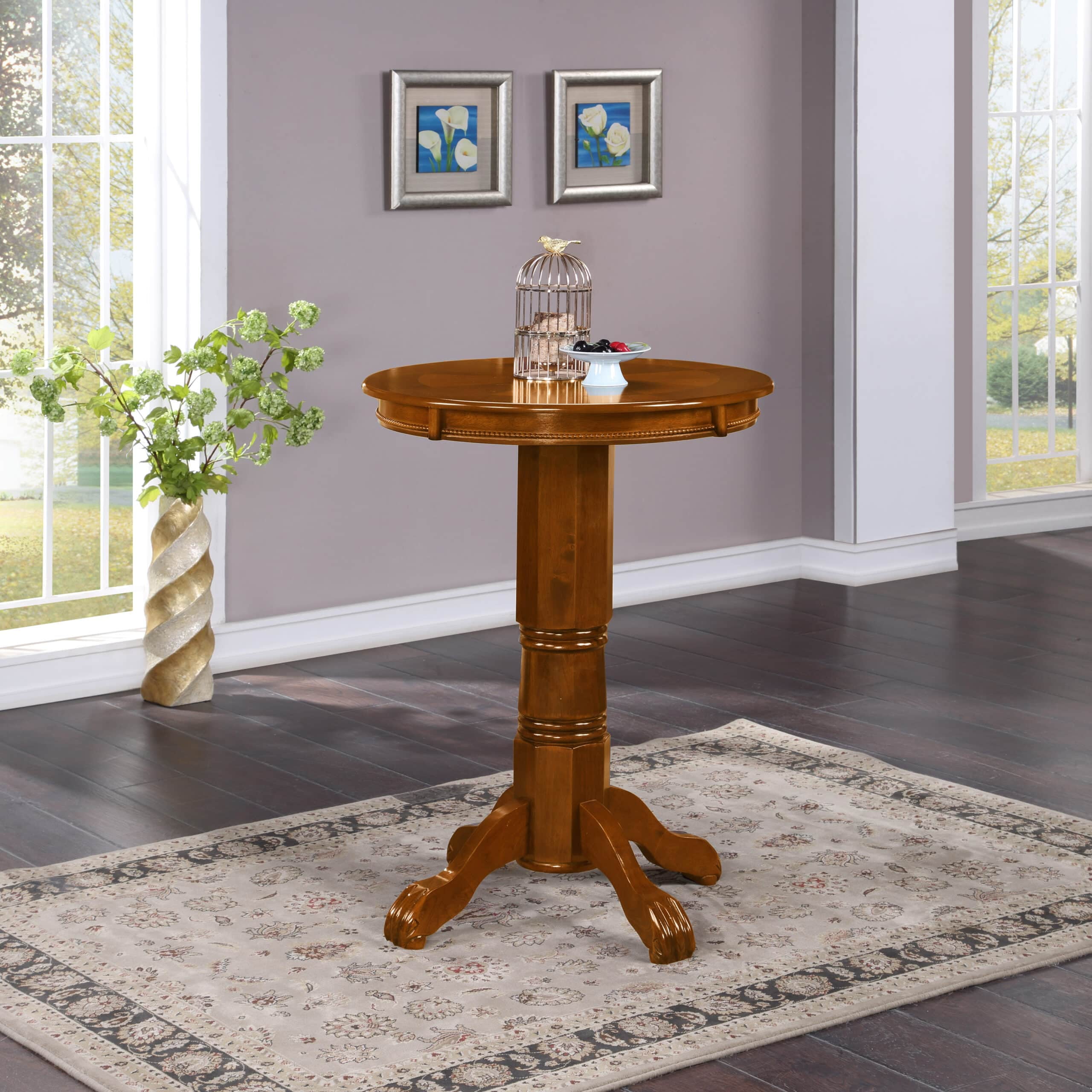 Constructed with hardwood Carved pedestal and apron Claw and ball feet Pairs nicely with our 29″ stools Wood veneer tabletop in sunburst design Dimensions: 30″w x 42″h x 30″d