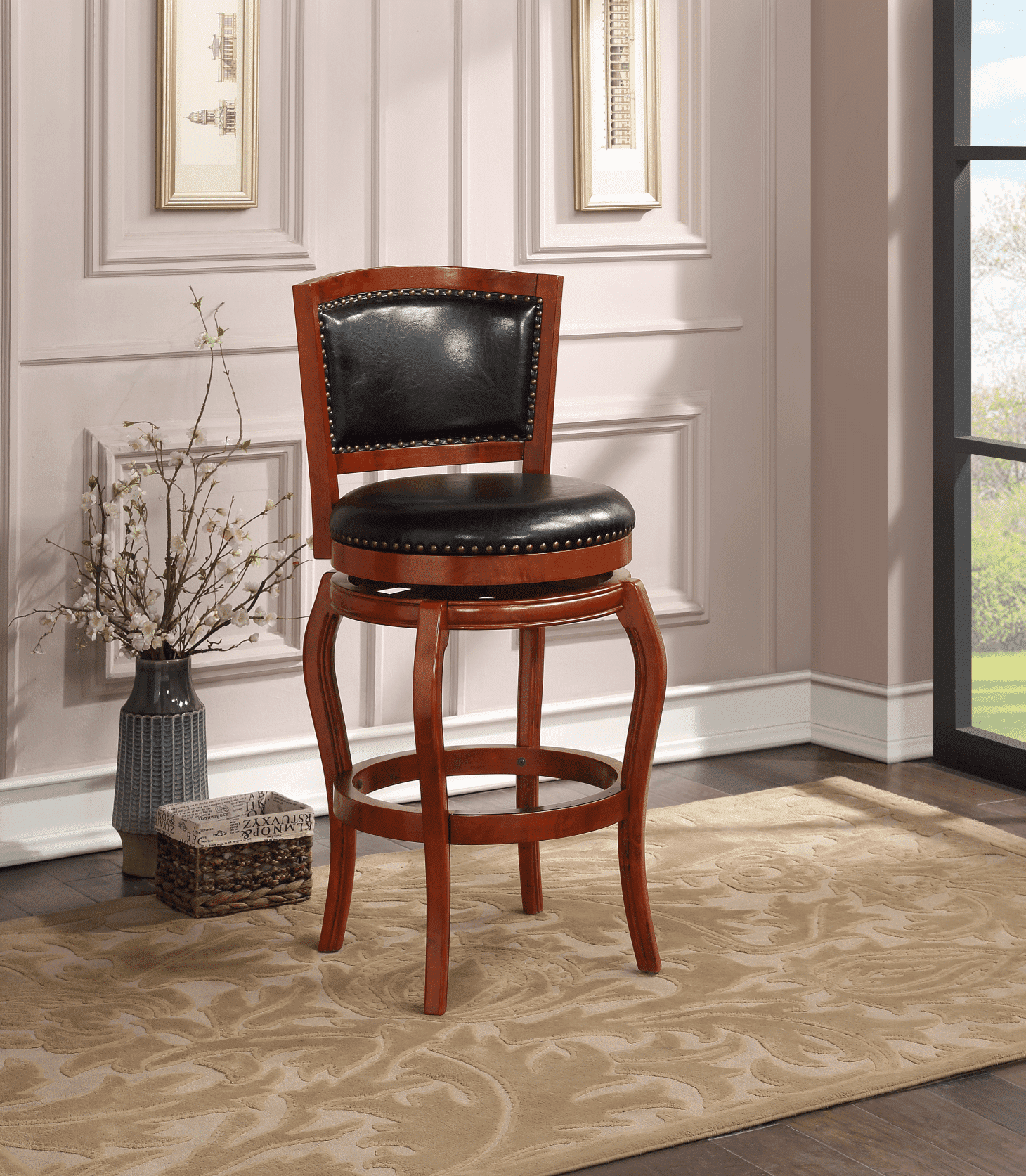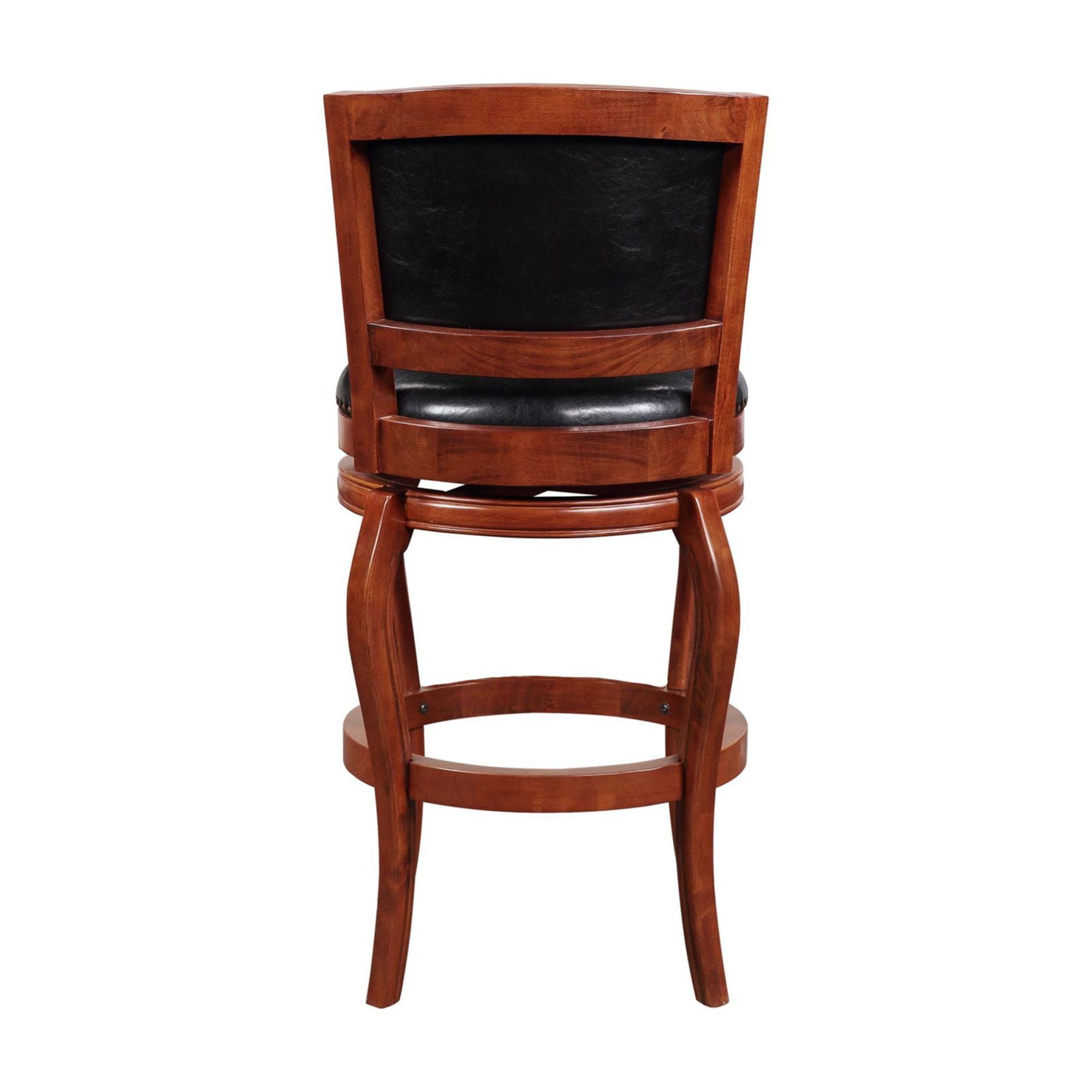360-Degree Swivel Seat Protective metal kick plate on the top of frontward facing footrest High density foam seat & backrest cushion Black faux leather upholstery Ships Semi-Assembled; minimum assembly required. Available in three different color finishes; cherry, cappuccino, & black Genuine brass nail heads applied individually by hand Made of durable wood Weight capacity: 250 pounds Dimensions: 24.5″W x 23.5″D x 44.5″H