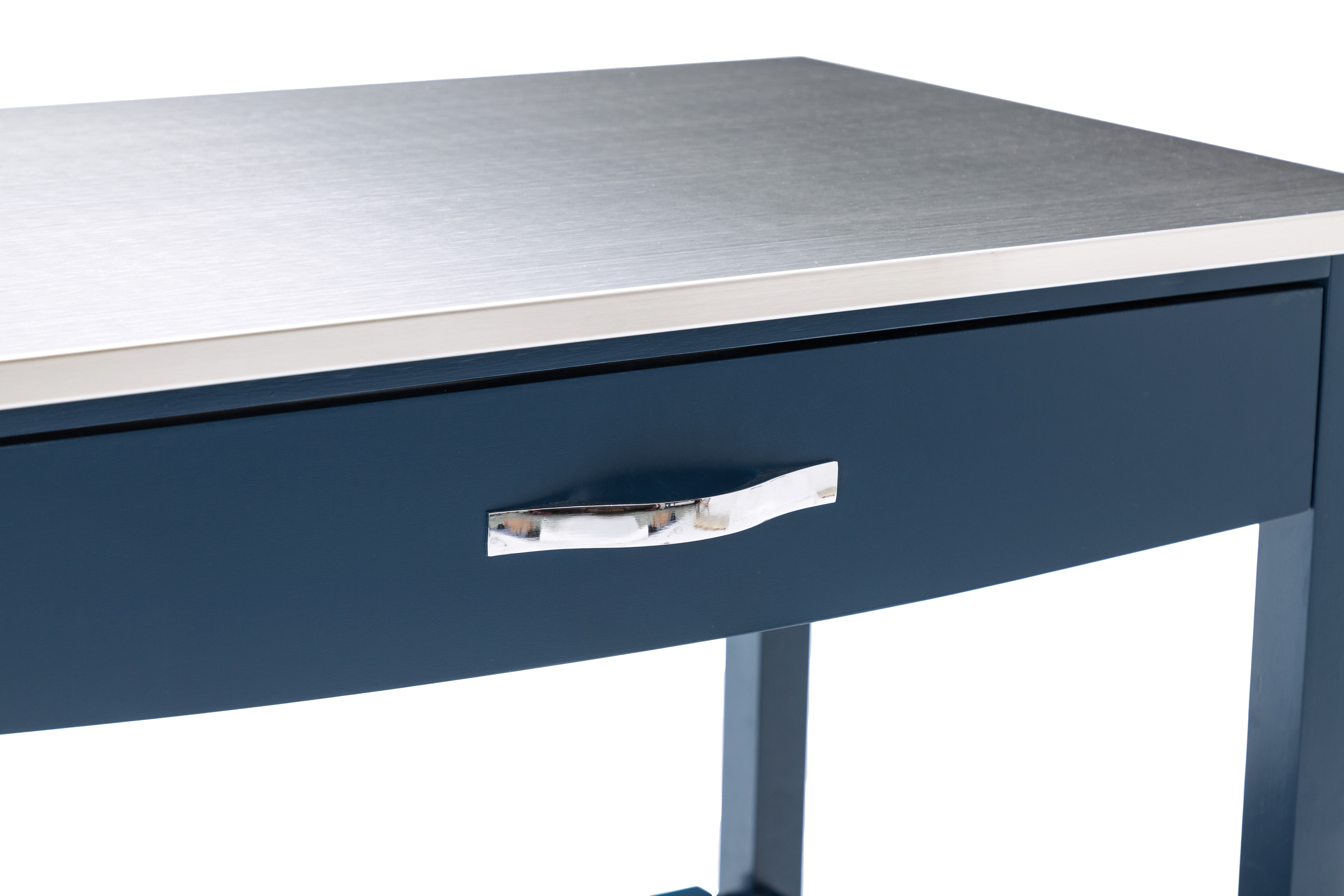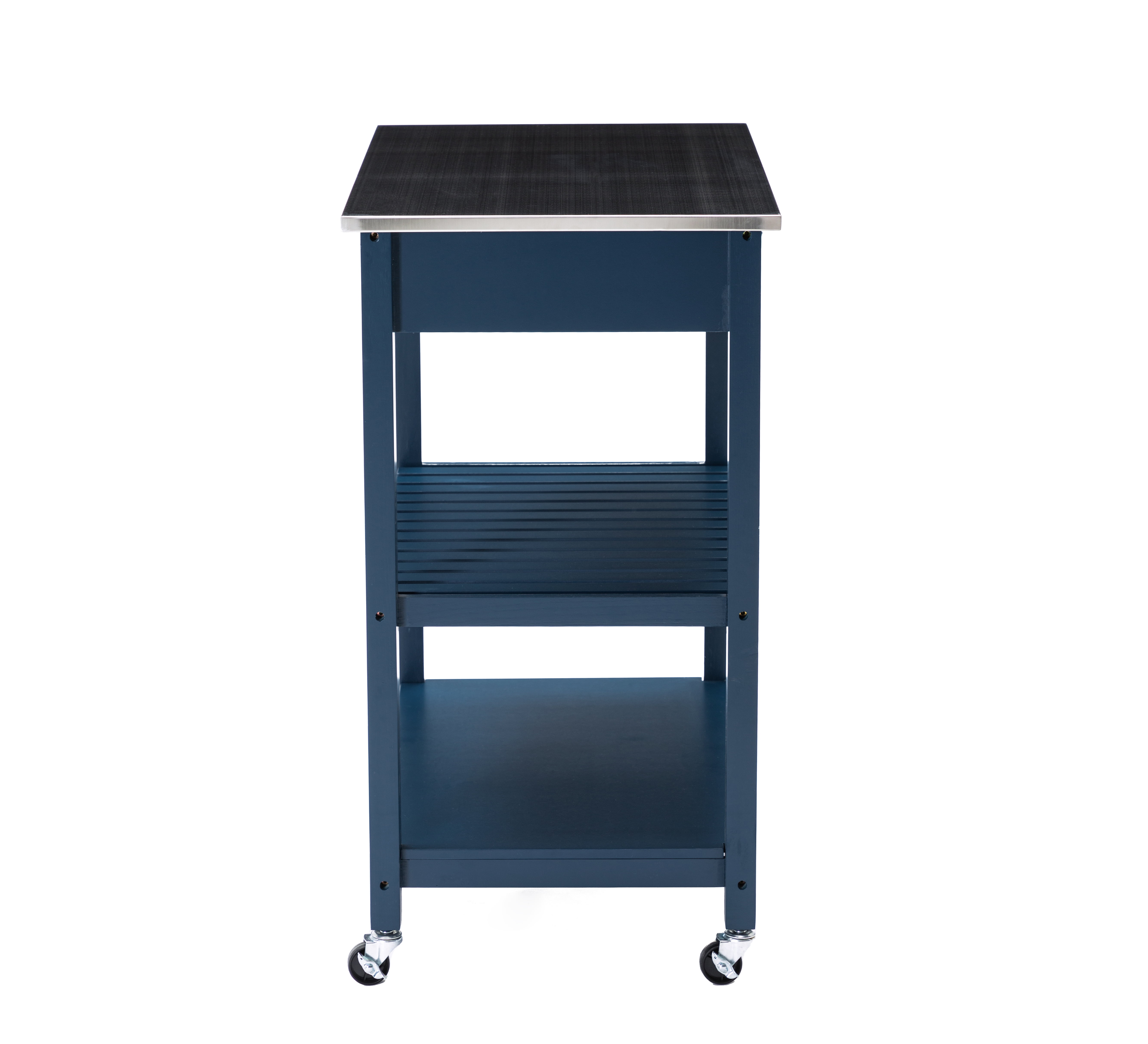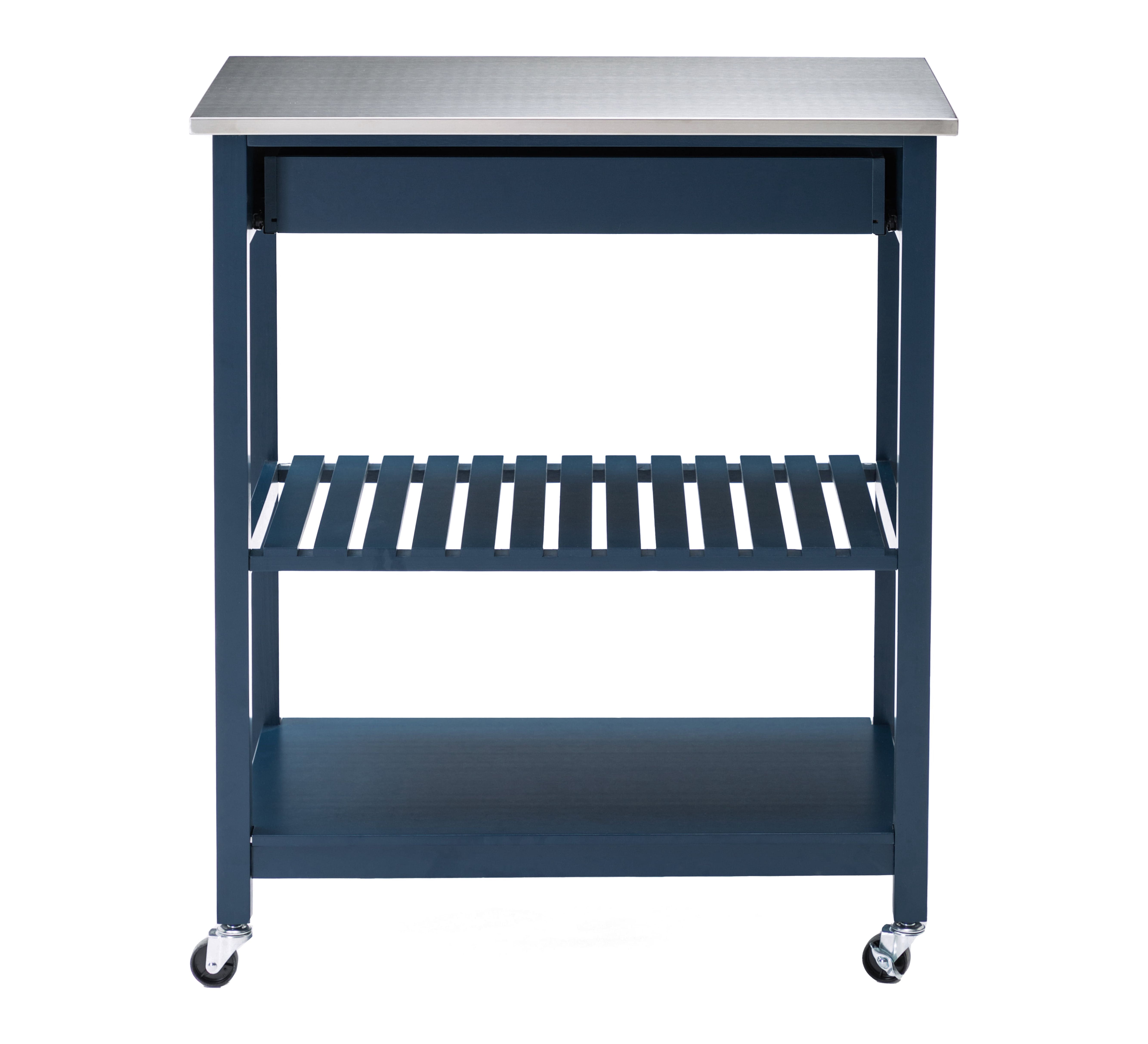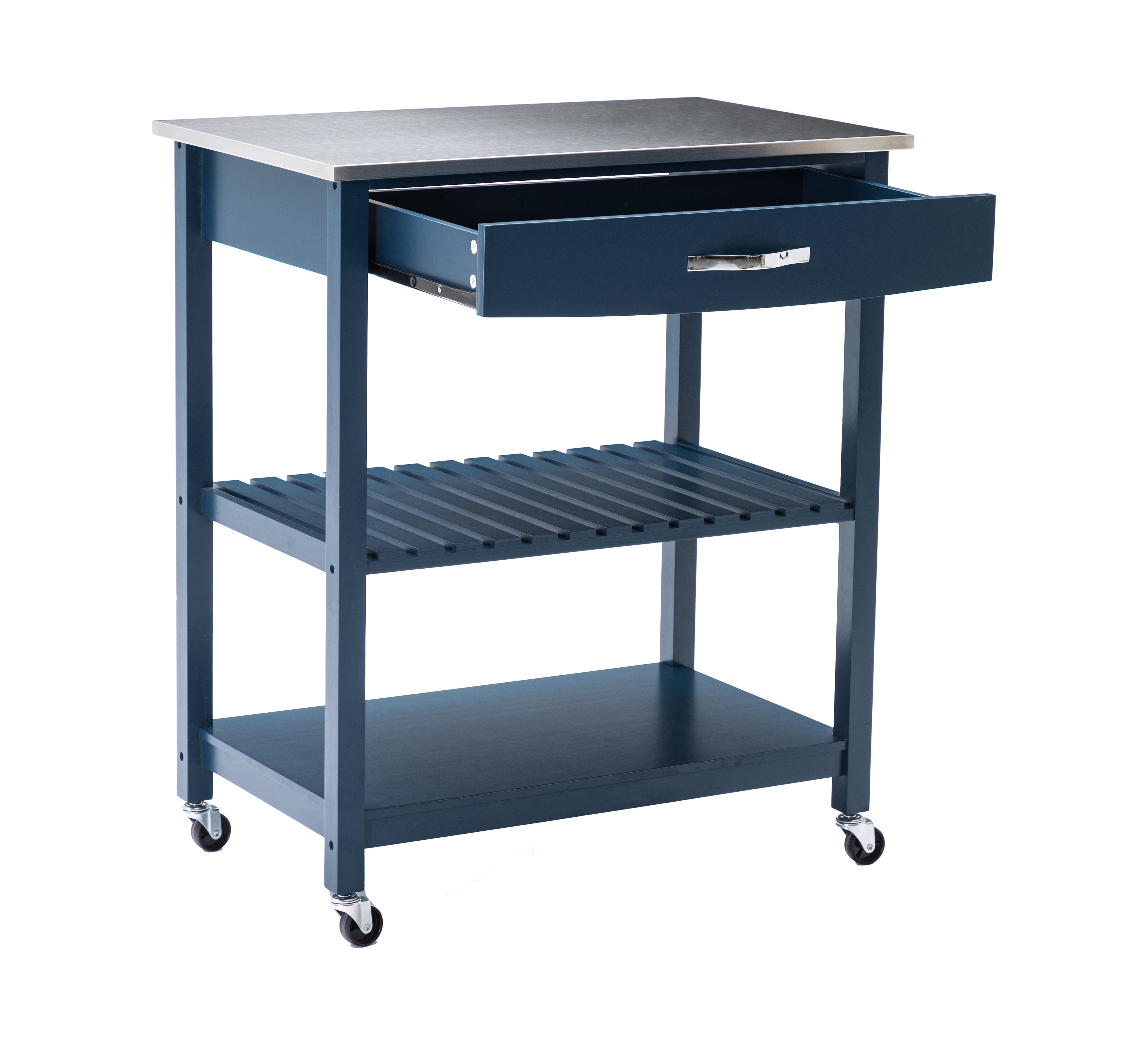 If you need a little extra storage and prep space for your kitchen, look no further than the Holland Kitchen Cart with Stainless Steel Top. This rolling kitchen cart also makes a great bar cart! Store dishes, glassware, cutlery, or your favorite spirits on the lower shelves. A slender drawer conveniently holds napkins, utensils, corkscrews, and other kitchen must-haves. Use the rolling caster wheels to roll this cart from the kitchen to the living room whenever guests are over, then wheel it back when it’s time to wash the dishes. It’s built from pine wood and medium density fiberboard with a stainless-steel work surface. Available in three finishes; Gray, Navy Blue, & White. Ready for assembly upon delivery.