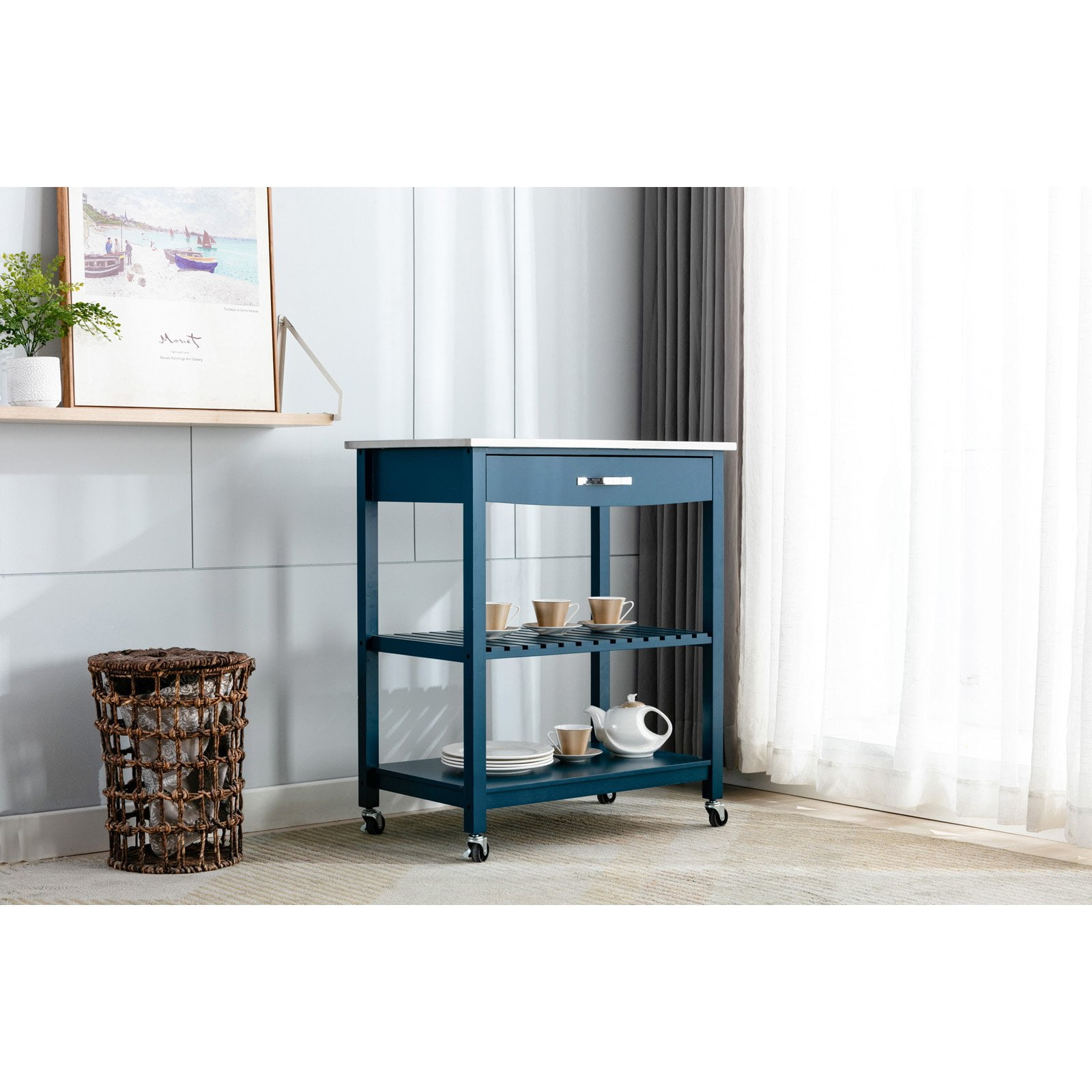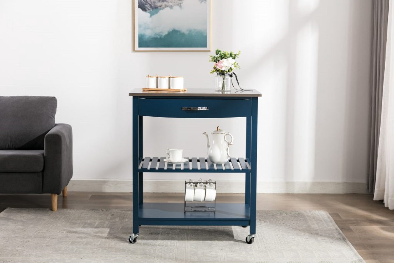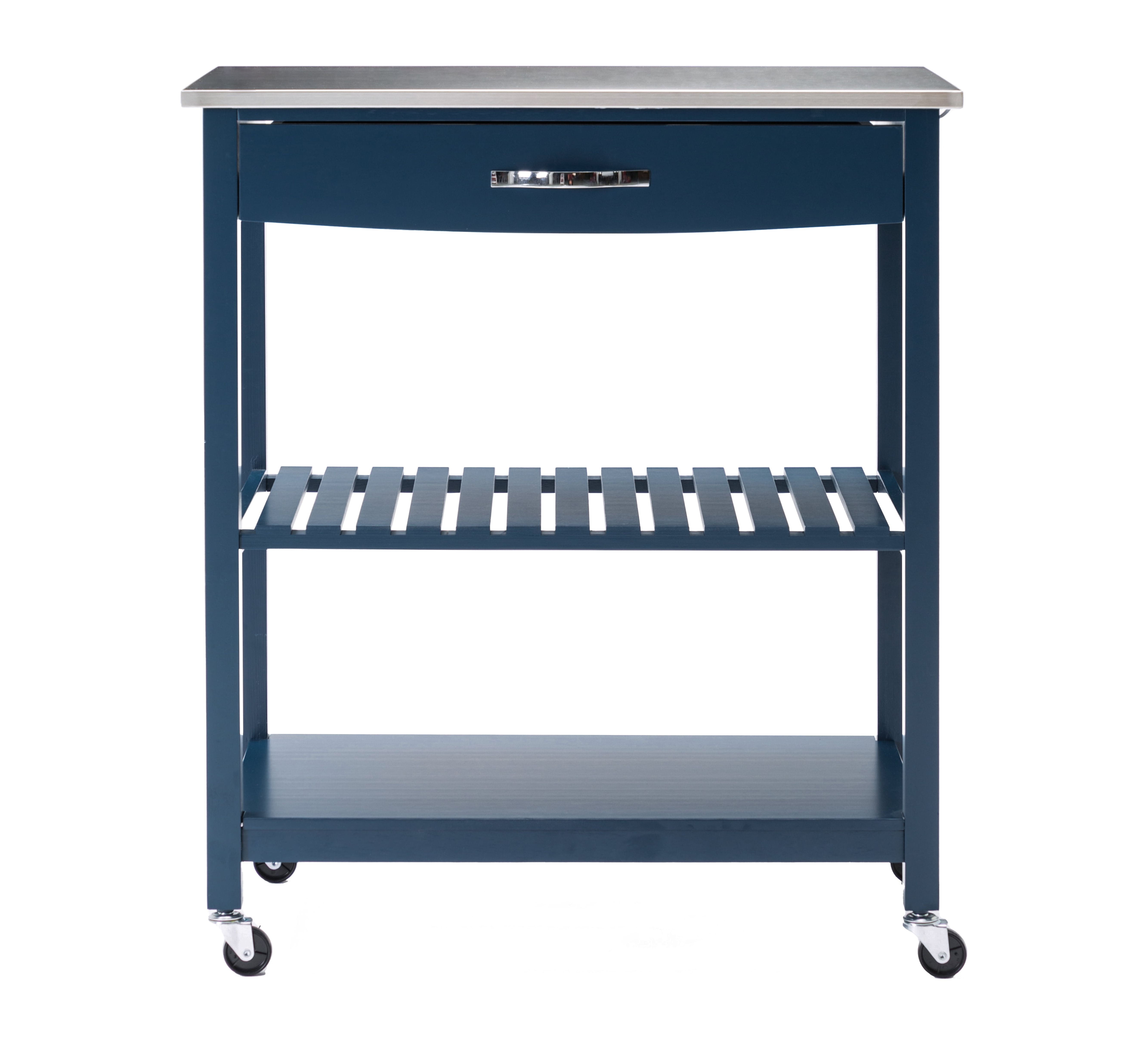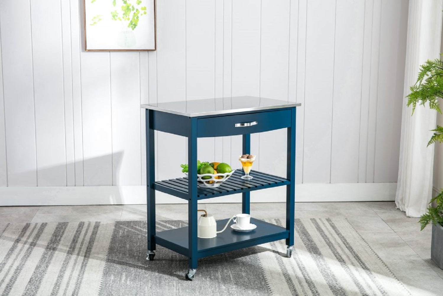 Boraam Holland Wood 36in. Kitchen Cart with Stainless Steel Top, Navy Blue Finish