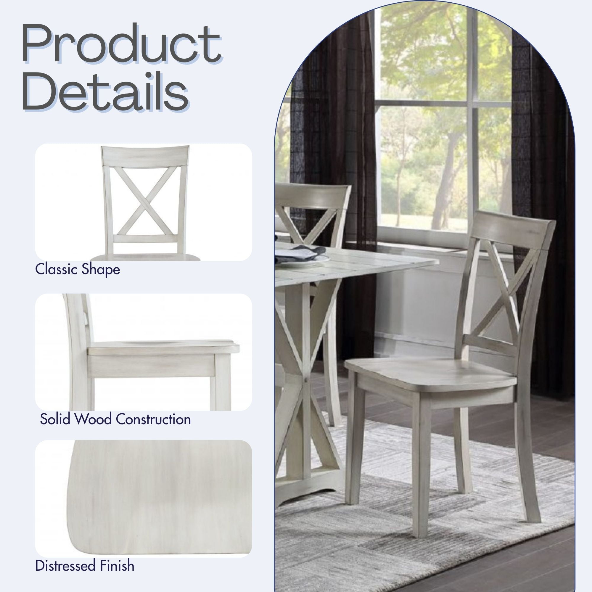 The Jamestown dining chairs comes as a set of 2 Constructed with MDF and solid wood Features a Antique White finish Features a decorative X-back Easy to assemble with all tools and hardware included Due to differences in monitors, mobile display settings, and home lighting, as well as variances in the finishing process, colors of products may appear different from those shown on the site