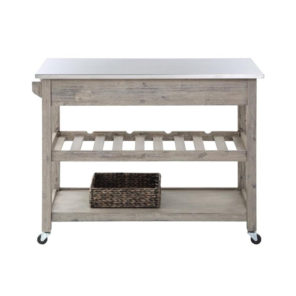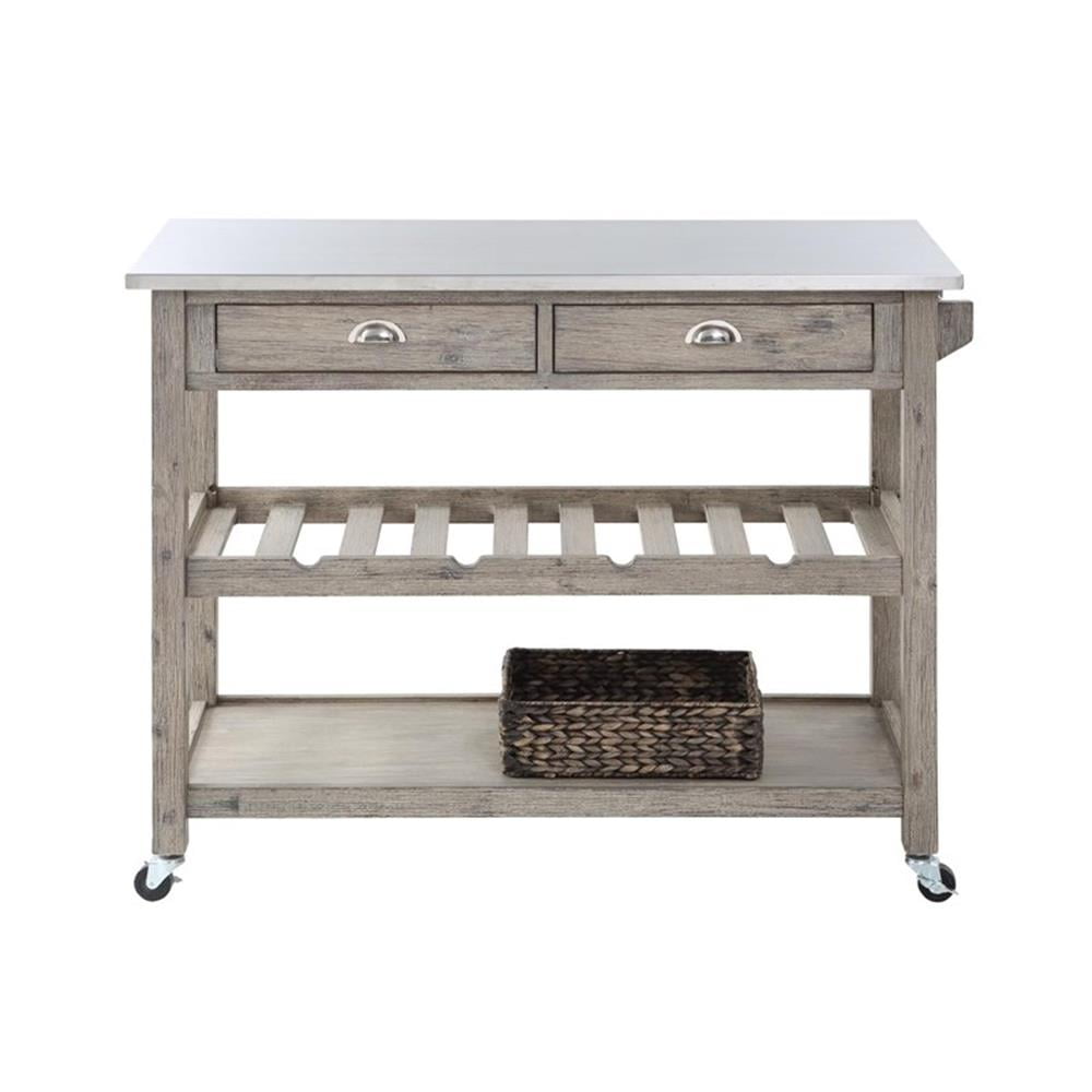 Your kitchen’s new best friend, the Montana Kitchen Cart offers versatility in an attractive rustic package. Built from acacia wood, the wood features a Light Barnwood Wire-Brush finish that highlights the wood grain. A perfect food prep area, the stainless-steel countertop -increase the size of your work surface. Storage features include an open lower shelf and two drawers, plus an adjustable wine rack capable of holding four bottles. This kitchen cart also includes a storage basket, made from woven water hyacinth. The basket measures 14.17 x 11 x 4.33 inches. Complete your dining room or kitchen with the matching Montana Dining Table and Montana Dining Chairs (both sold separately). Features: Constructed with solid acacia wood Open wine rack holds up-to 4 wine bottles 2 storage drawers and towel bar Locking caster wheels for easy portability Part of Boraam’s Montana Dining Collection Specifications: Assembly Required: Yes Color/Finish: Light Barnwood Wire-Brush Commercial/Residential: Residential Only Number of Drawers: 2 Number of Shelves: 1 Wine Bottle Capacity: 4 Product Dimensions: 45″w x 35.75″h x 20.5″d Product Weight: 64 lbs.