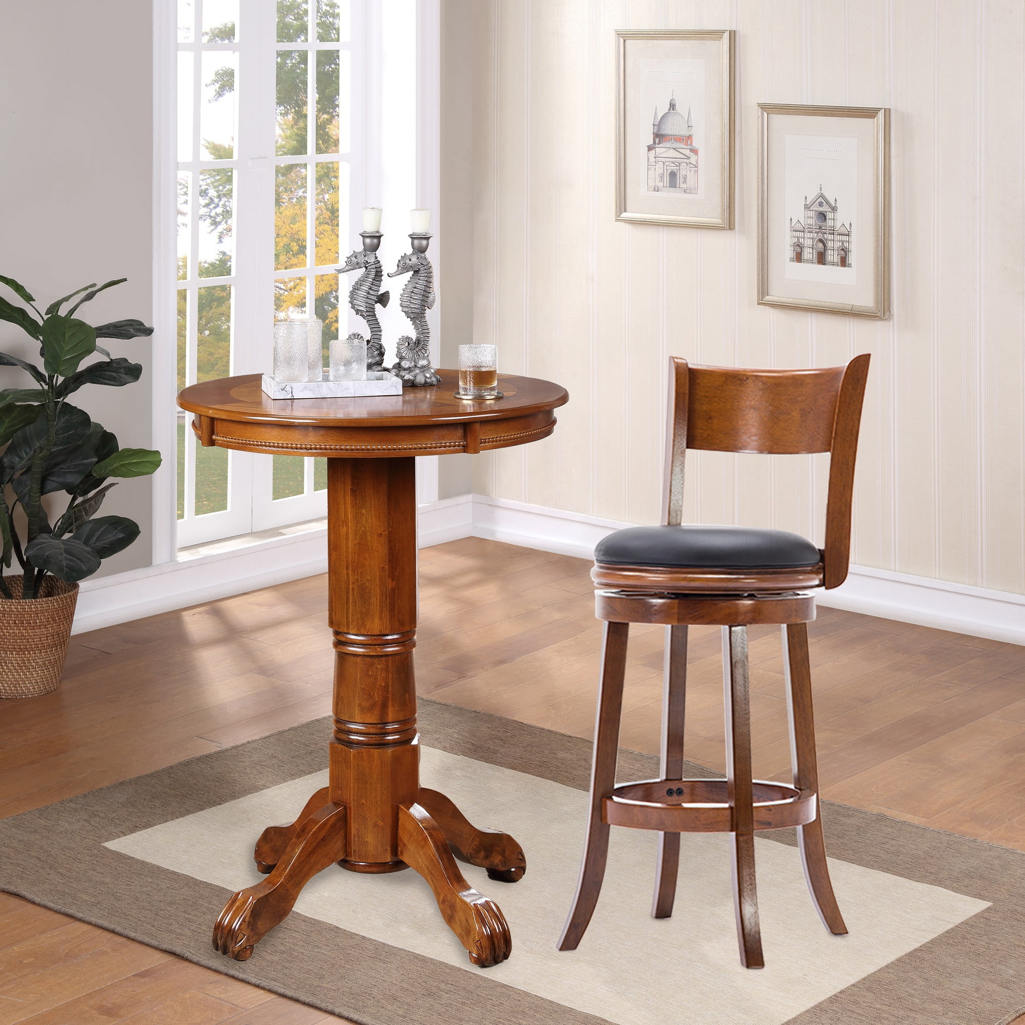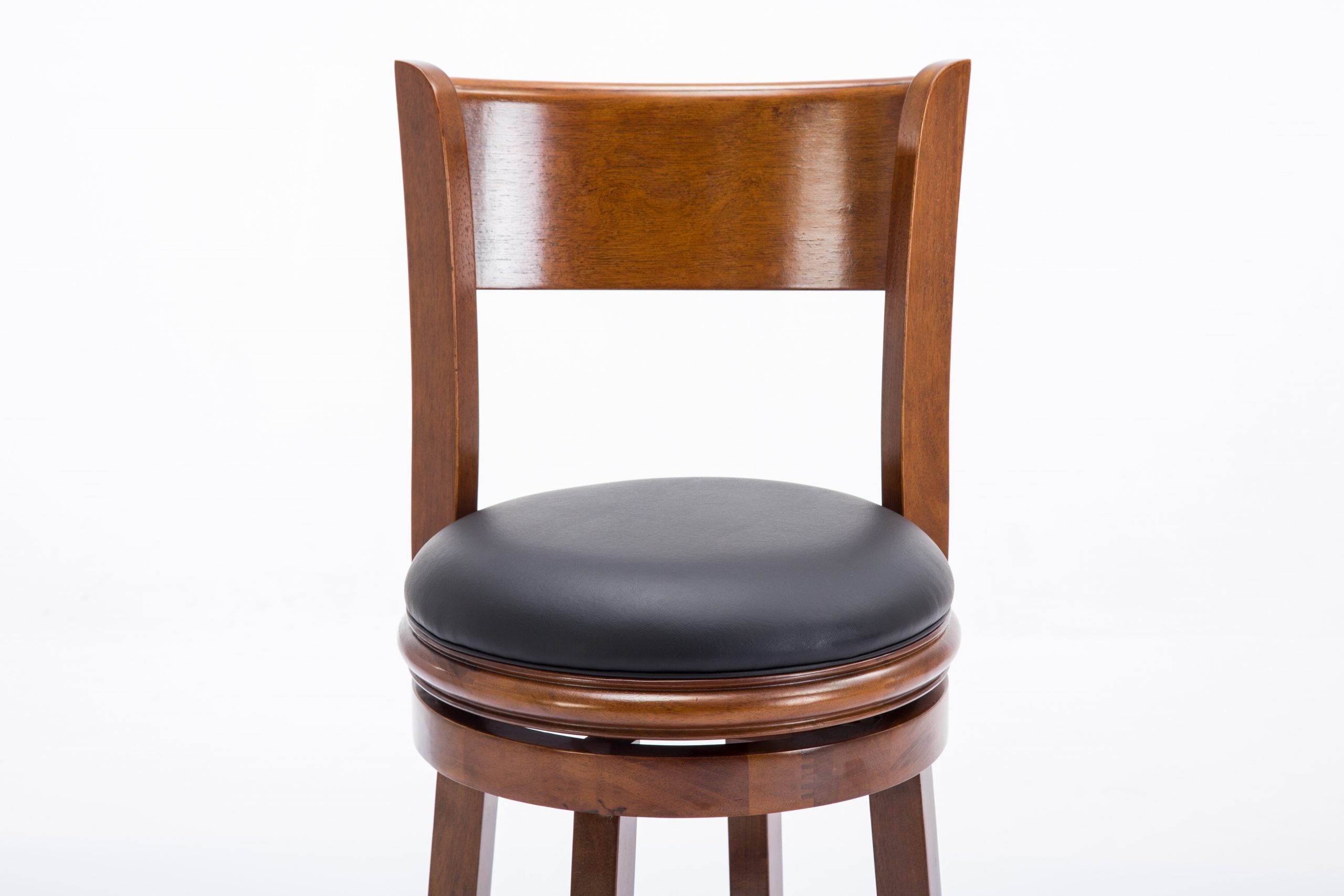 Add additional seating and an extra touch of style to your kitchen, dining room or bar with the Palmetto Swivel Counter Height Stool. It is made of solid fruitwood to ensure long-lasting durability. Black faux leather covers high-density foam, and that it easily blends in with all types of home decor. The wooden swivel stool turns a full 360 degrees, due to the durable ball bearing design. It is a versatile piece that can be placed just about anywhere. There’s no wobble with this 24″ swivel stool, fruitwood, as it features flared legs and a footrest for superior comfort and stability. Designed for use in your kitchen, dining room or game area, it is also a good choice for breakfast nooks, islands and bars. Whether it is just a casual family dinner or a party for family and friends, the wooden swivel stool brings both extra seating and extra style any room in your home.