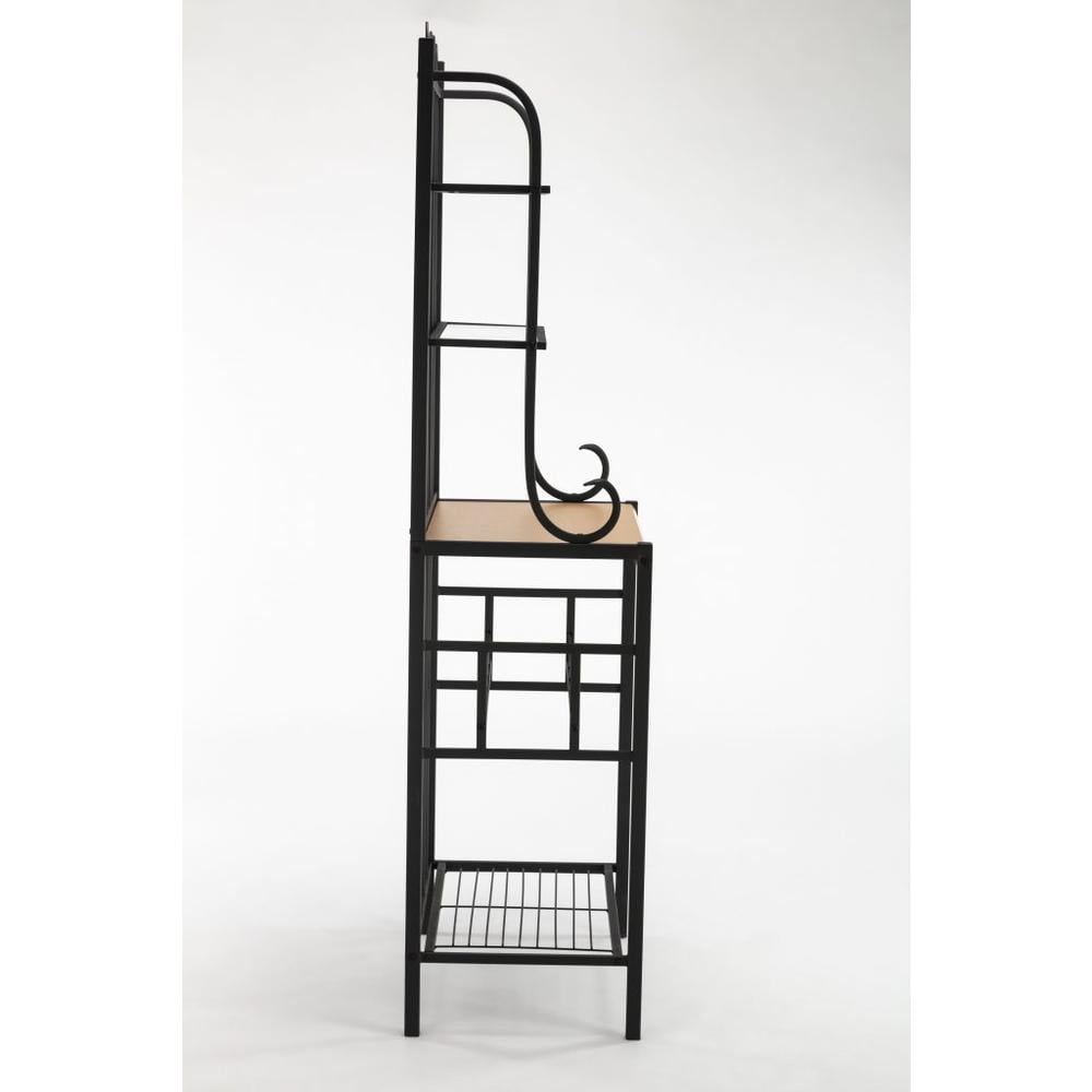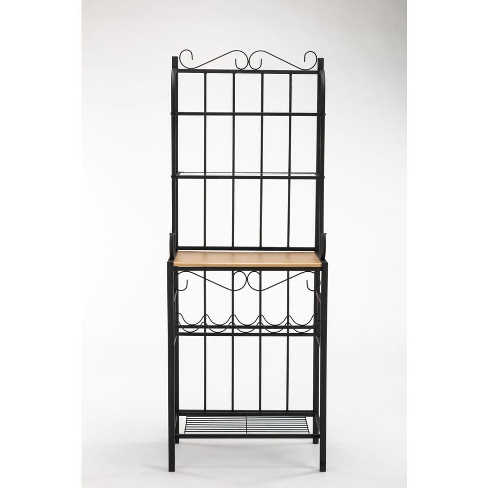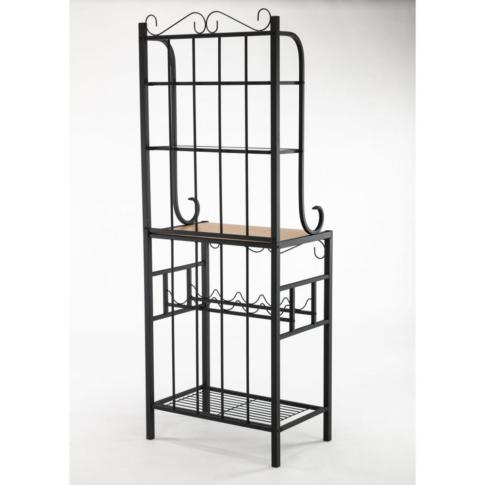 Boraam Praha 68″ 4-Teir Metal Baker’s Rack – Black Finish Black powder-coated finish Sturdy steel construction 4 shelves for storage 5 wine bottle holders The main shelf is made with MDF & wood-like paper veneer