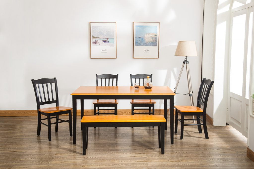 Boraam Shaker 6-Piece Dining Set: Set includes table, bench and 4 chairs Comes with a choice of 3 different color finishes: walnut, oak and black/oak Classic shaker leg adds style and stability Table legs and apron are made with solid hardwood for quality that lasts Assembly required; all tools and hardware for assembly included for easy and quick assembly Chair seat dimensions: 17″W x 16″D 3″ thick table apron 1.5″ thick tabletop Table leg is 2.25″ x 2.25″ at the top Table leg is 1.5″ x 1.5″ at very bottom Chair backrest height measured from the seat is 19.5″ Bench seat is 15″W x 44″D Bench legs are 1.5″ thick
