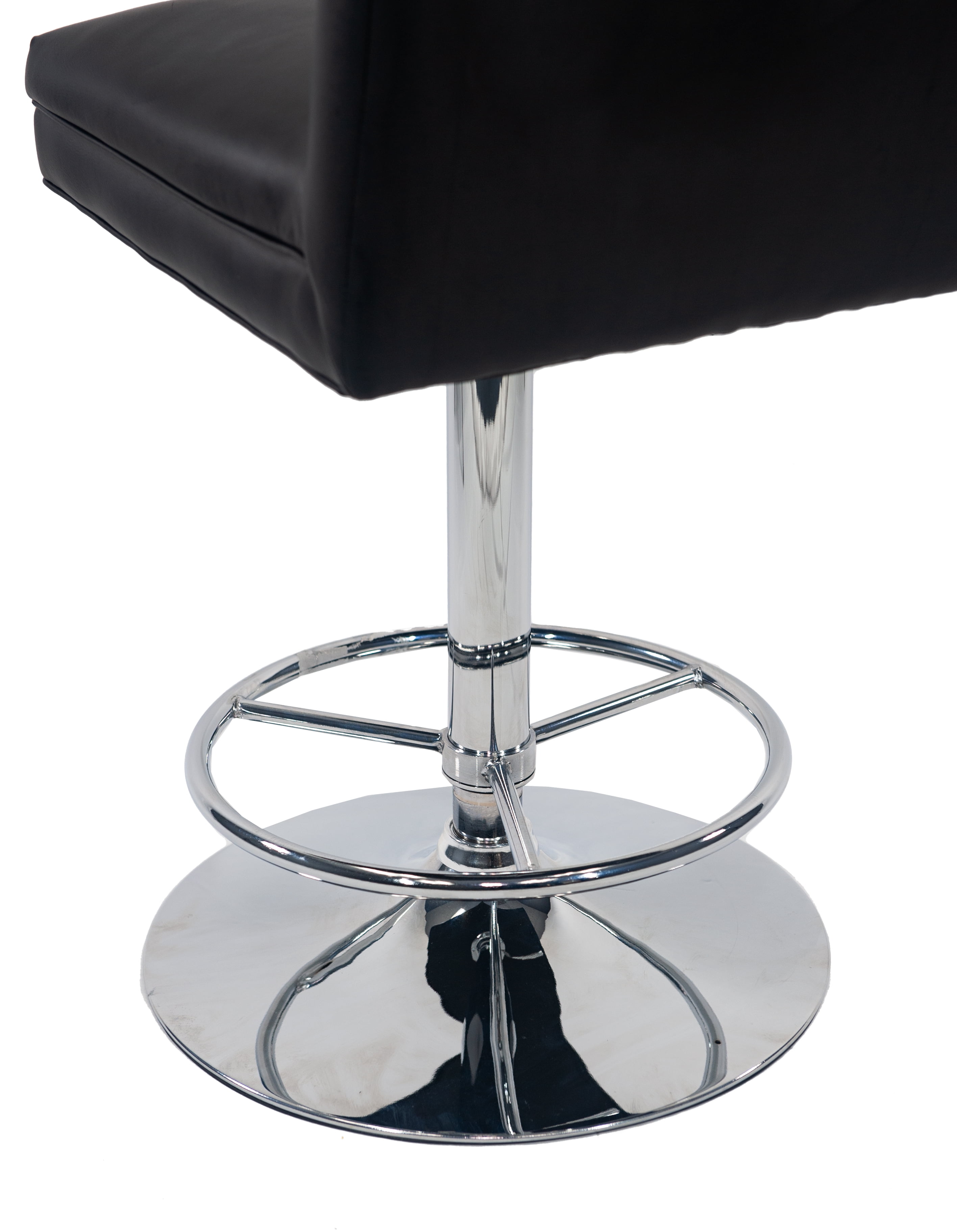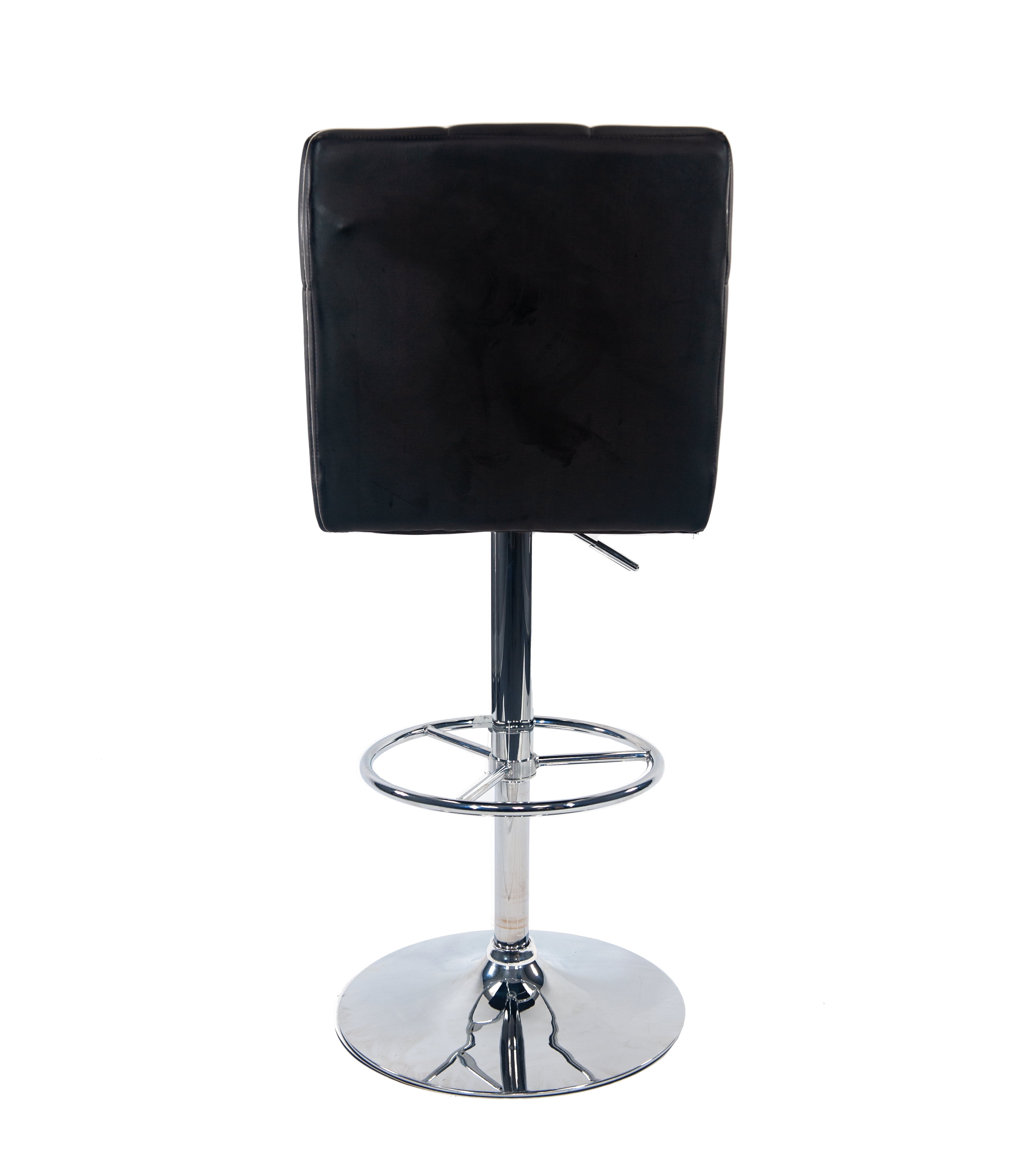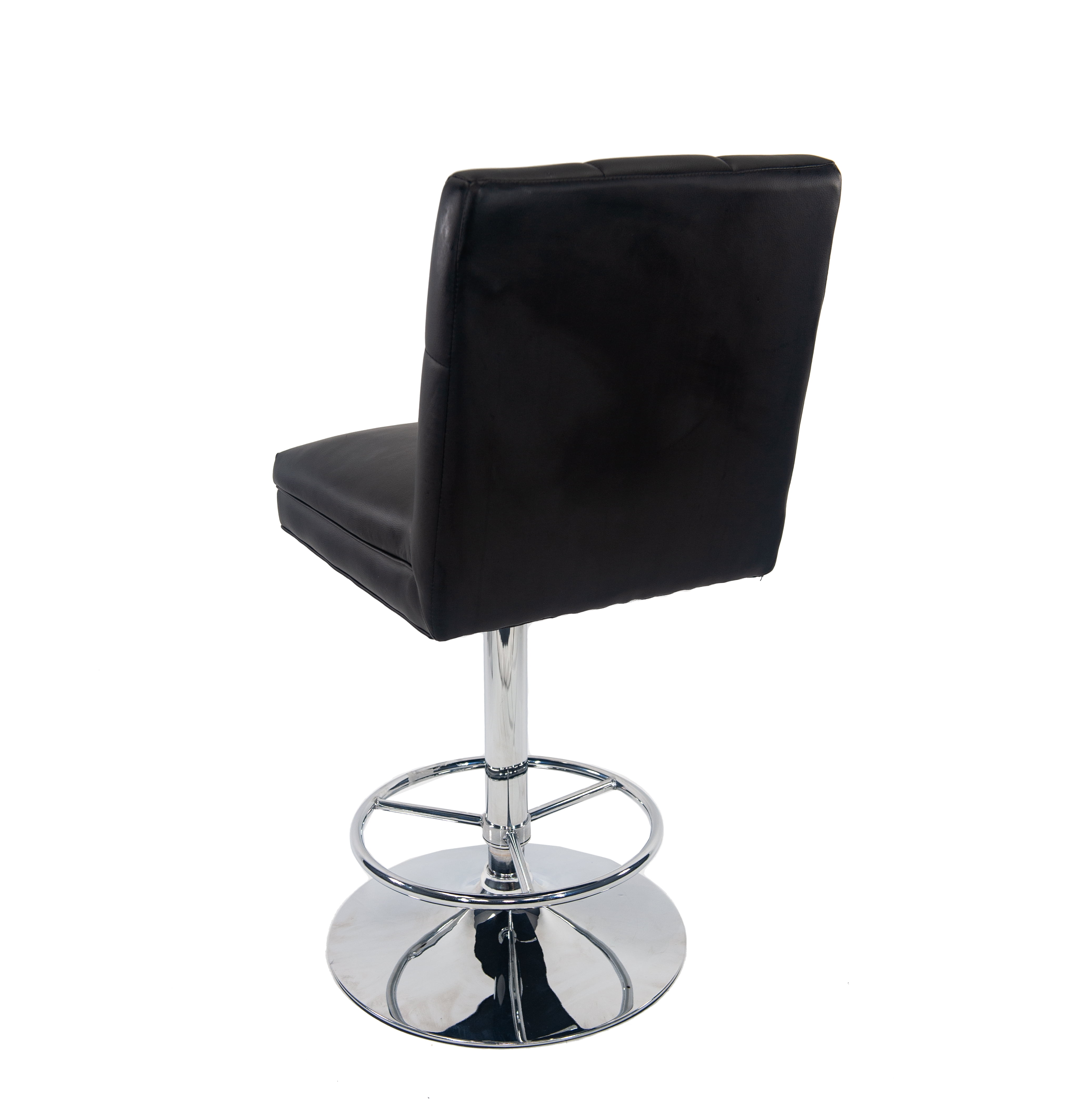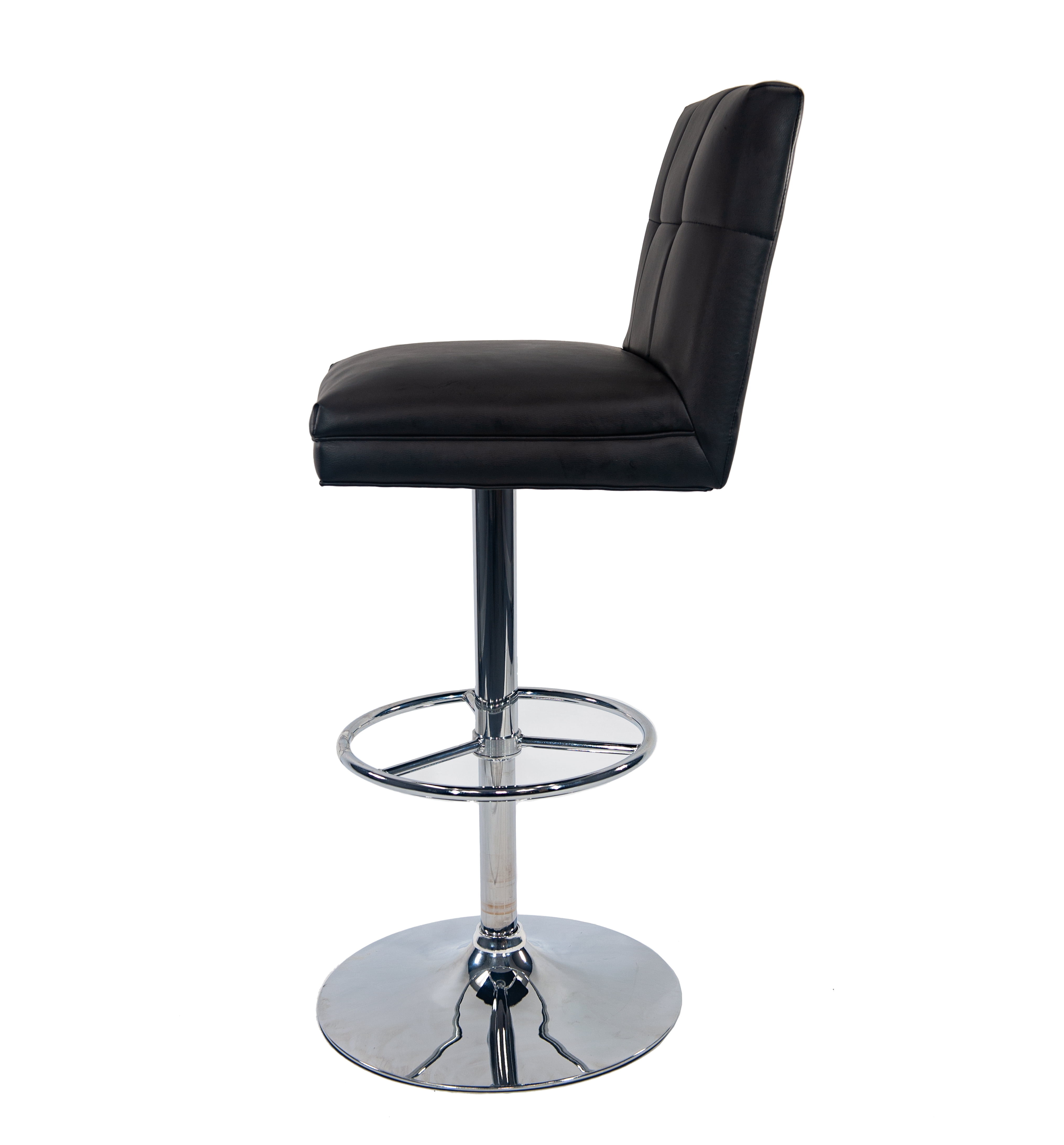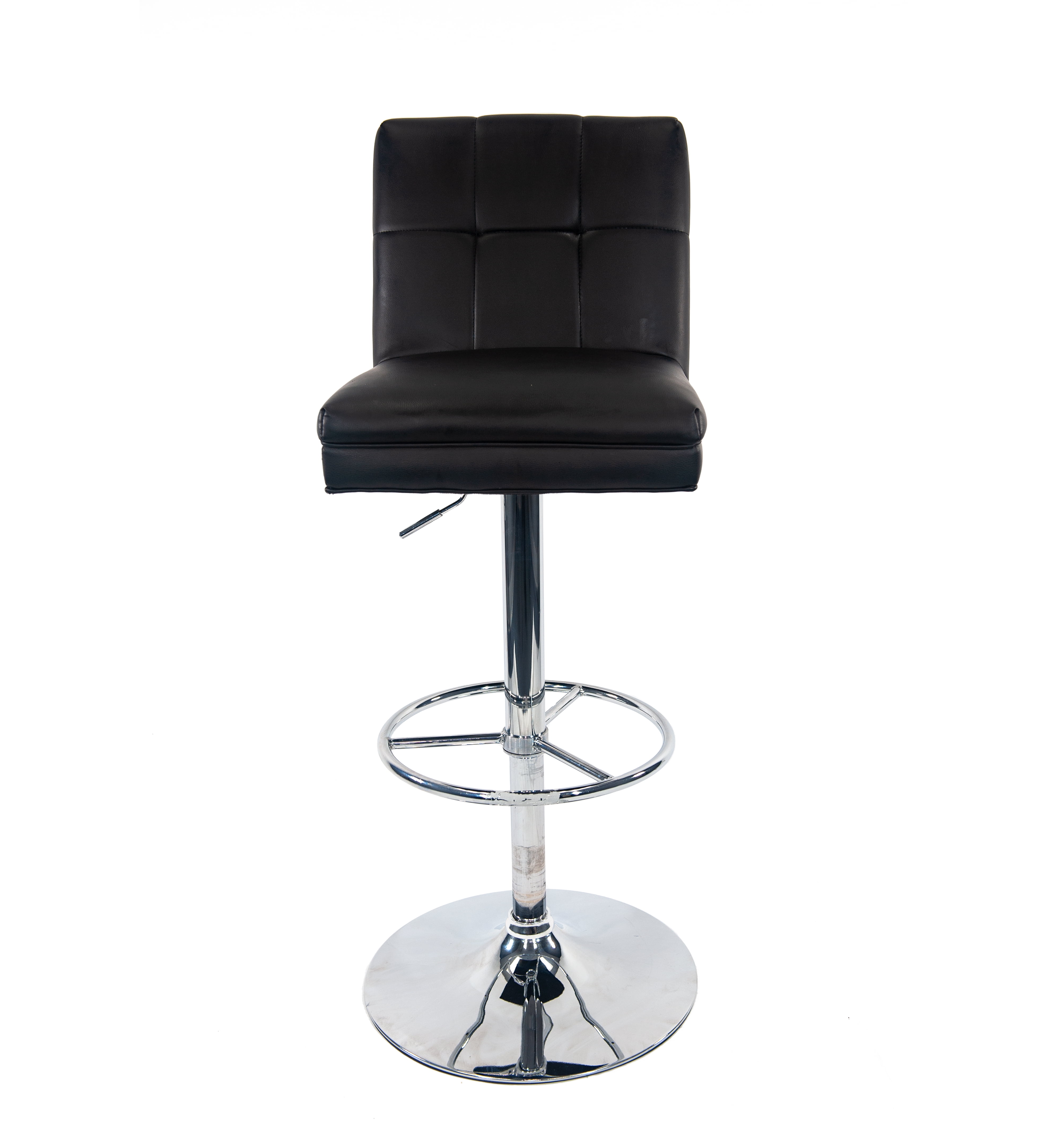 Sloan Adjustable Swivel Stool [Black] Chrome-finished steel base for strength and longevity Tufted faux leather upholstered seat and back The Sloan barstool is adjustable from counter to pub height for added convenience The seat of bar stool can 360˚ swivel, you can switch directions freely to chat with your family and friends. The adjustable seat height will meet your personal needs, you can adjust to different seat height for various sitting position Full-ring footrest provides strength and stability This adjustable bar stool combines both fashion and practicality, perfect for home bar, game room, kitchen, home office, or living room space