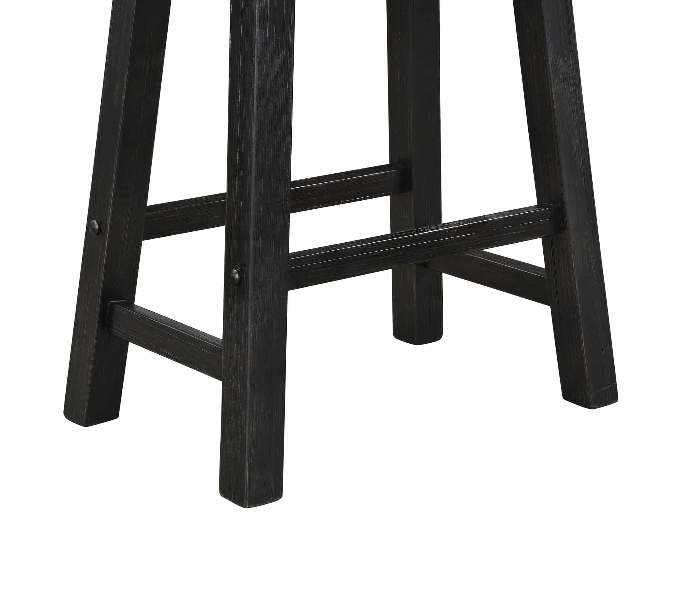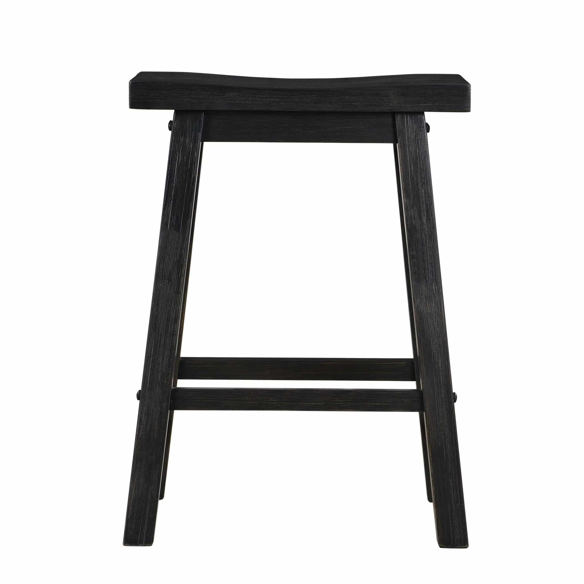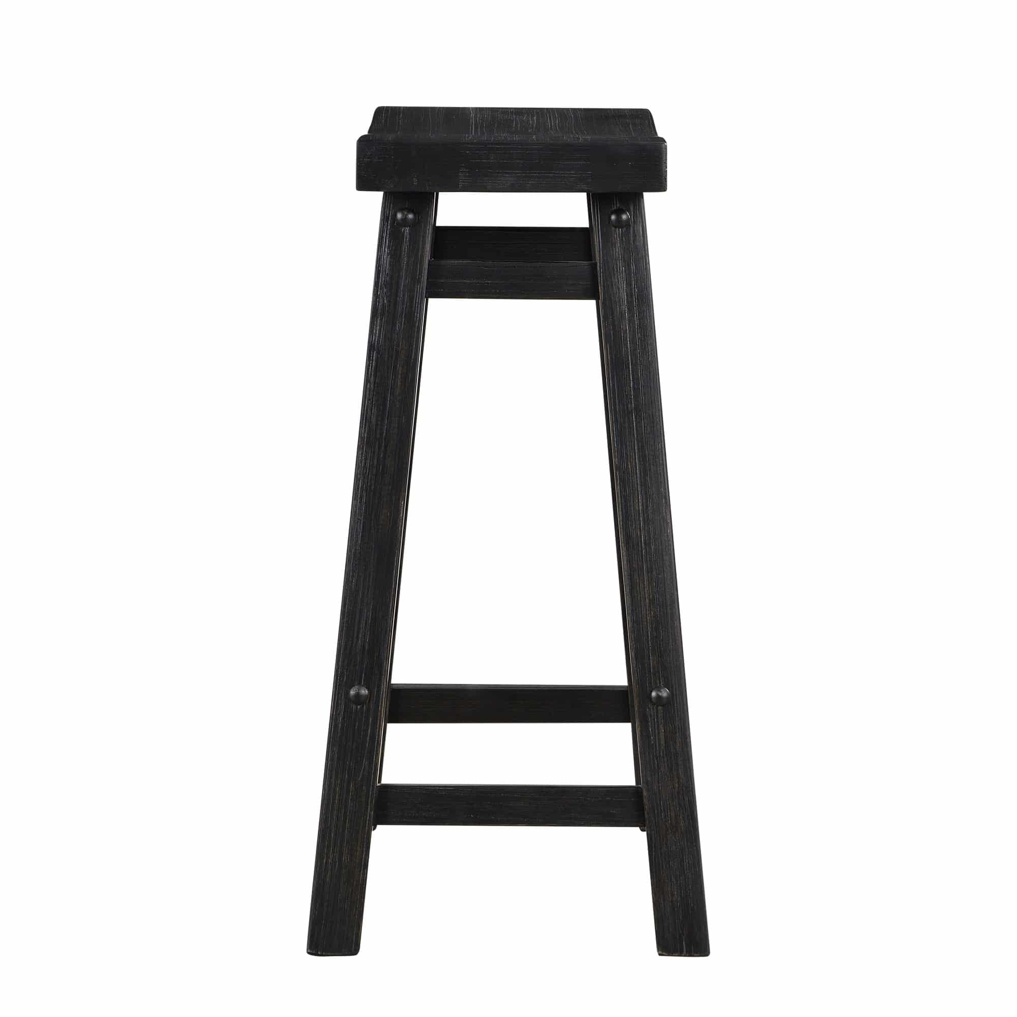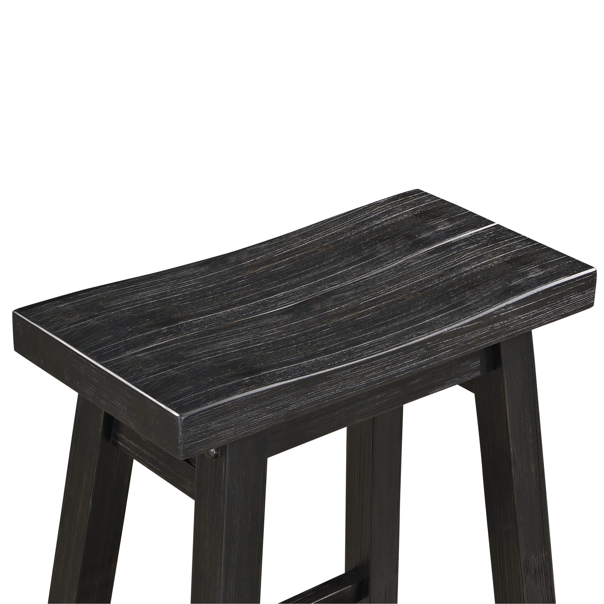 Material: Acacia Wood Finish: Black charcoal Multi-step wire-brush finish for rustic style Ergonomic saddle seat Stability stretchers on base double as footrests