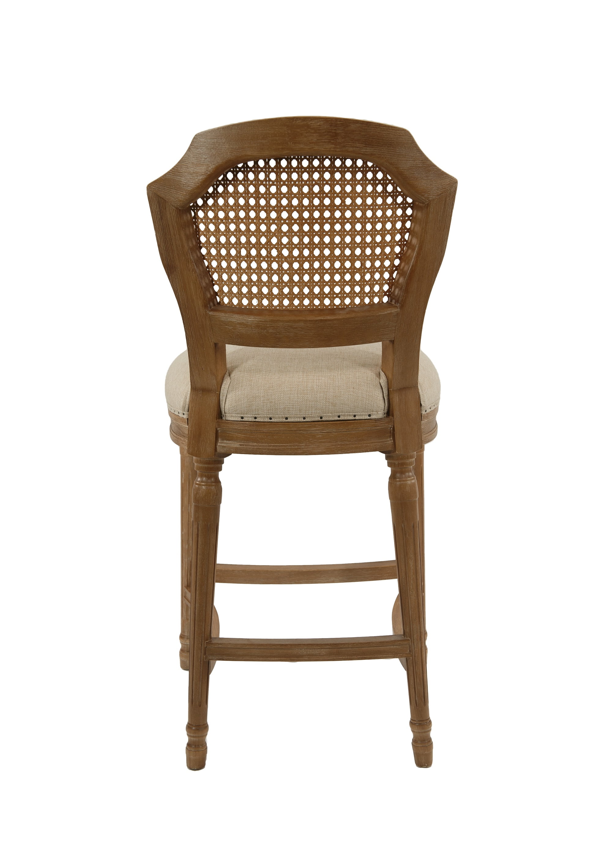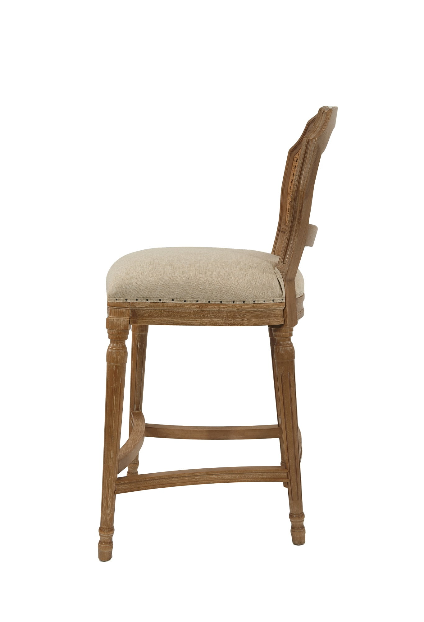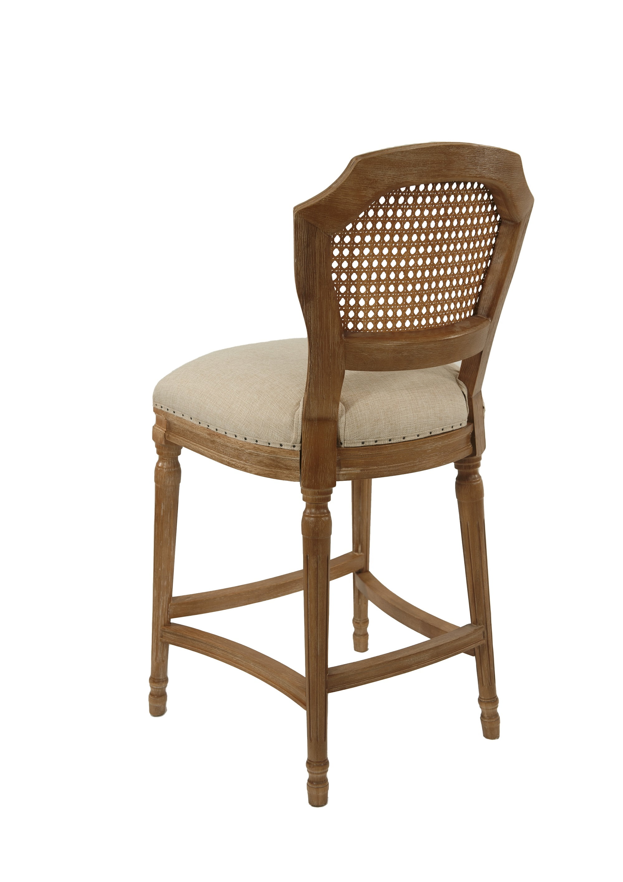 Dimensions: 18.25W x 23D x 38.75H in. Seat height: 27.5 in. Padded cushion seat with mesh backrest for comfort Sturdy oak wood construction Tan linen seat Subtle nailhead trim around seat Ornate legs with footrest Intended for residential use Hardware included for easy assembly Includes a manufacturer’s limited 90-day warranty