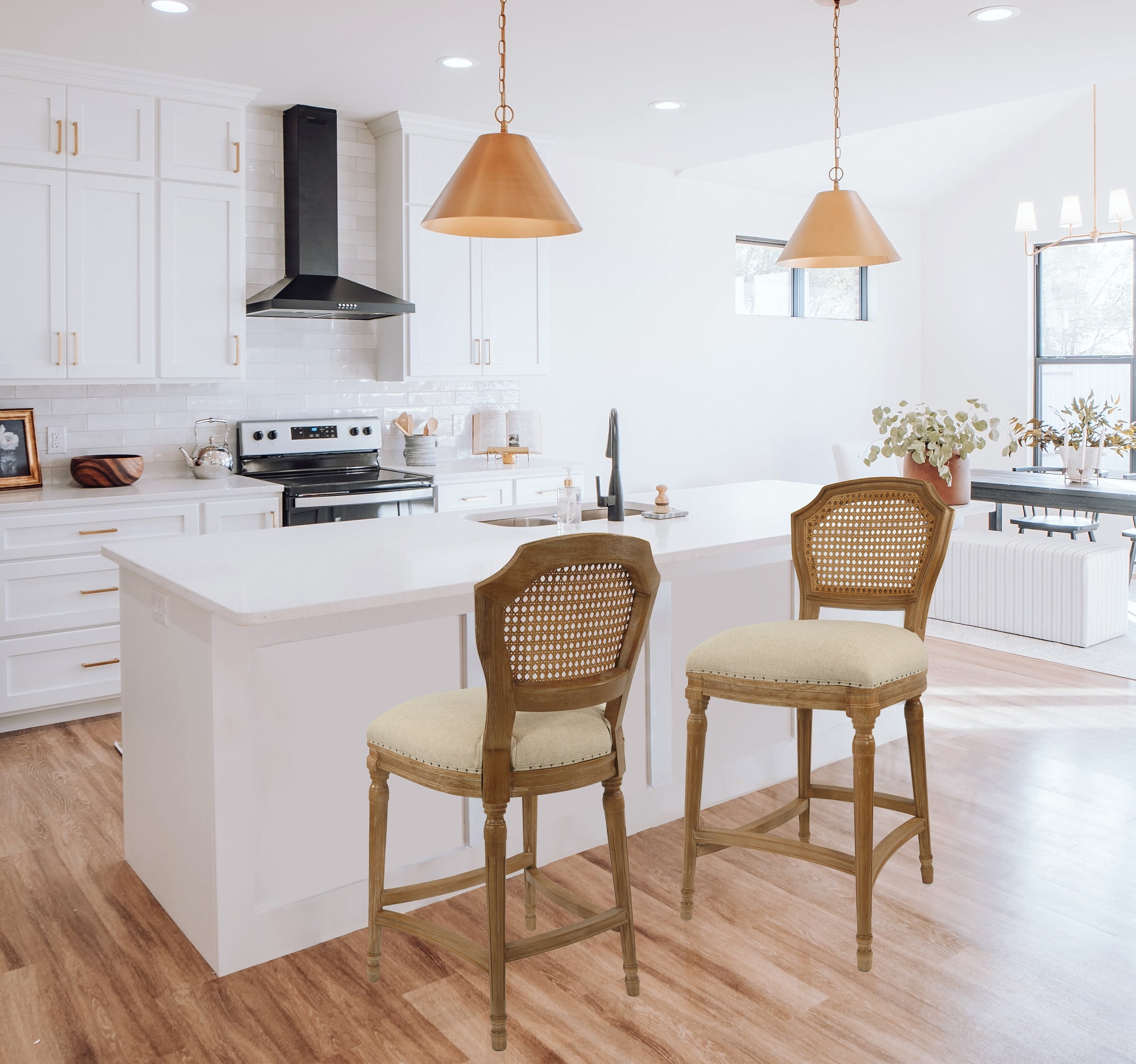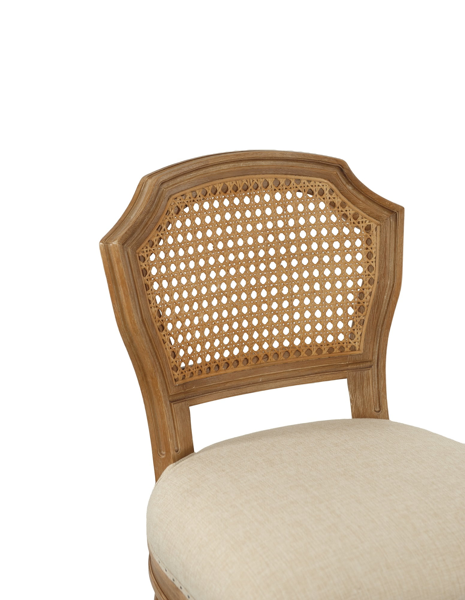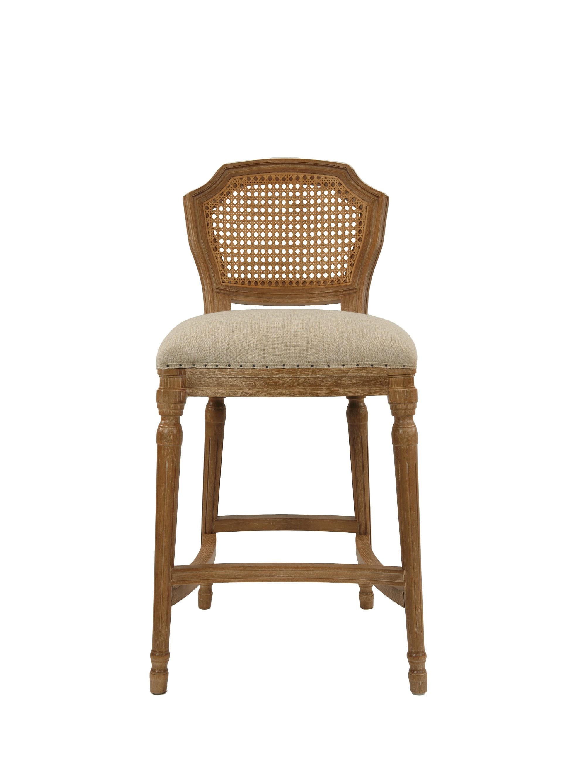 Dimensions: 18.25W x 23D x 38.75H in. Seat height: 27.5 in. Padded cushion seat with mesh backrest for comfort Sturdy oak wood construction Tan linen seat Subtle nailhead trim around seat Ornate legs with footrest Intended for residential use Hardware included for easy assembly Includes a manufacturer’s limited 90-day warranty