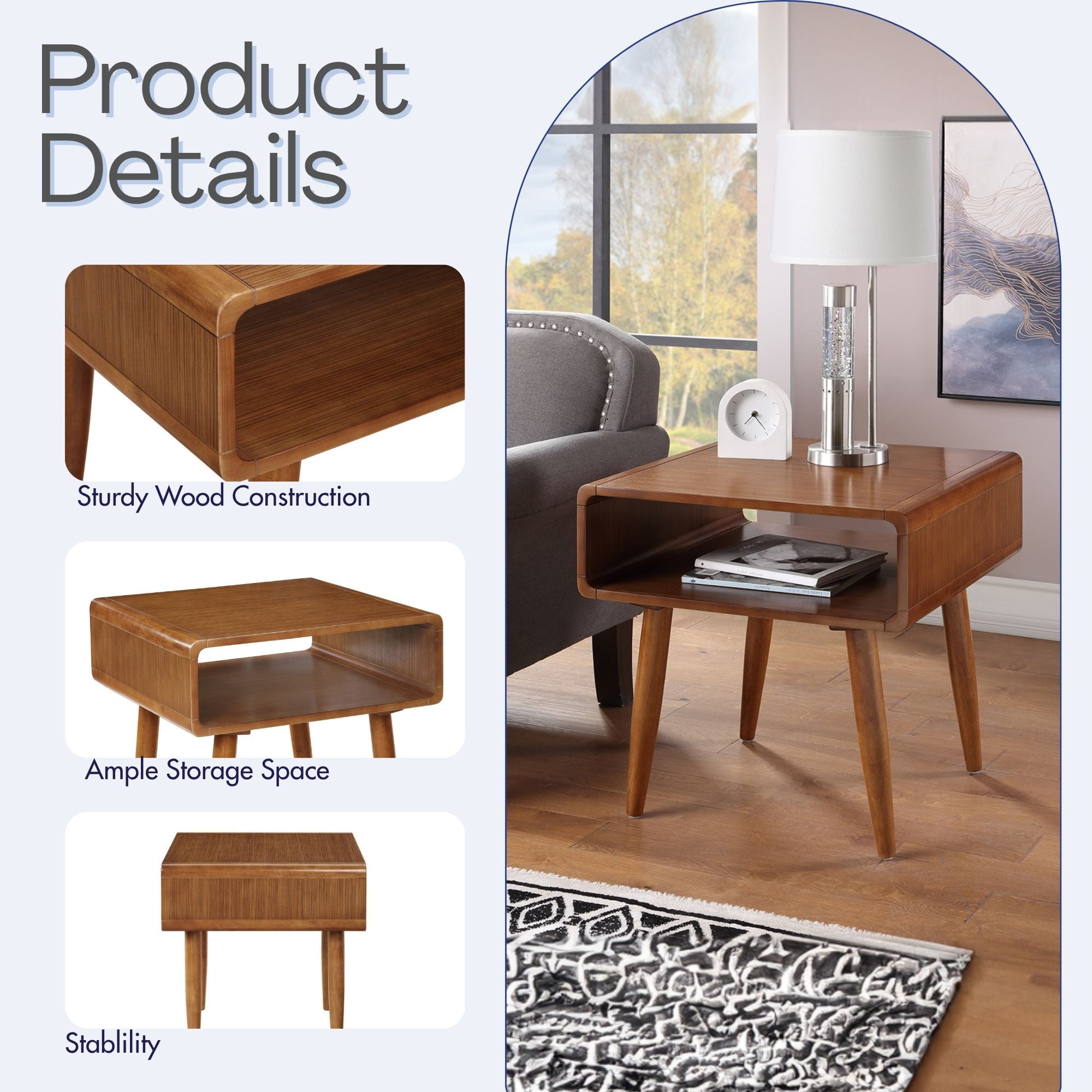 The Alborg End Table is a dream combination of form and function that looks good, wherever you place it. A single open cubby provides convenient storage, whether you use this piece as an end table or a nightstand. Its mid-century design inspiration is evident in the gently rounded corner and tapered, jutting legs. Made from solid rubberwood, the end table is enhanced by exotic Zebrano veneers and a rich walnut finish. Features: Solid rubberwood construction Zebrano wood veneers in rich walnut finish Open cubby space for storage Pairs nicely with our Halmstad Coffee Table Tapered legs Specifications: Product Dimensions: 24″w x 24.5″h x 24″d Assembly Required: Yes Product Weight: 31 lbs. Commercial/Residential: Residential Use only