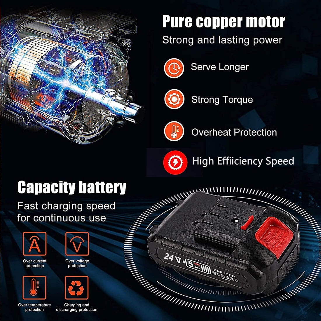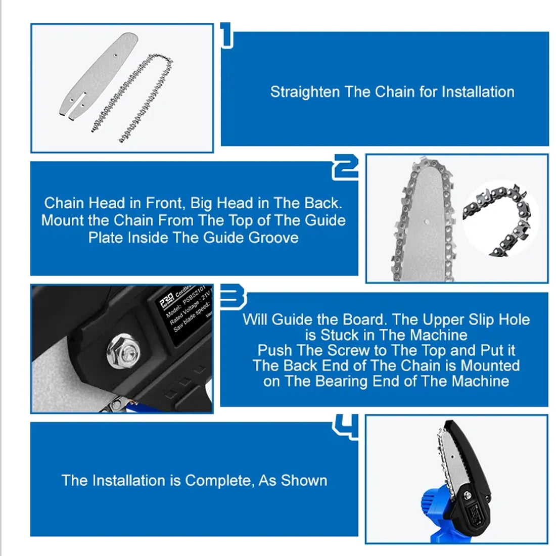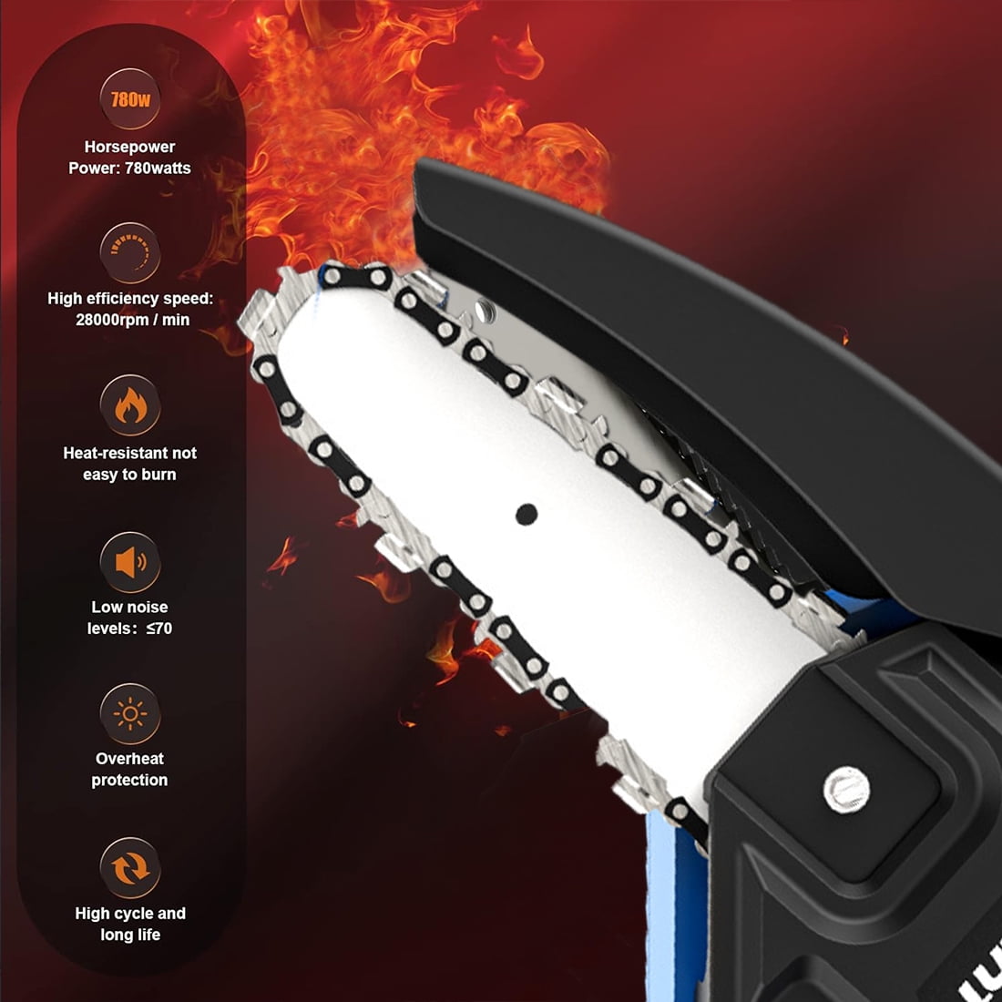 Specifications: Product Name: Cordless Mini Chainsaw Voltage: 24V Motor Power: 550W Motor Driven: Pure Copper Motor Battery Type: 2000mAh lithium-ion (2 packs) Body Weight: 2.5 lbs Cutting Size: 6 inch Chain speed: 6m/s (19.69ft/s) No-load speed: 28000r/min High Quality Chain Deep quenched 6-inch chain has high wear resistance, durability and high hardness, not easy to break, cut smooth and fast with minimum kickback. Anti-Splash Baffle This cordless chainsaw is designed with a 120° rotatable baffle, which can prevent splattering of wood chips. Pure Copper Motor More powerful motor, making the mini chainsaw cut faster and more efficiently. Fast Heat Dissipation Fast heat dissipation design, prevent the motor from overheating, ensure your cutting operation is fast and stable. Integrated Guide Plate Deep quenched and hardened 6-inch integrated guide plate, high wear resistance, fast heat dissipation and high cutting efficiency. Safety Lock You need to press the safety button and the switch at the same time to start this Battery Powered small chainsaw. Safer job by avoiding accidental startup. Ergonomic Design Grip This handheld Electric chainsaw is compact, one-handed, comfortable to hold, and can be used for a long time without tiring your hands.