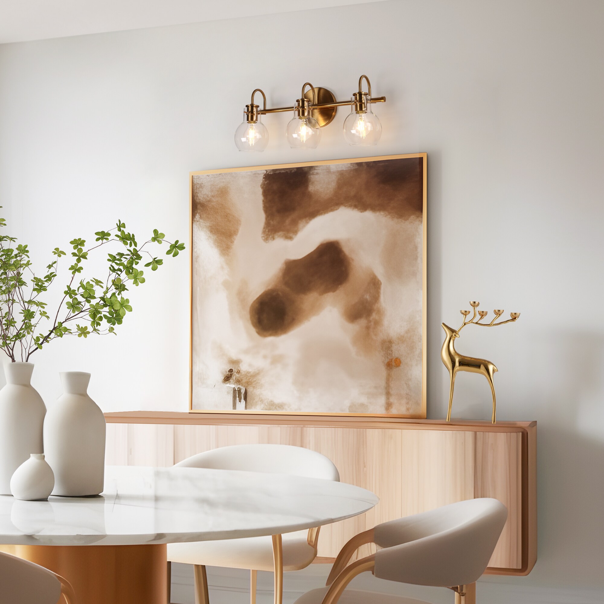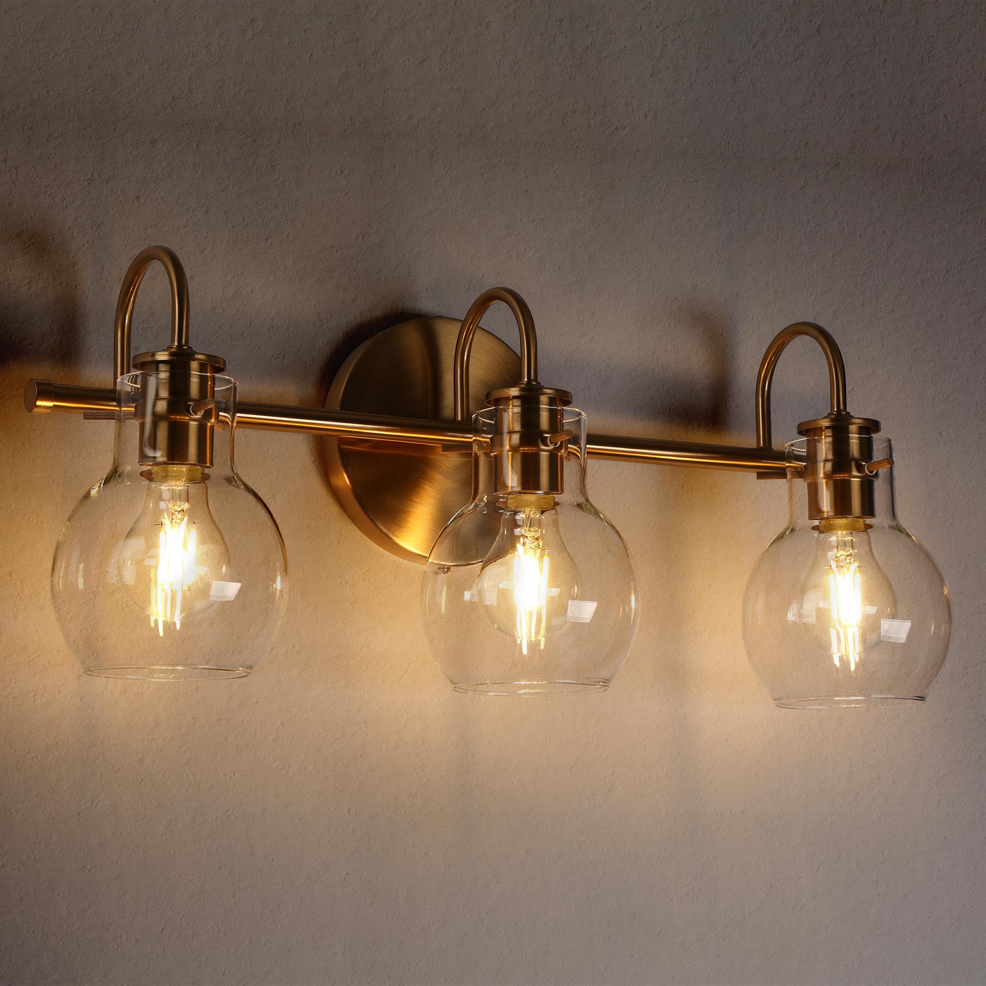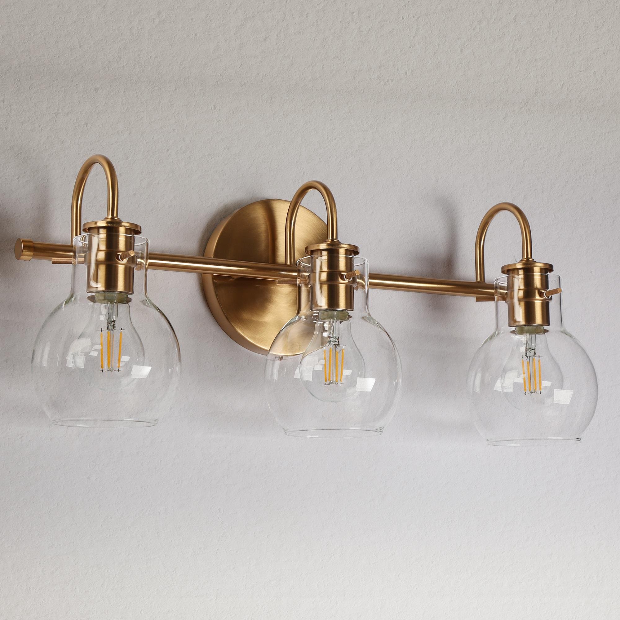 Elevate your bathroom or powder room with our 3-light polished gold vanity fixture. Crafted from high-forged metal with clear crystal kettle shades, it adds glamour and extra illumination. The curved, vine-like arm complements contemporary and classic spaces. Enjoy the soft glow of 60W bulbs (not included) and the convenience of a dimmer switch. Easy to install and exuding sophistication, this fixture creates a luxurious ambiance, making it a perfect centerpiece for your modern home.