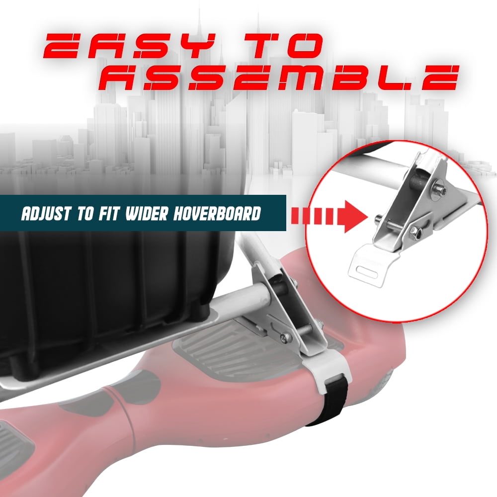 The hovercart design for Hoverboards. No more falling off your Hoverboard once you are sitting in a hoverkart. Hoverkart is a safer choice than just standing on a Hoverboard, especially for younger kids or those with poor balance. COMFORTABLE & ADJUSTABLE: Adjustable foot pedals. t is sturdy and in simplistic design. Easy to install and to use it. To press the rods forward is to move forward, pull the rods back is to go back. Only press one side or pull the other side is turn, you will learn how to play once you sit on it.
